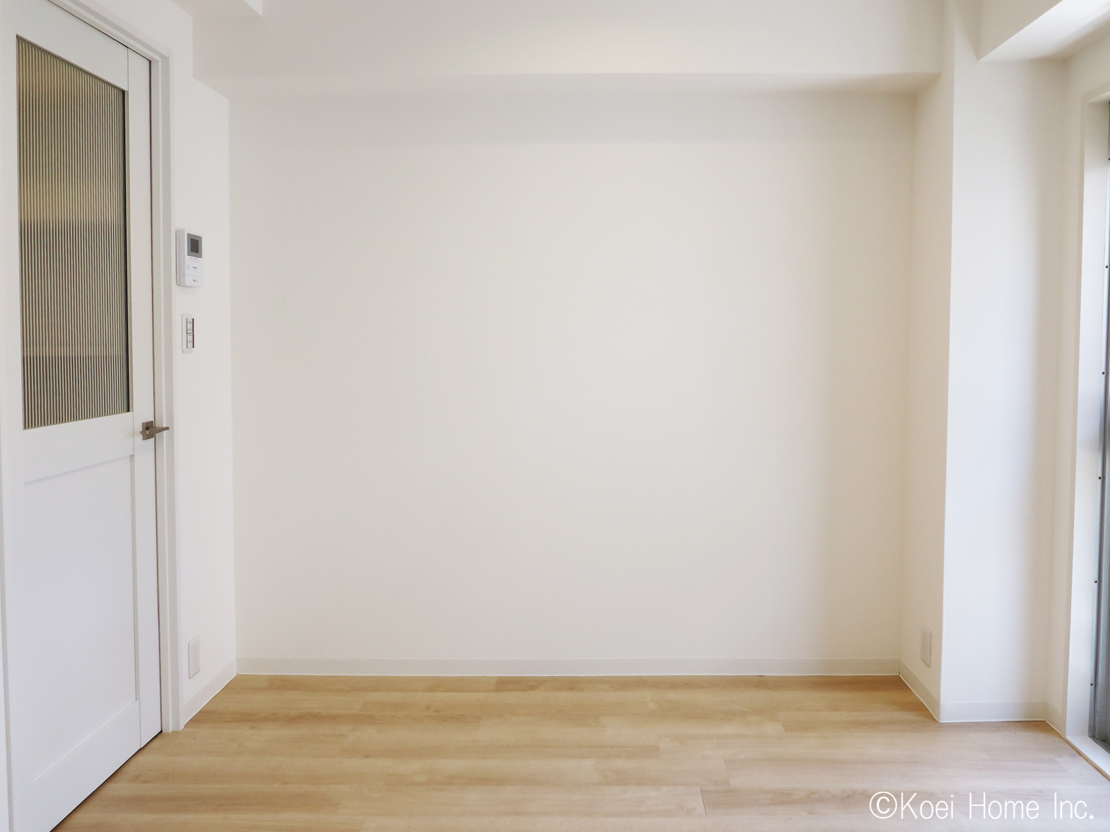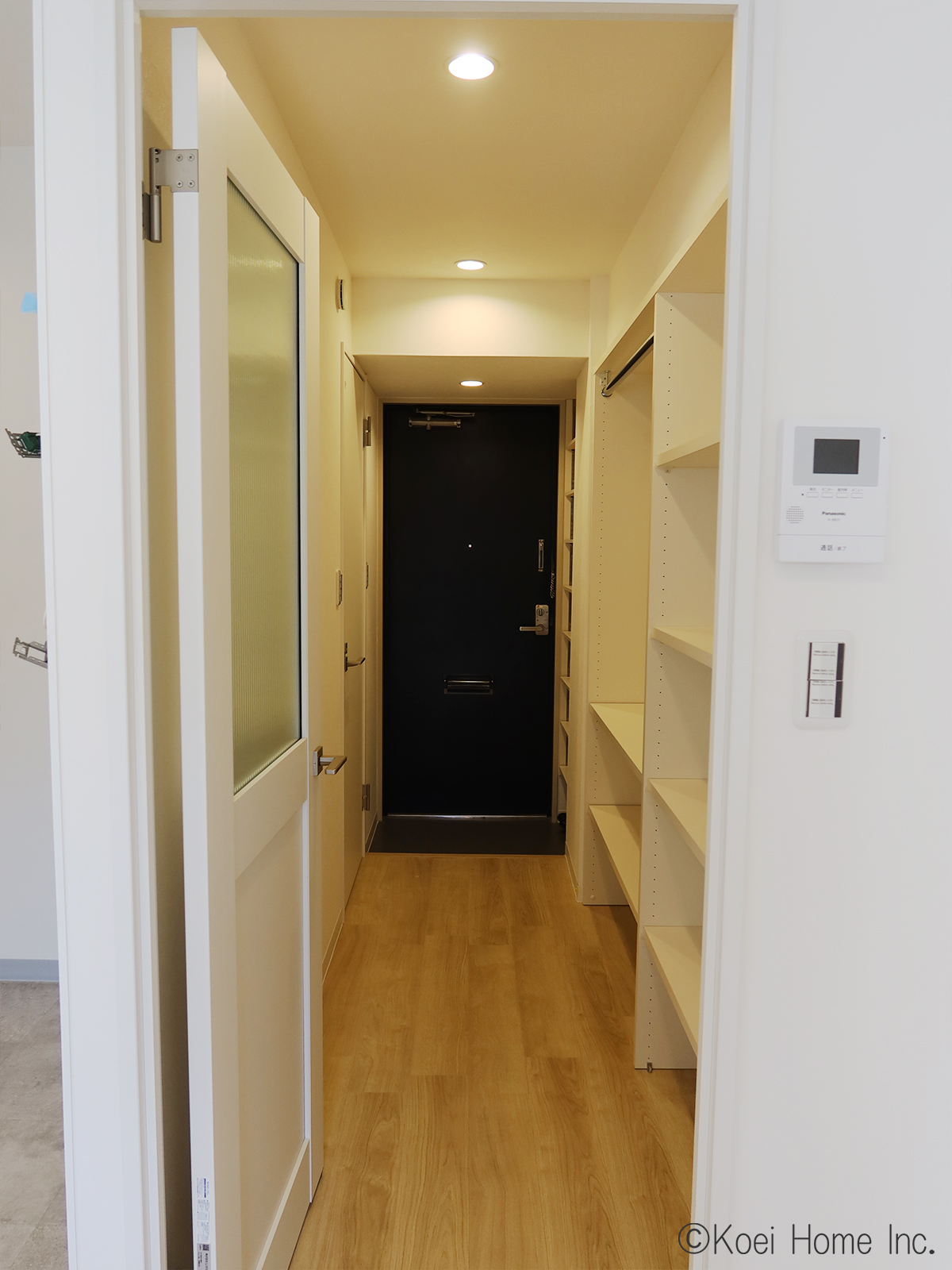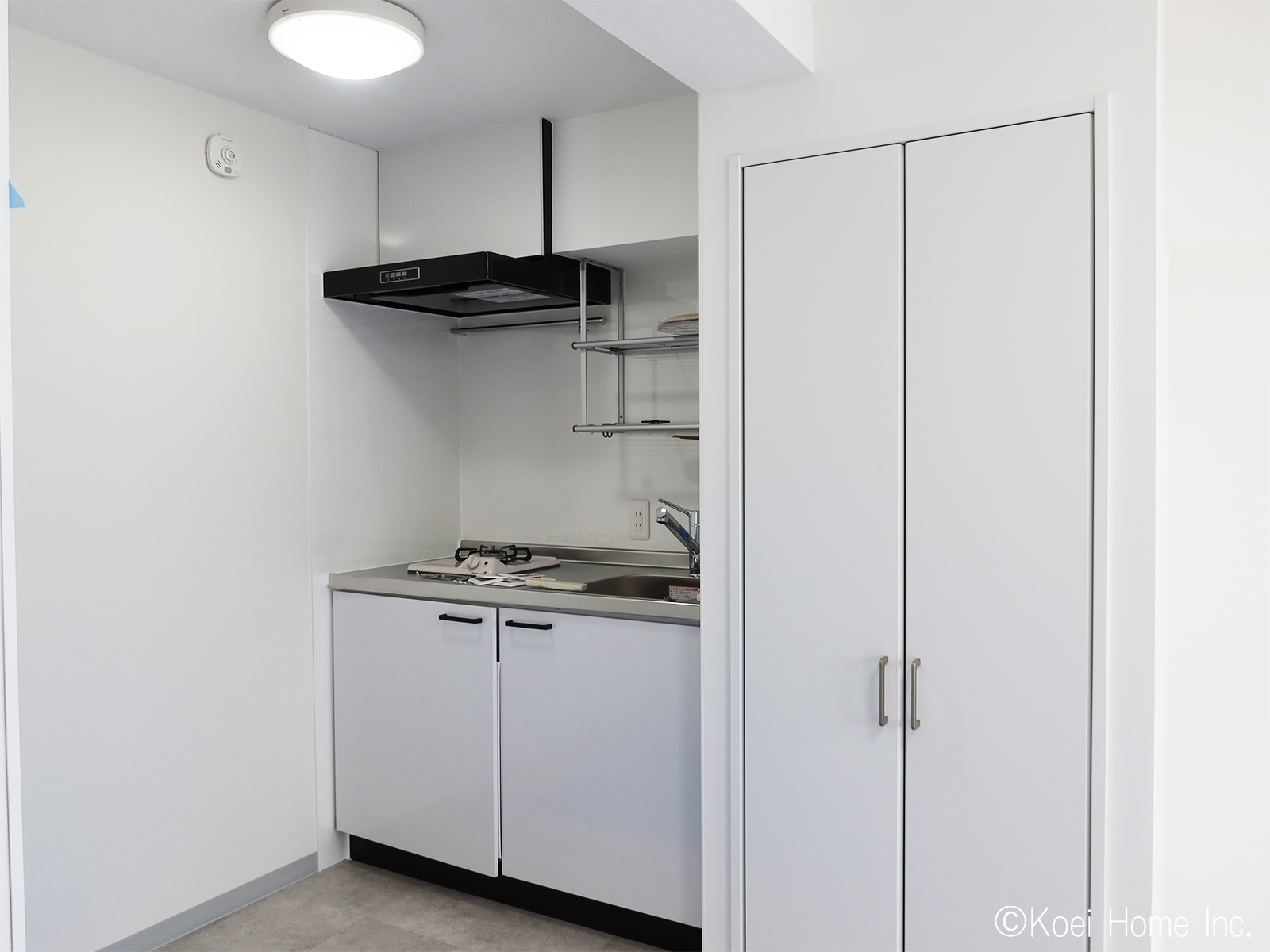 賃貸アパートの1Kを、暮らしやすさを最優先にフルリフォーム。広かったキッチンスペースはコンパクトに再編し、捻出した面積で3点ユニットを解消。トイレは個室化、向かいに独立洗面台を新設し、上部には収納も確保しました。居室はワンルーム化で広がりを生み、コンセントは壁3面に配置してレイアウト自由度を向上。廊下の壁一面には可動棚を設け、収納力と見通しを両立。玄関・廊下まわりも明るく整え、ひとり暮らしはもちろん事務所利用にも対応できる“使い勝手のいい一室”へ。立地の良さを、間取りの更新で価値に変えた改修です。