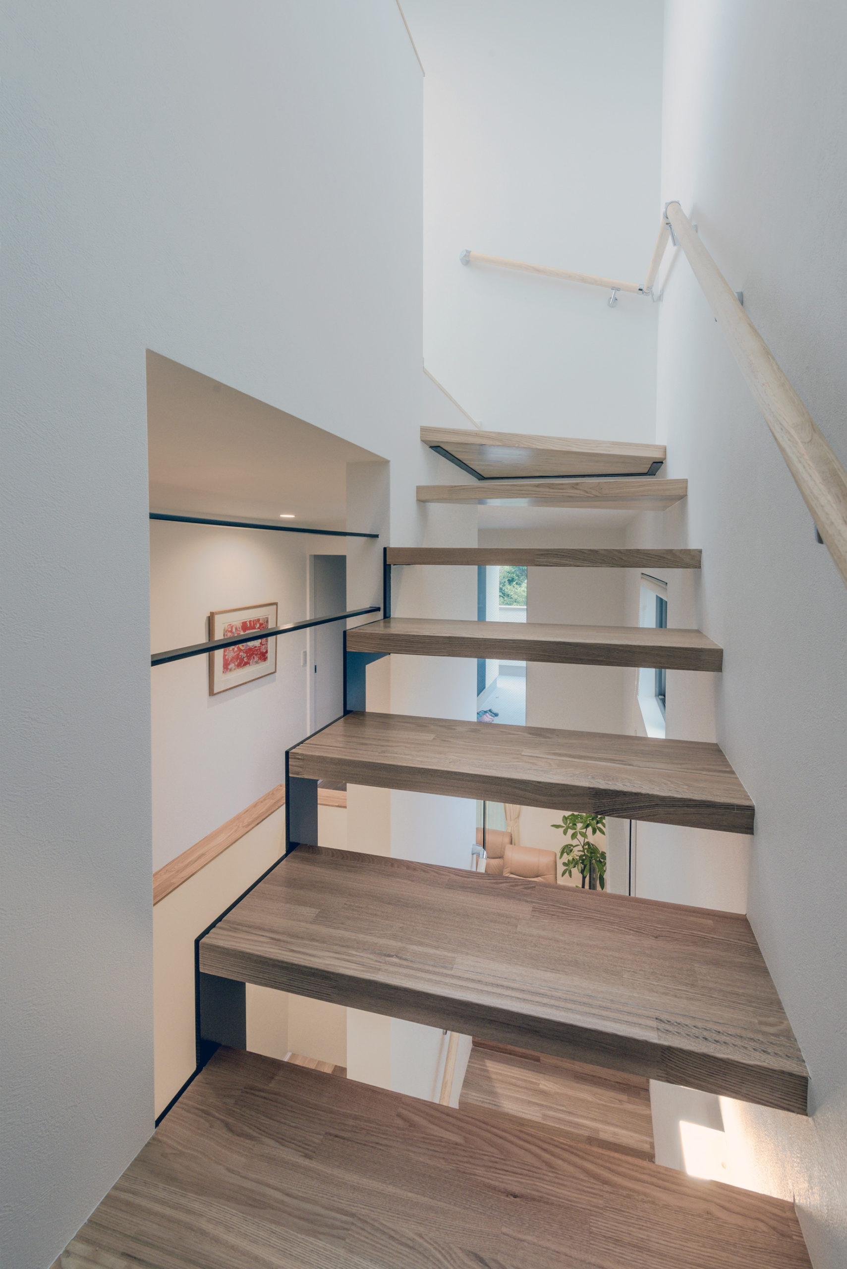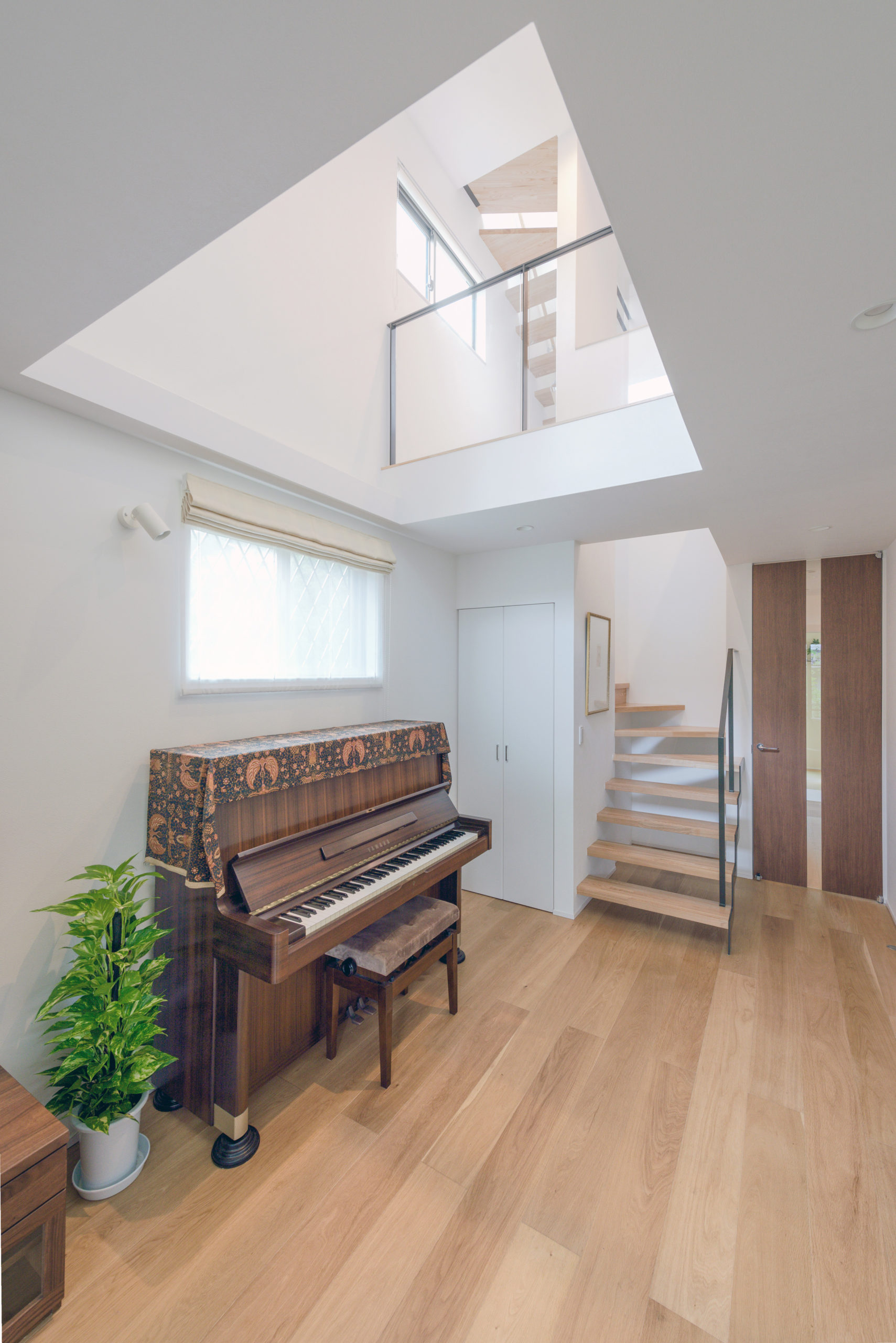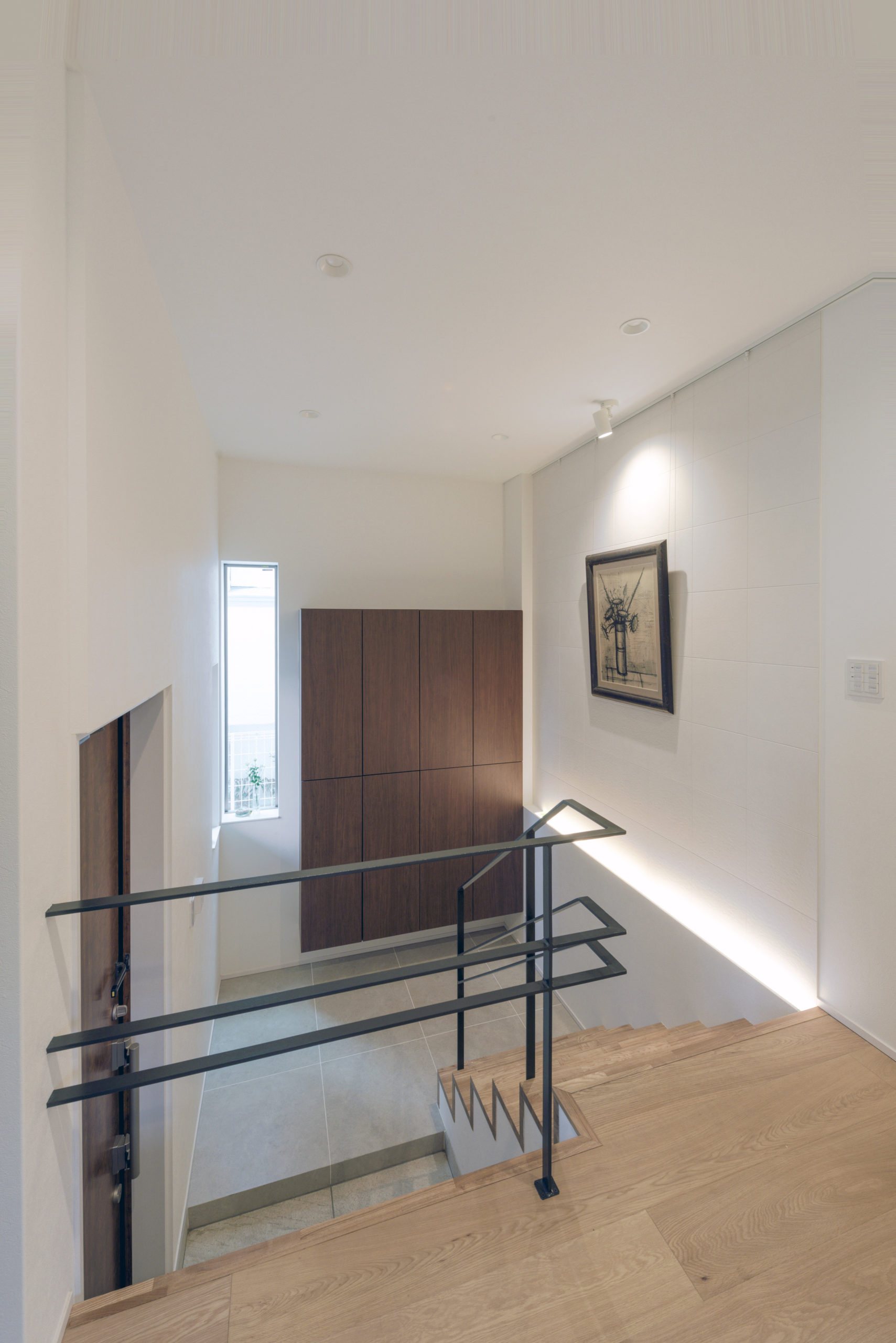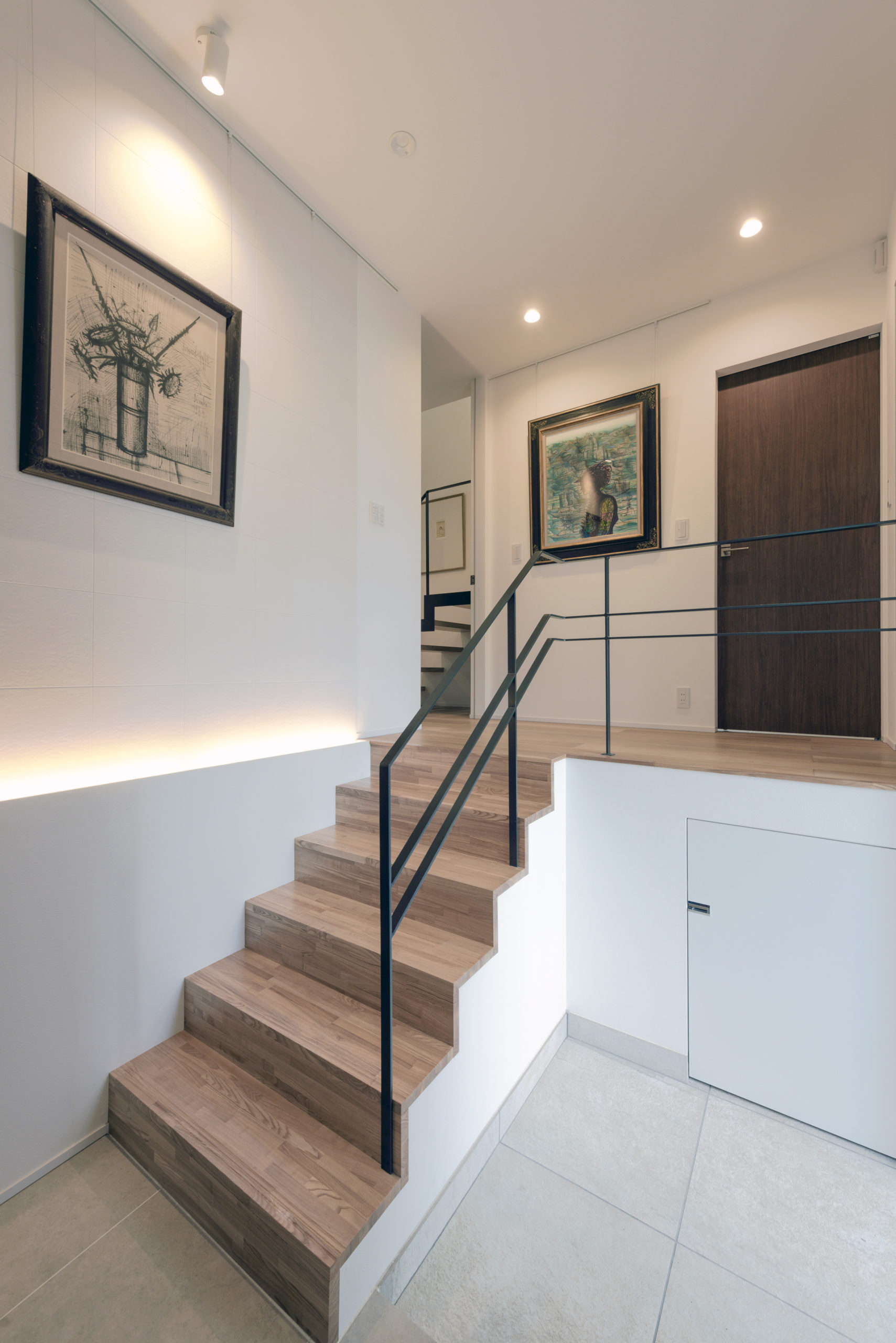 「蒐集した絵画を主役にする」という要望から出発。道路との高低差を活かし、玄関をあえて下げて“ギャラリー動線”を計画しました。天井高の玄関ホールに石目調の大判タイル、スポット+間接照明で作品を引き立て、シースルー階段をのぼると吹抜のリビングへ。ガラス手摺が光を反射し、家全体に明るさを循環させます。和モダンの畳室は手持ち家具と調和。キッチン裏の広いパントリーや来客用レストルーム、輸入建材の洗面など、使い勝手も両立。暮らしとアートが共存する住まいです。