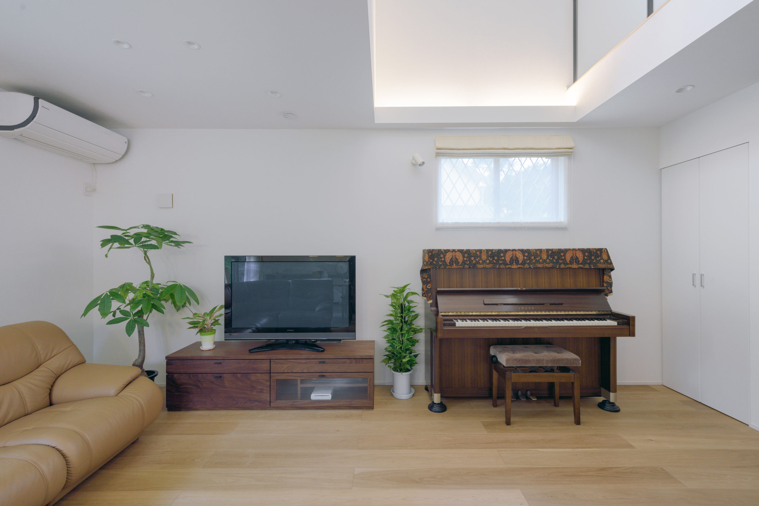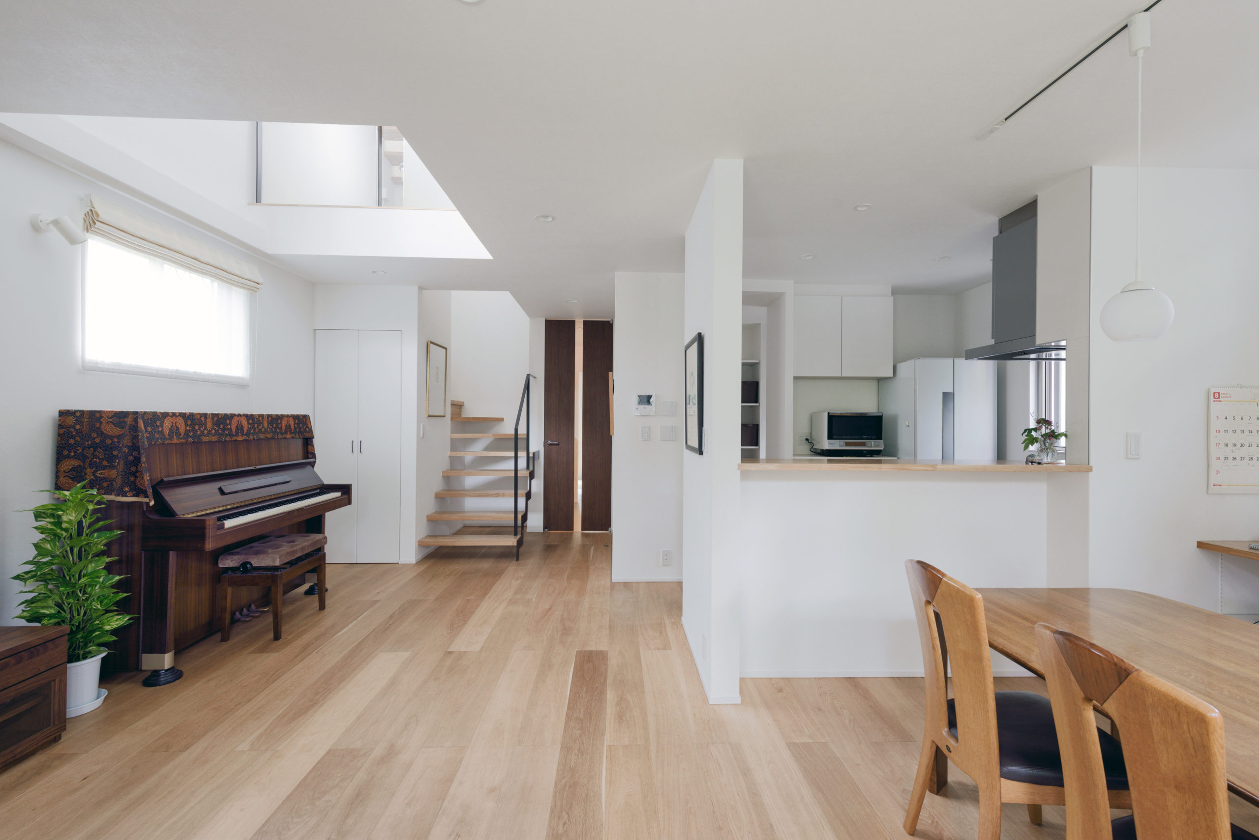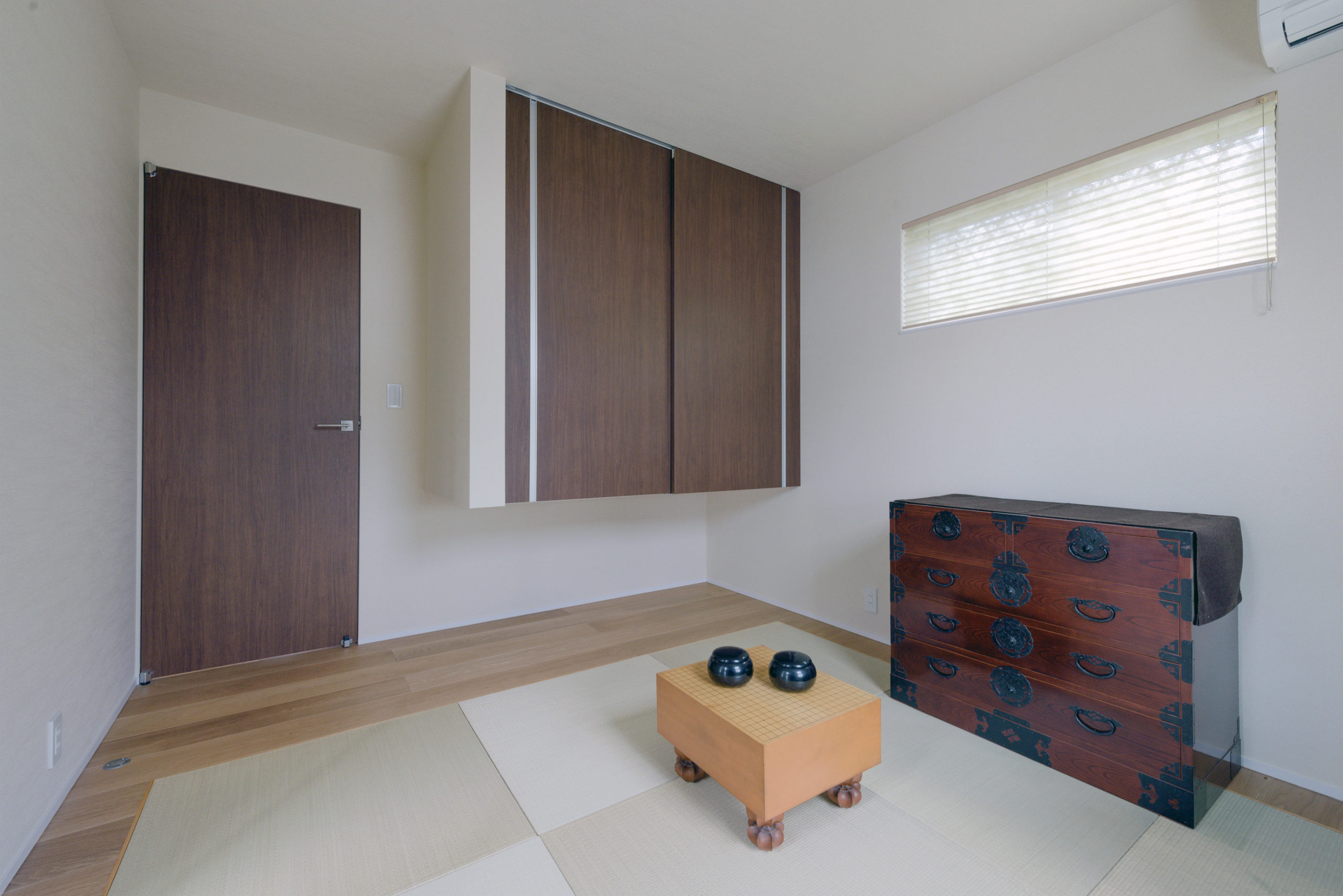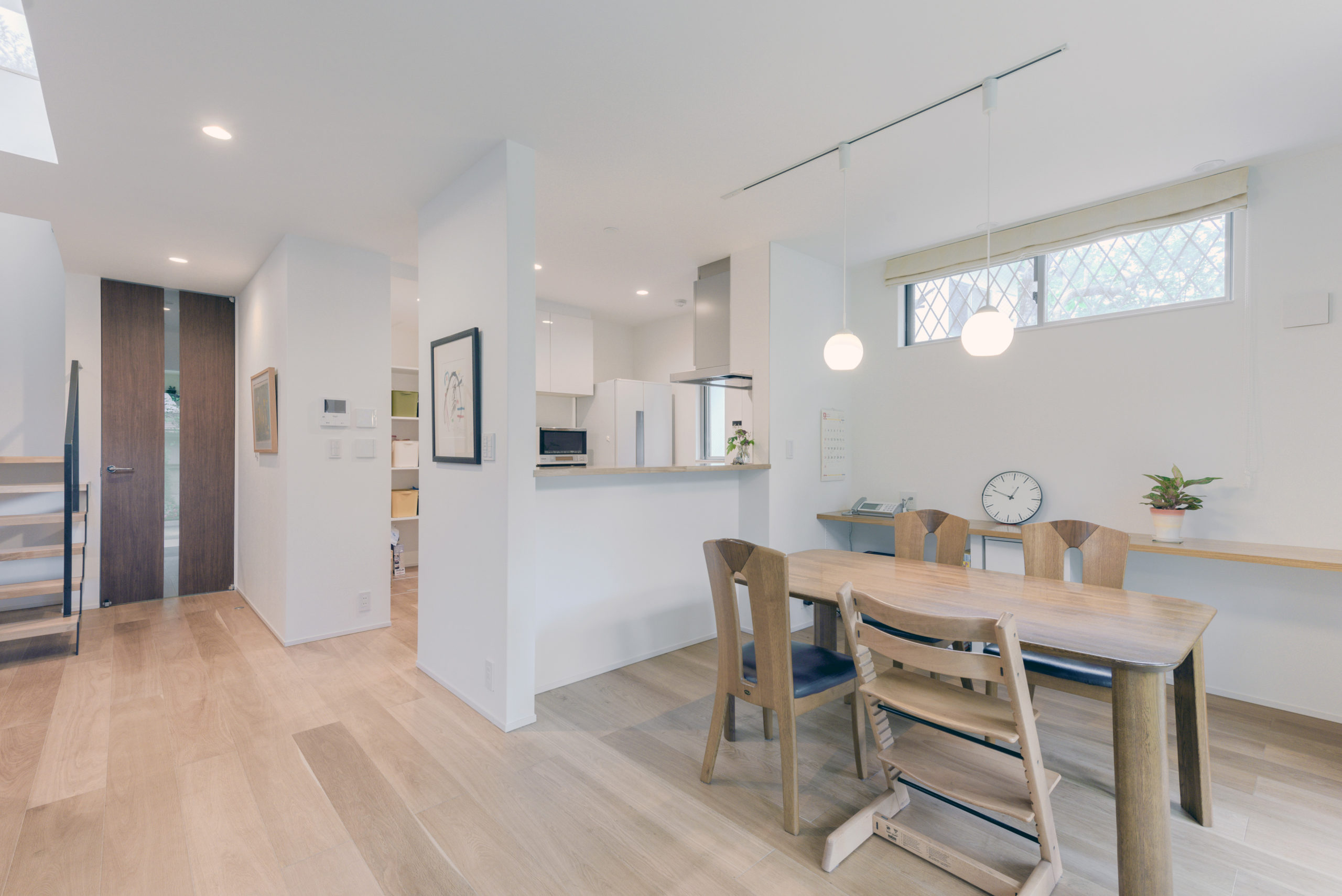 「蒐集した絵画を主役にする」という要望から出発。道路との高低差を活かし、玄関をあえて下げて“ギャラリー動線”を計画しました。天井高の玄関ホールに石目調の大判タイル、スポット+間接照明で作品を引き立て、シースルー階段をのぼると吹抜のリビングへ。ガラス手摺が光を反射し、家全体に明るさを循環させます。和モダンの畳室は手持ち家具と調和。キッチン裏の広いパントリーや来客用レストルーム、輸入建材の洗面など、使い勝手も両立。暮らしとアートが共存する住まいです。