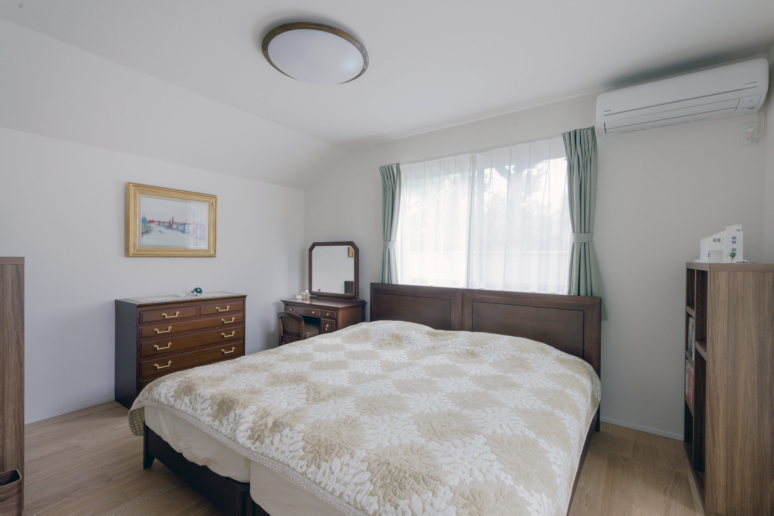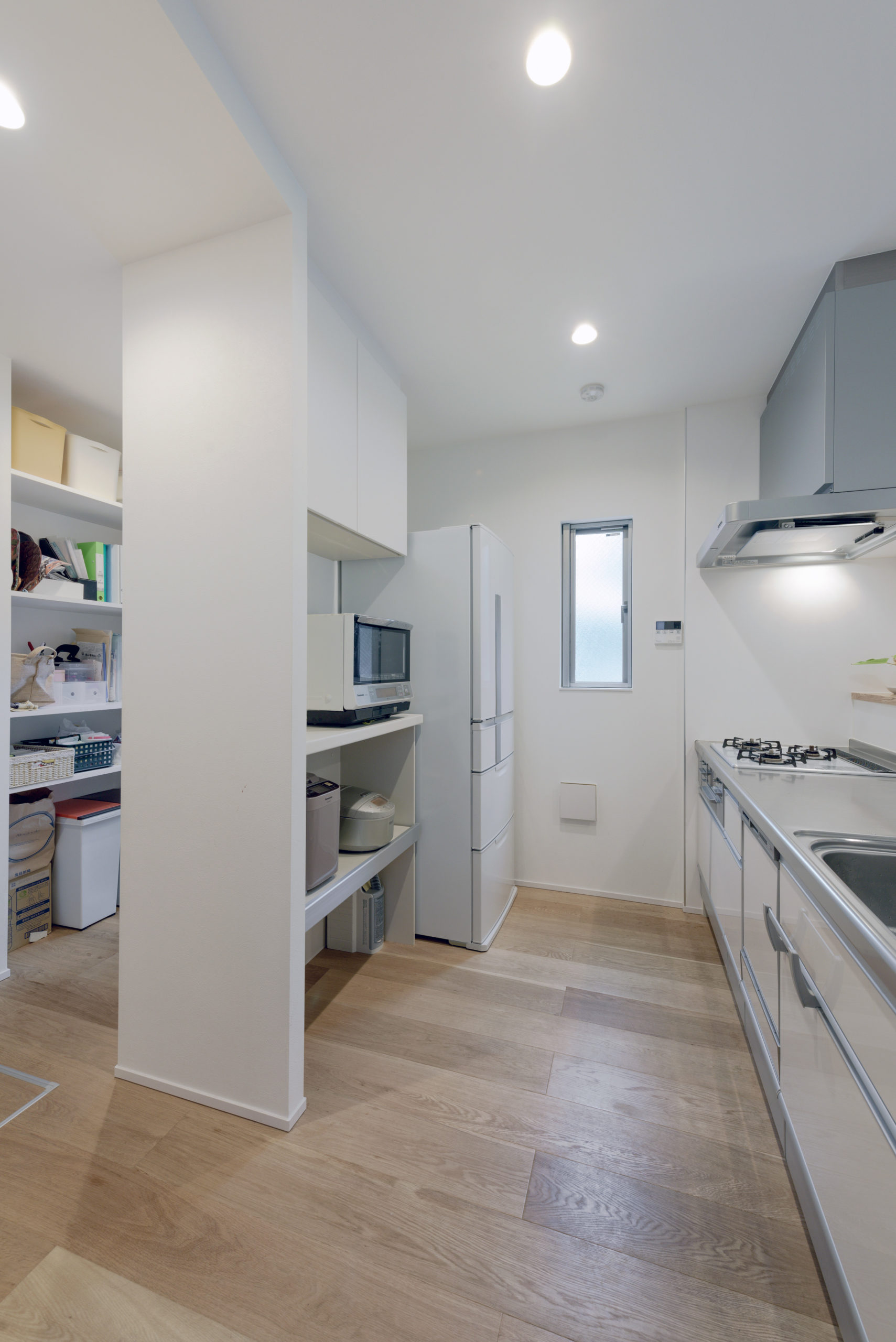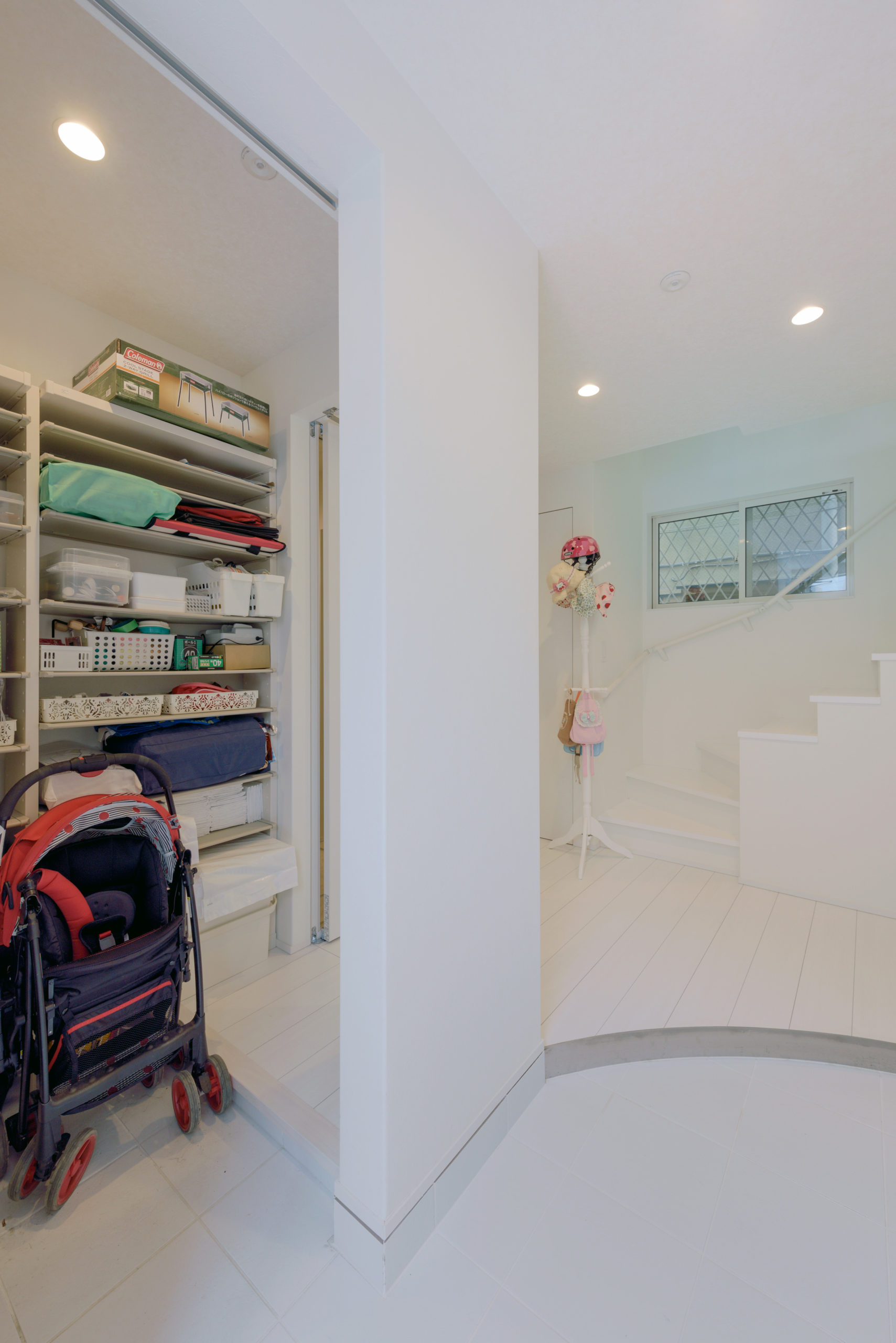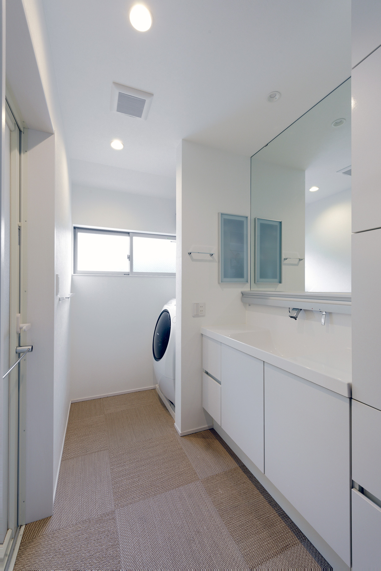 「蒐集した絵画を主役にする」という要望から出発。道路との高低差を活かし、玄関をあえて下げて“ギャラリー動線”を計画しました。天井高の玄関ホールに石目調の大判タイル、スポット+間接照明で作品を引き立て、シースルー階段をのぼると吹抜のリビングへ。ガラス手摺が光を反射し、家全体に明るさを循環させます。和モダンの畳室は手持ち家具と調和。キッチン裏の広いパントリーや来客用レストルーム、輸入建材の洗面など、使い勝手も両立。暮らしとアートが共存する住まいです。