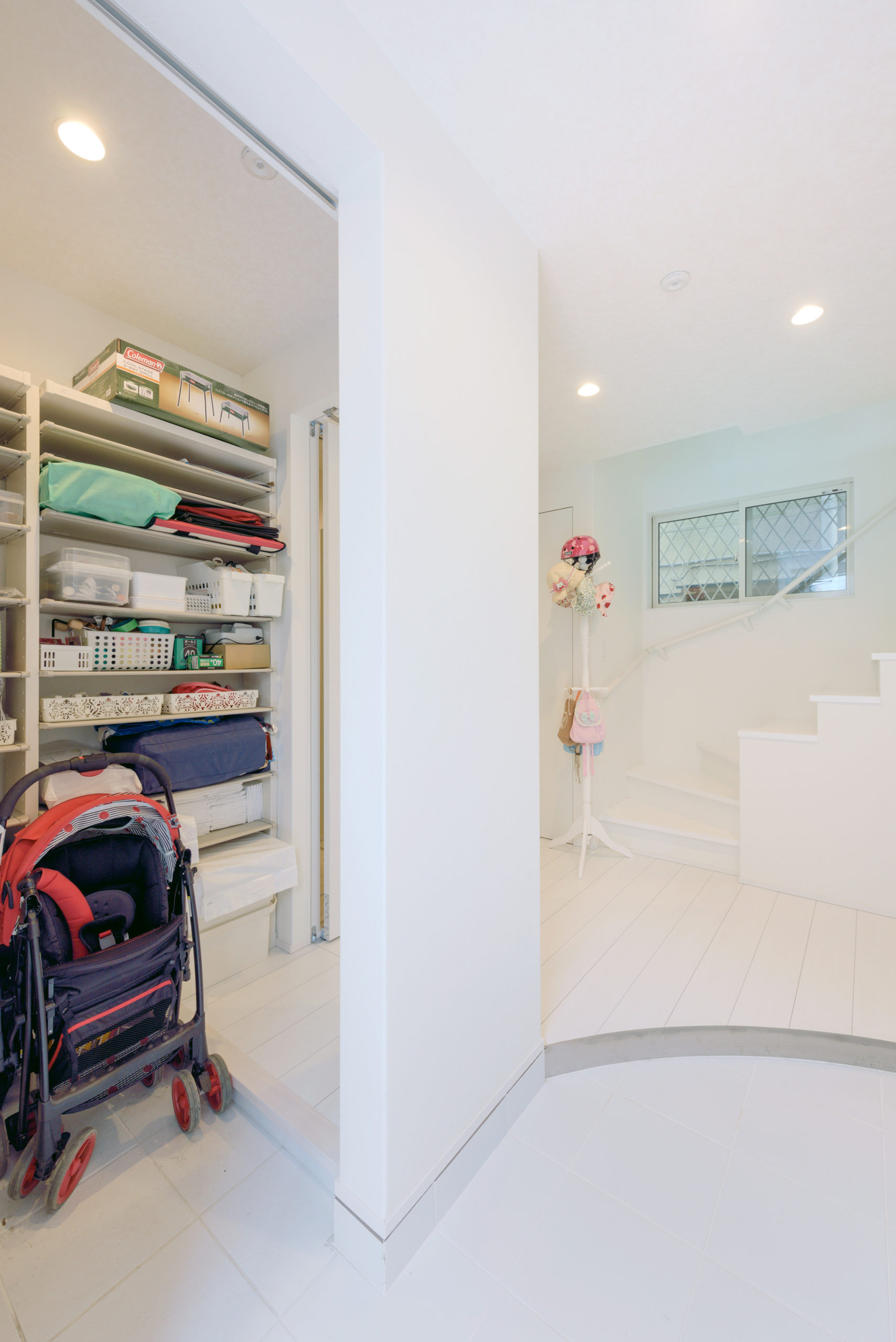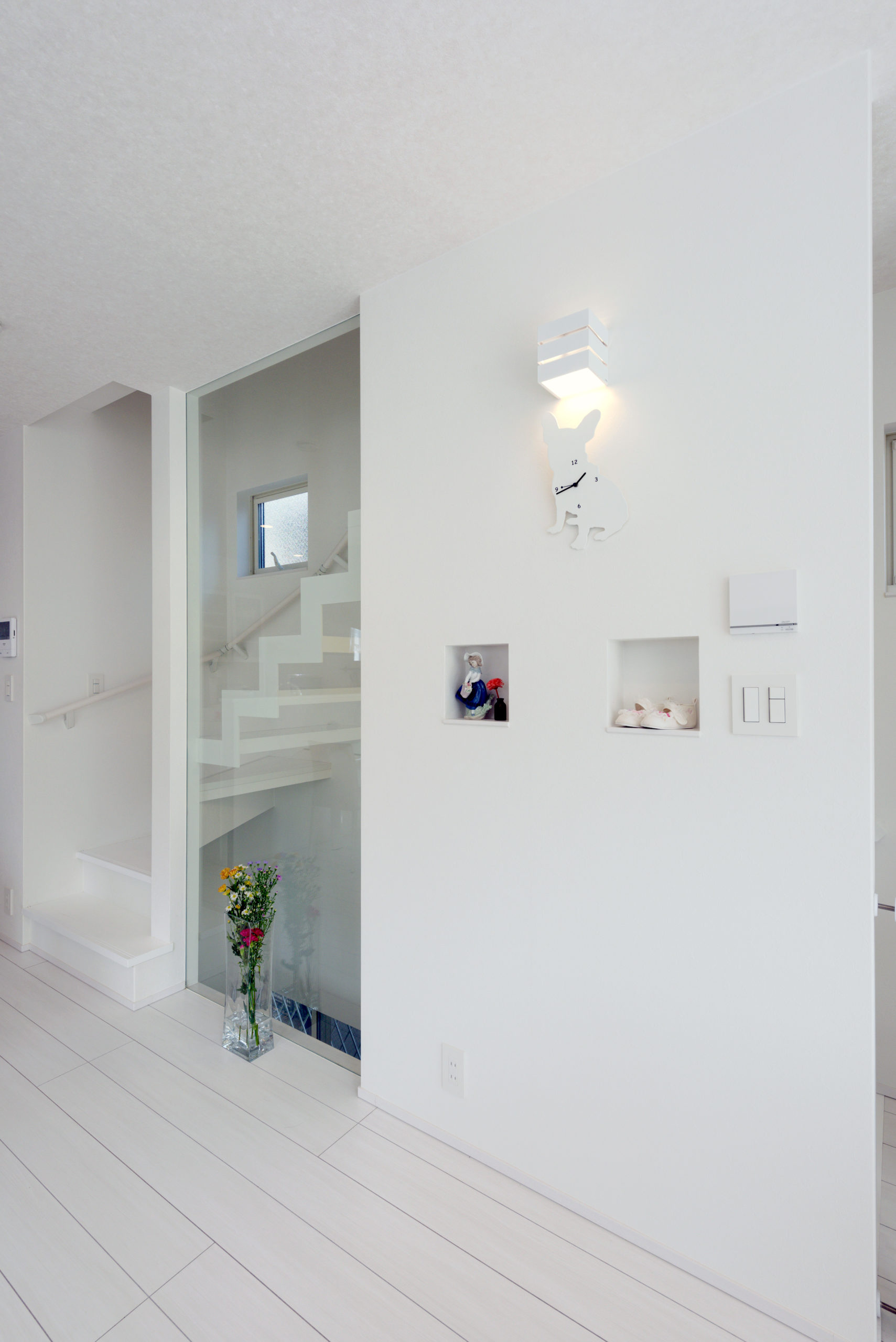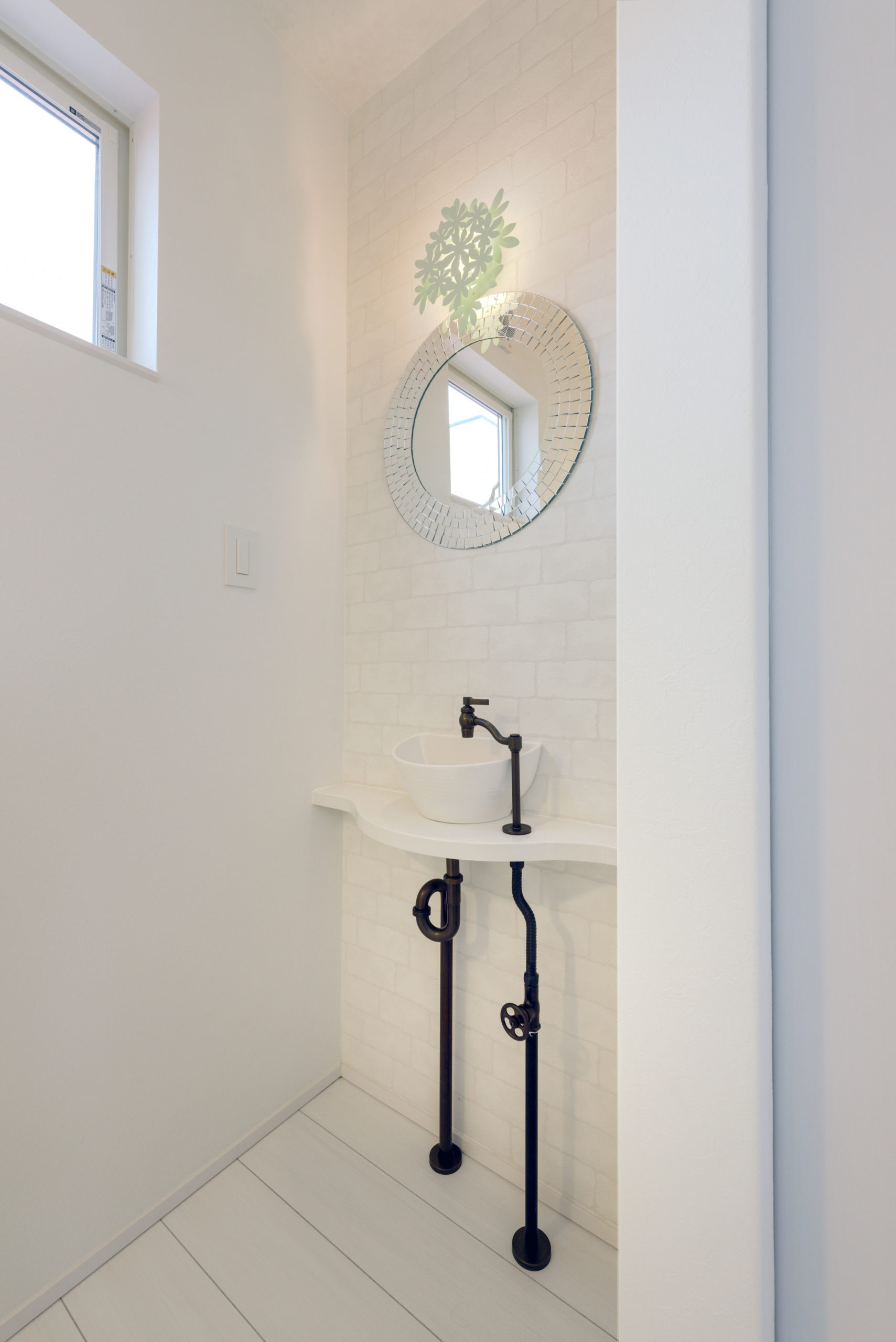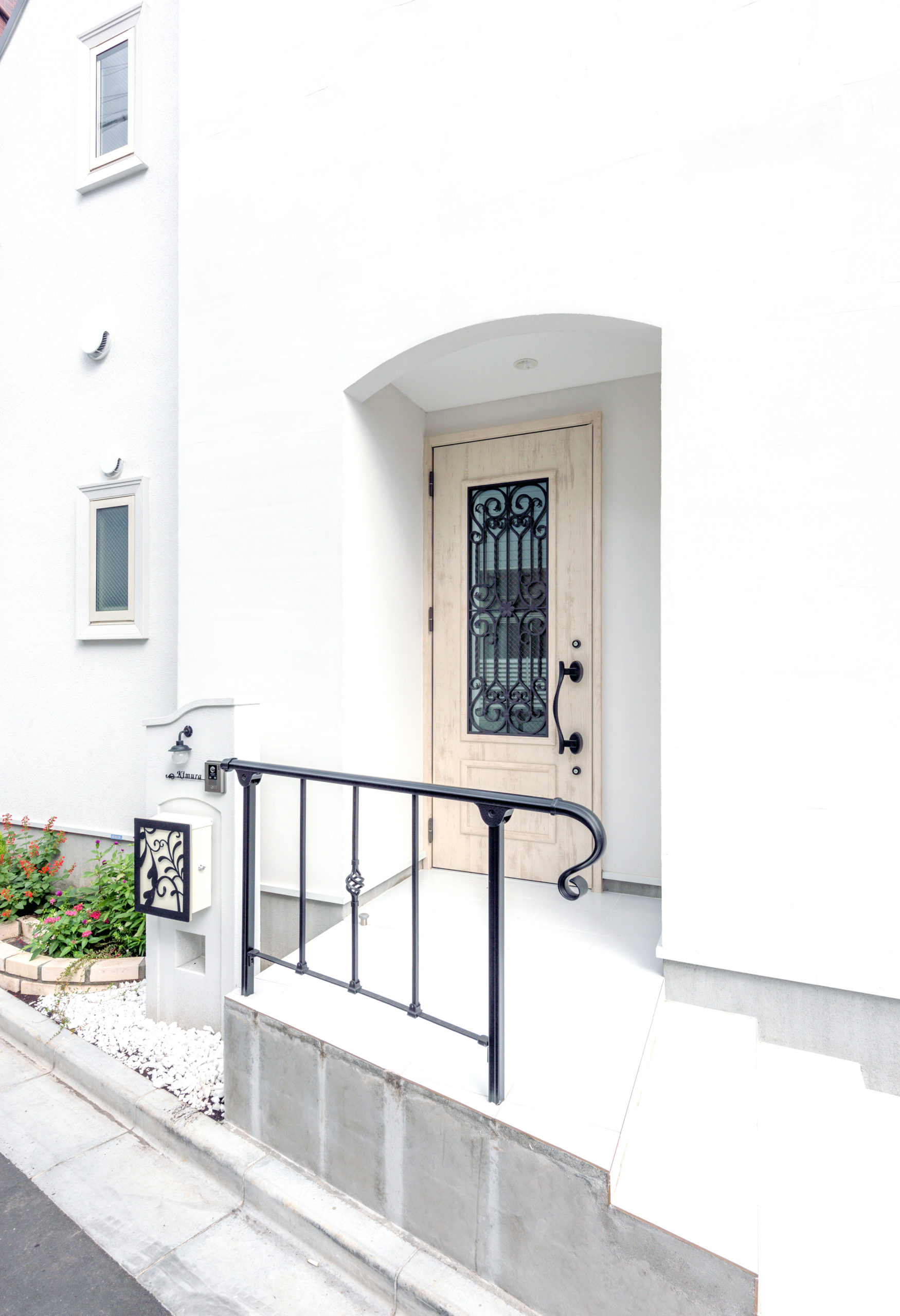外観・アプローチから洗面台まで、レトロアイアンの意匠が冴える白亜の住まい。玄関扉の装飾越しに光が差し込み、室内は白を基調にアクセントカラーで表情をつけました。リビングまで続く明るさと、花柄で整えた寝室の落ち着き。玄関脇にはベビーカーも収まる家族導線側収納とシューズボックスを計画。脱衣室と浴室は段差を抑えてフラットに繋げ、日常の移動をやさしく。外構はアイアンの玄関意匠に呼応し、カーポート屋根を緩やかなカーブでデザイン。洗面はアイアンの水栓で空間を引き締め、まるで小さな城のような迎えをつくりました。素材と光で、清潔感と可憐さが両立する一邸です。玄関の陰影も一日の移ろいを静かに映します。暮らしの所作が整う設計です。