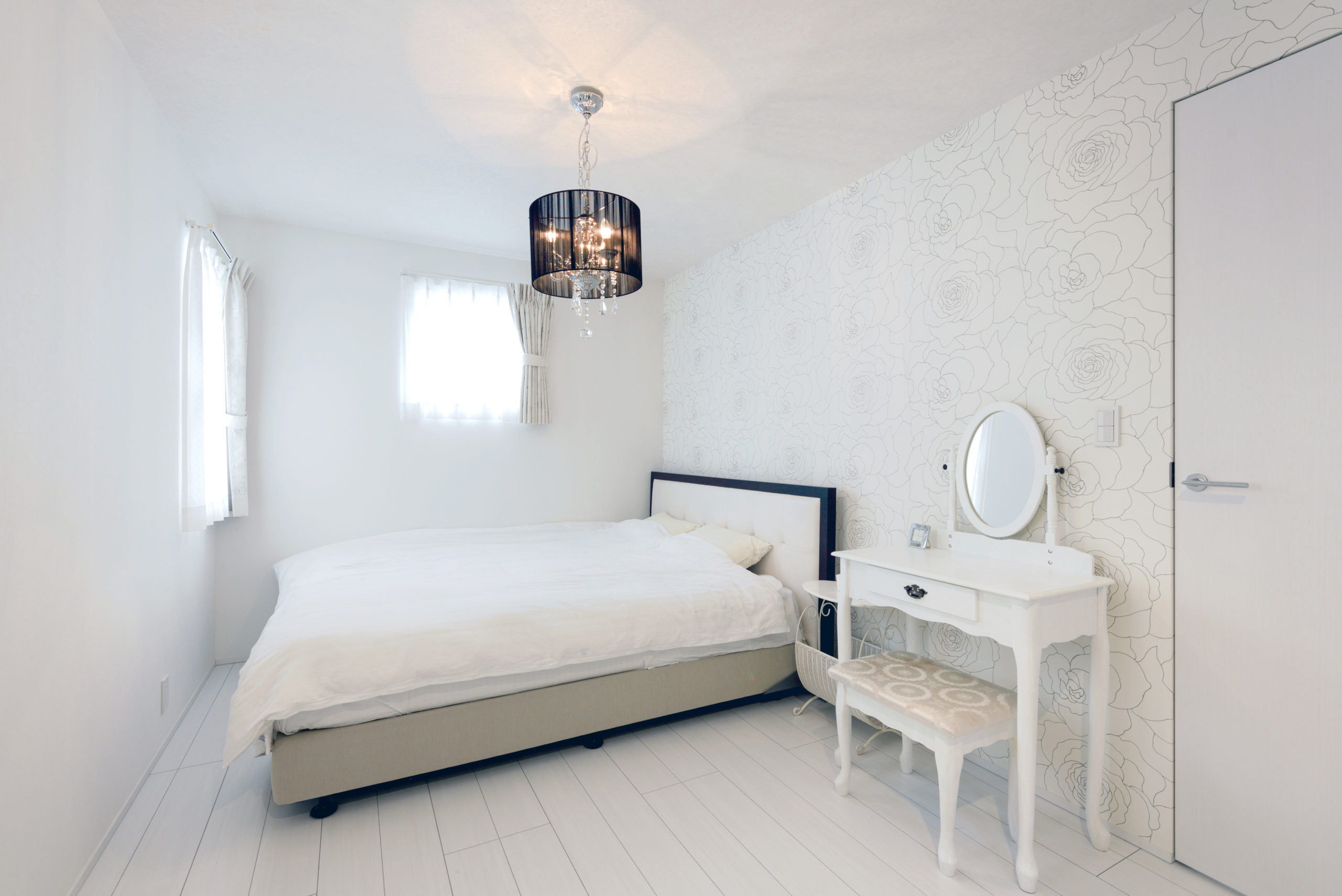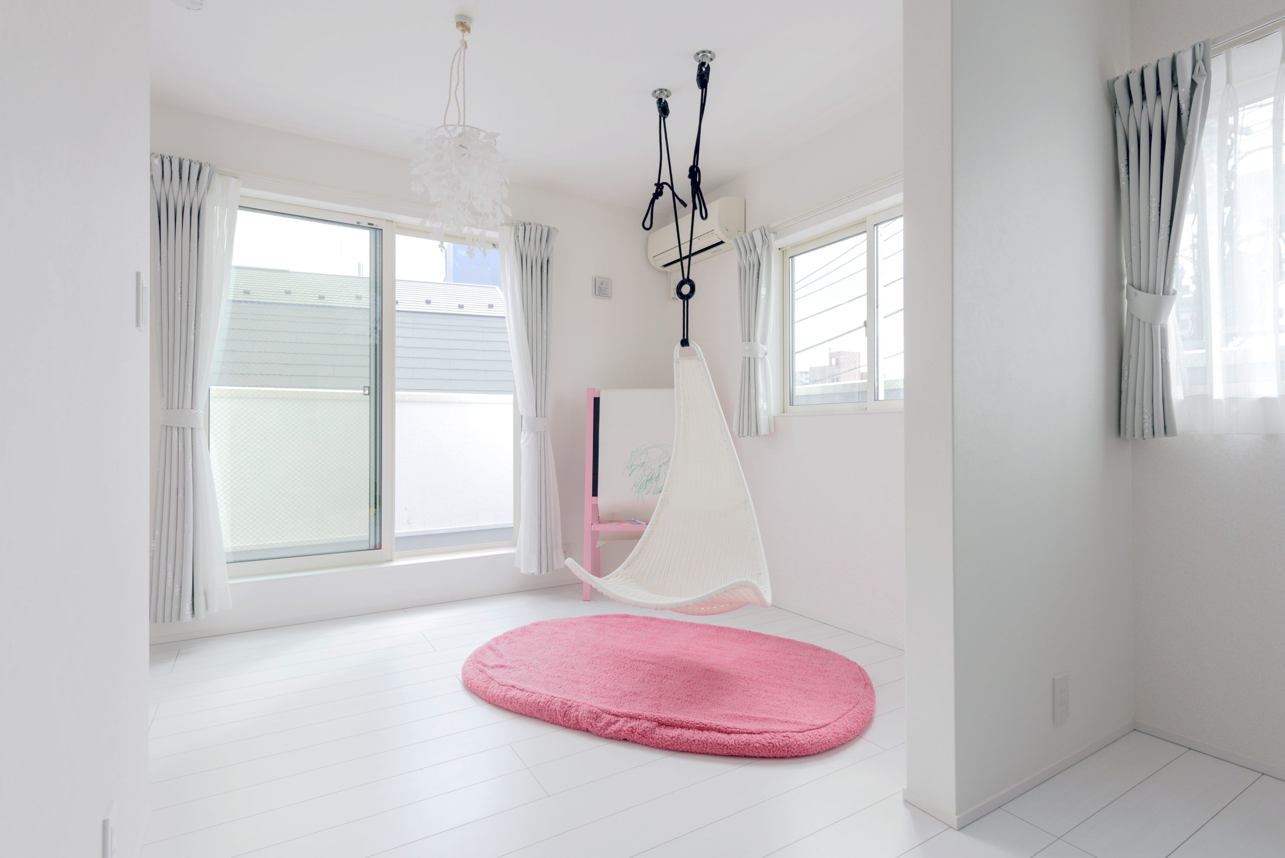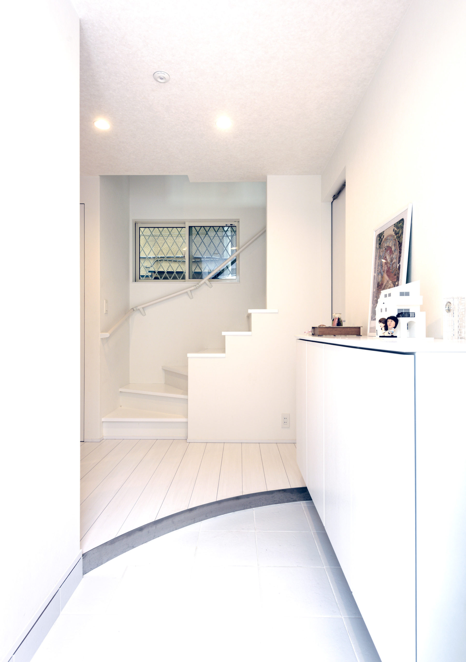 外観・アプローチから洗面台まで、レトロアイアンの意匠が冴える白亜の住まい。玄関扉の装飾越しに光が差し込み、室内は白を基調にアクセントカラーで表情をつけました。リビングまで続く明るさと、花柄で整えた寝室の落ち着き。玄関脇にはベビーカーも収まる家族導線側収納とシューズボックスを計画。脱衣室と浴室は段差を抑えてフラットに繋げ、日常の移動をやさしく。外構はアイアンの玄関意匠に呼応し、カーポート屋根を緩やかなカーブでデザイン。洗面はアイアンの水栓で空間を引き締め、まるで小さな城のような迎えをつくりました。素材と光で、清潔感と可憐さが両立する一邸です。玄関の陰影も一日の移ろいを静かに映します。暮らしの所作が整う設計です。