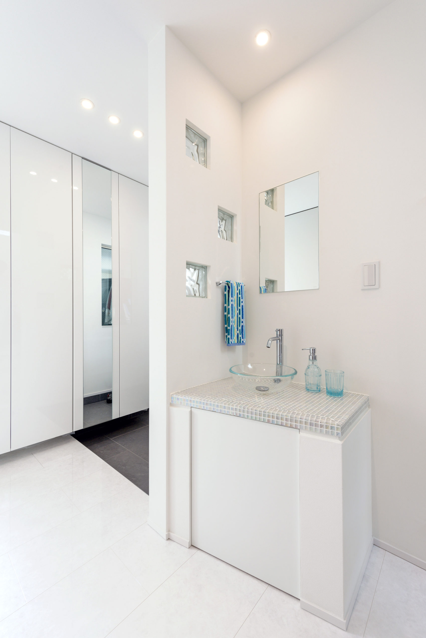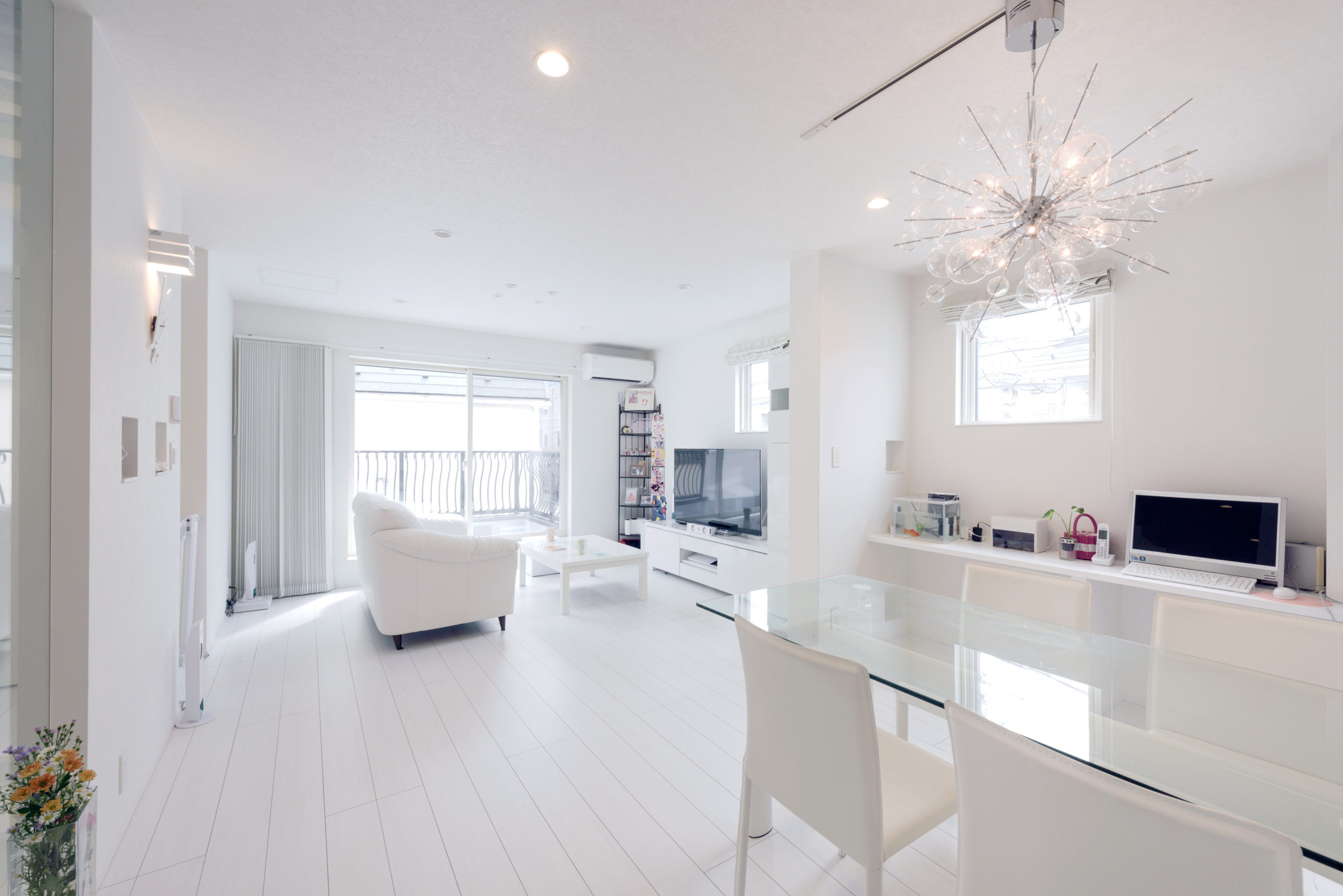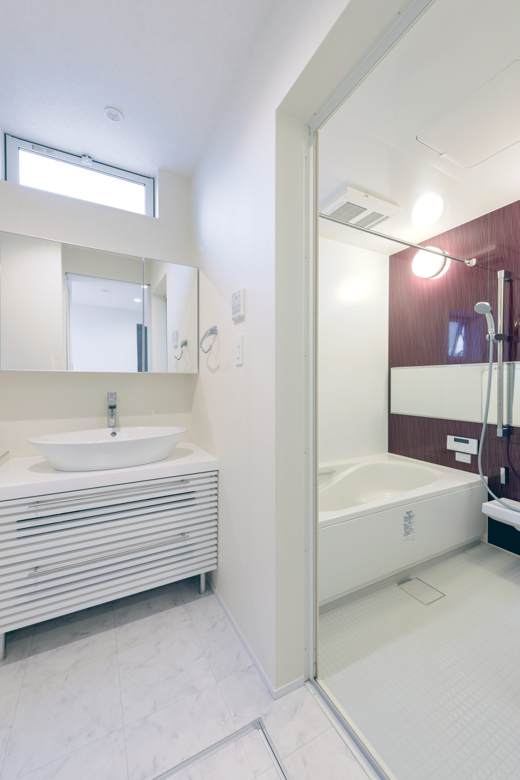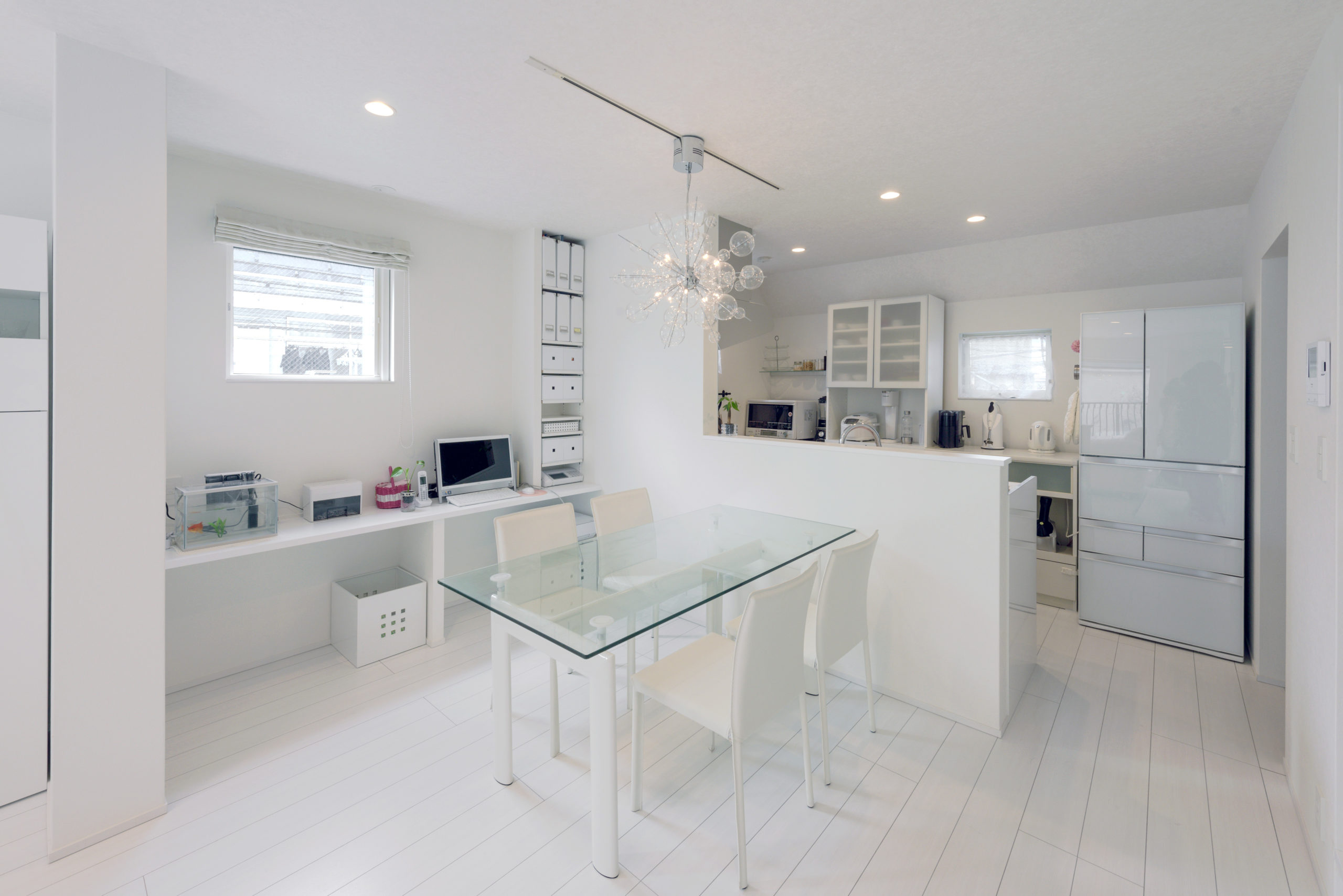 外観・アプローチから洗面台まで、レトロアイアンの意匠が冴える白亜の住まい。玄関扉の装飾越しに光が差し込み、室内は白を基調にアクセントカラーで表情をつけました。リビングまで続く明るさと、花柄で整えた寝室の落ち着き。玄関脇にはベビーカーも収まる家族導線側収納とシューズボックスを計画。脱衣室と浴室は段差を抑えてフラットに繋げ、日常の移動をやさしく。外構はアイアンの玄関意匠に呼応し、カーポート屋根を緩やかなカーブでデザイン。洗面はアイアンの水栓で空間を引き締め、まるで小さな城のような迎えをつくりました。素材と光で、清潔感と可憐さが両立する一邸です。玄関の陰影も一日の移ろいを静かに映します。暮らしの所作が整う設計です。