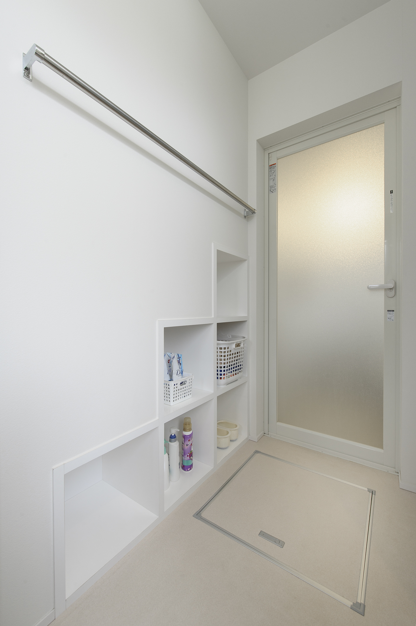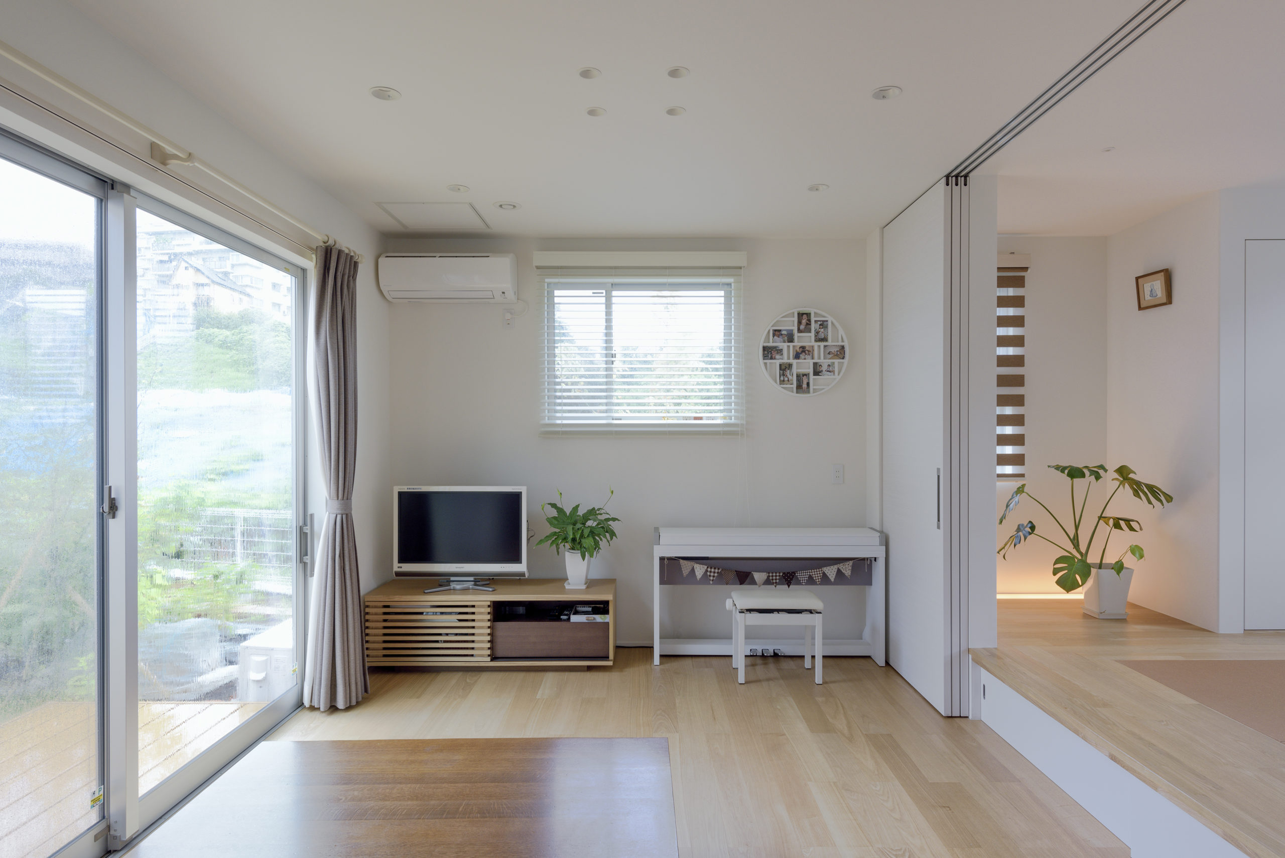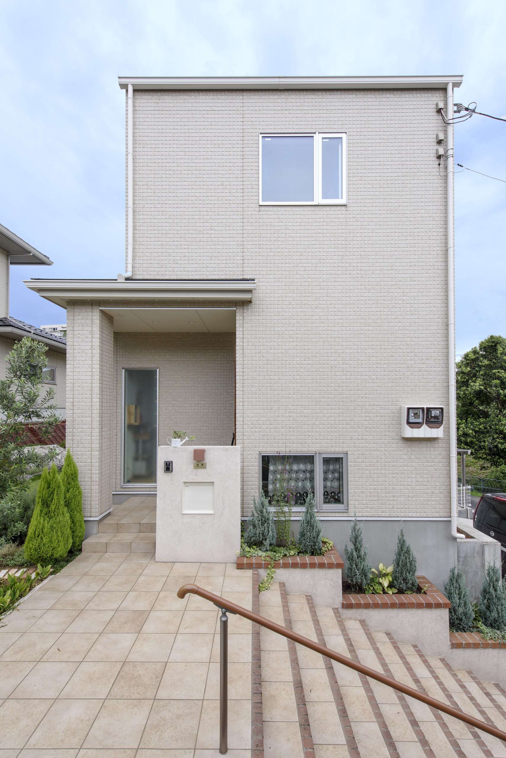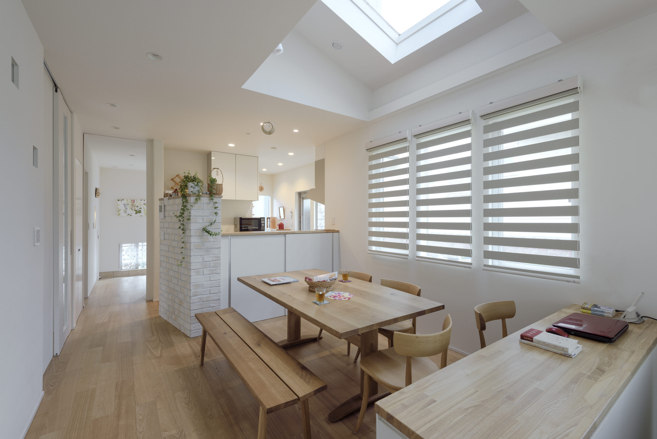 道路から約2m高い敷地に建つ住まいは、外部階段まで一体設計。玄関へ上がる所作が日常のプロローグになります。内部は“小さな工夫”を積み重ねた計画。ブリックタイルの壁が際立つキッチン、トップライトから光が降りるダイニング、床の間を設えた小上がりが空間に奥行きを与えます。階段横の脱衣室には階段下を活かした造作棚を計画し、限られた容積を無駄なく活用。動線は短く、視線は遠く――使いやすさと抜け感を同時に叶えました。庭は施主が丹念に手入れし、四季を映す外の居間に。屋内外の連続性が、日々の居心地を静かに底上げする一邸です。