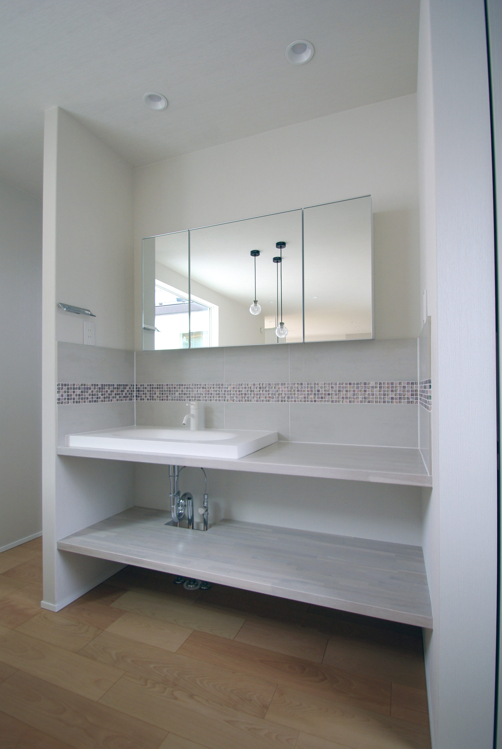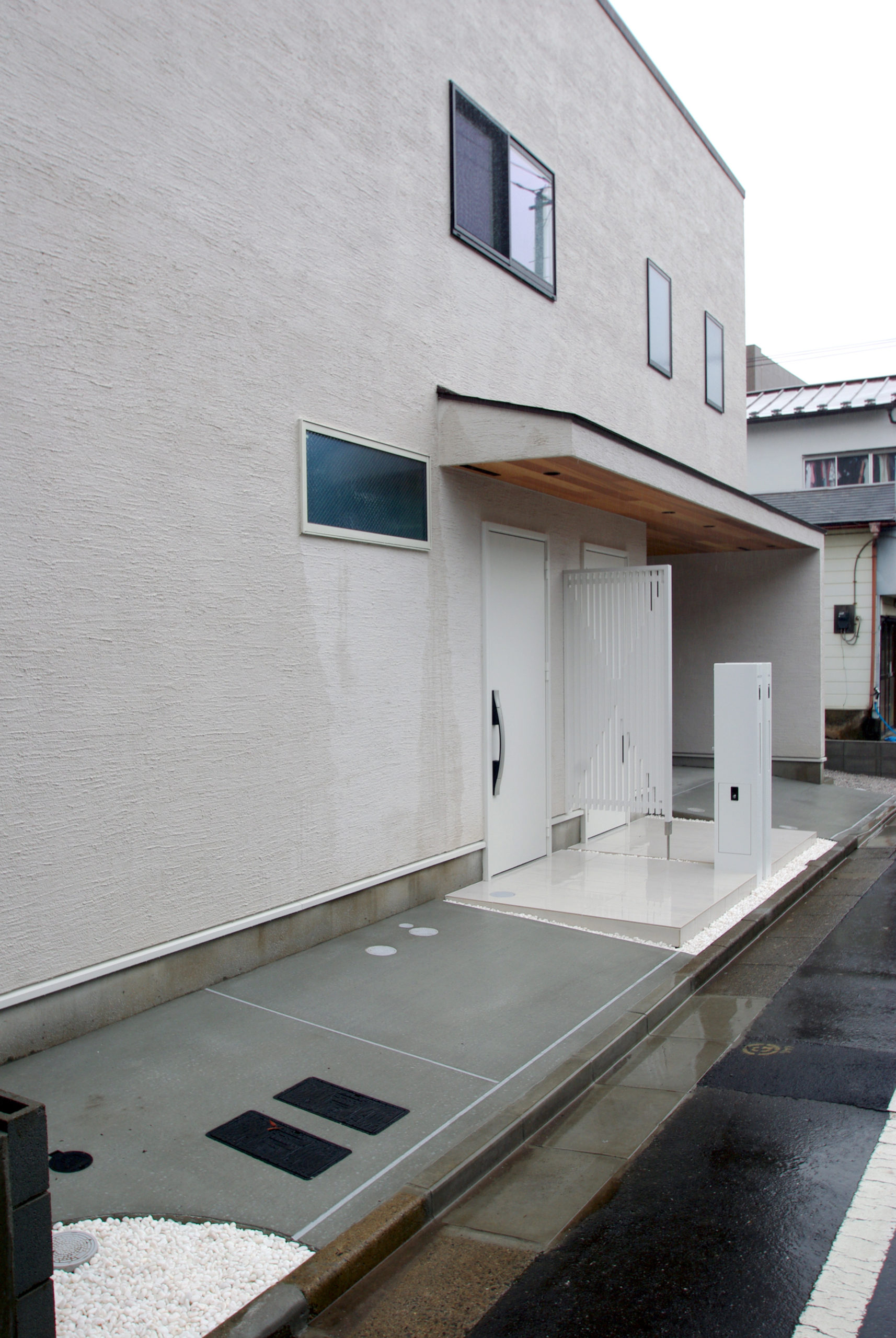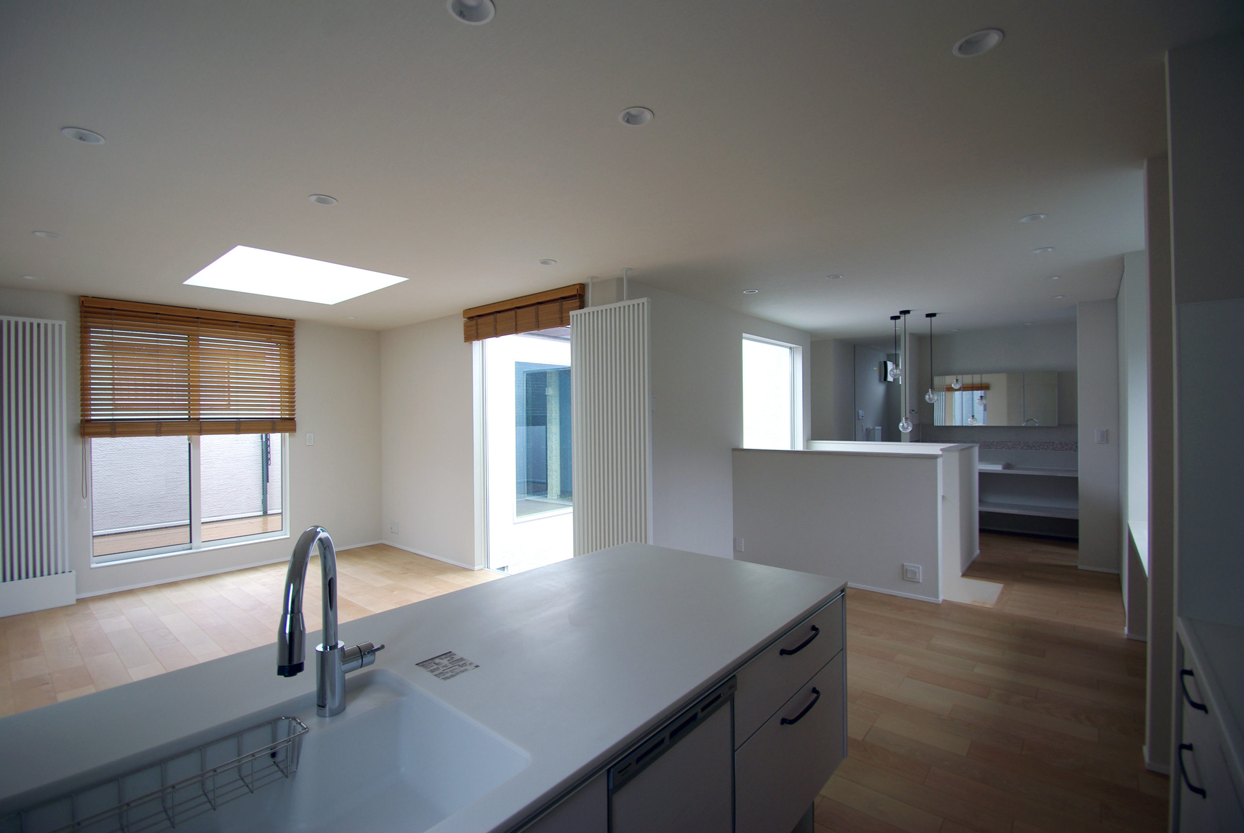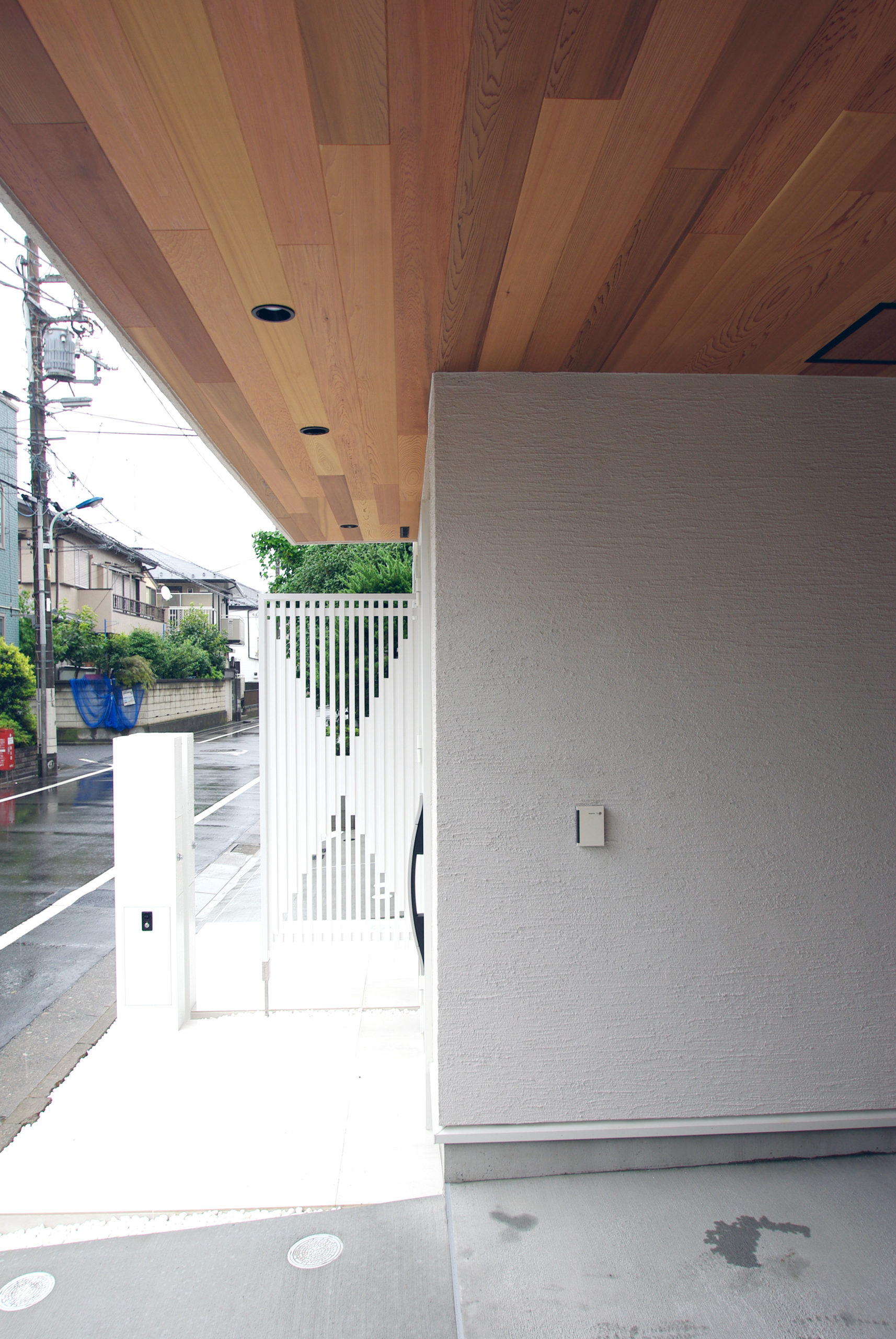 南面に十分な開口を確保しつつ、通りからの視線をかわす“奥行きの抜け”を計画。家の中心に回遊できるLDKを据え、キッチン‐ダイニング‐パントリー‐水まわりが短い導線で循環します。吹抜と高窓が一日を通して光を配り、格子と造作収納で生活感を抑制。外は植栽と塀で緑陰をつくり、内はオークの床とグレーのタイルで穏やかに統一。収納は適所に散らし、帰宅動線で片付く。素材と光、動線を整えることで、家族の気配が心地よくつながる住まいです。ワークスペースや室内干し動線も併設し、日々の家事と仕事が無理なく共存。静けさと開放感のバランスを、細部で調律しました。季節の陰影が、暮らしの時間に深さを添えます。毎日が少し誇らしく。