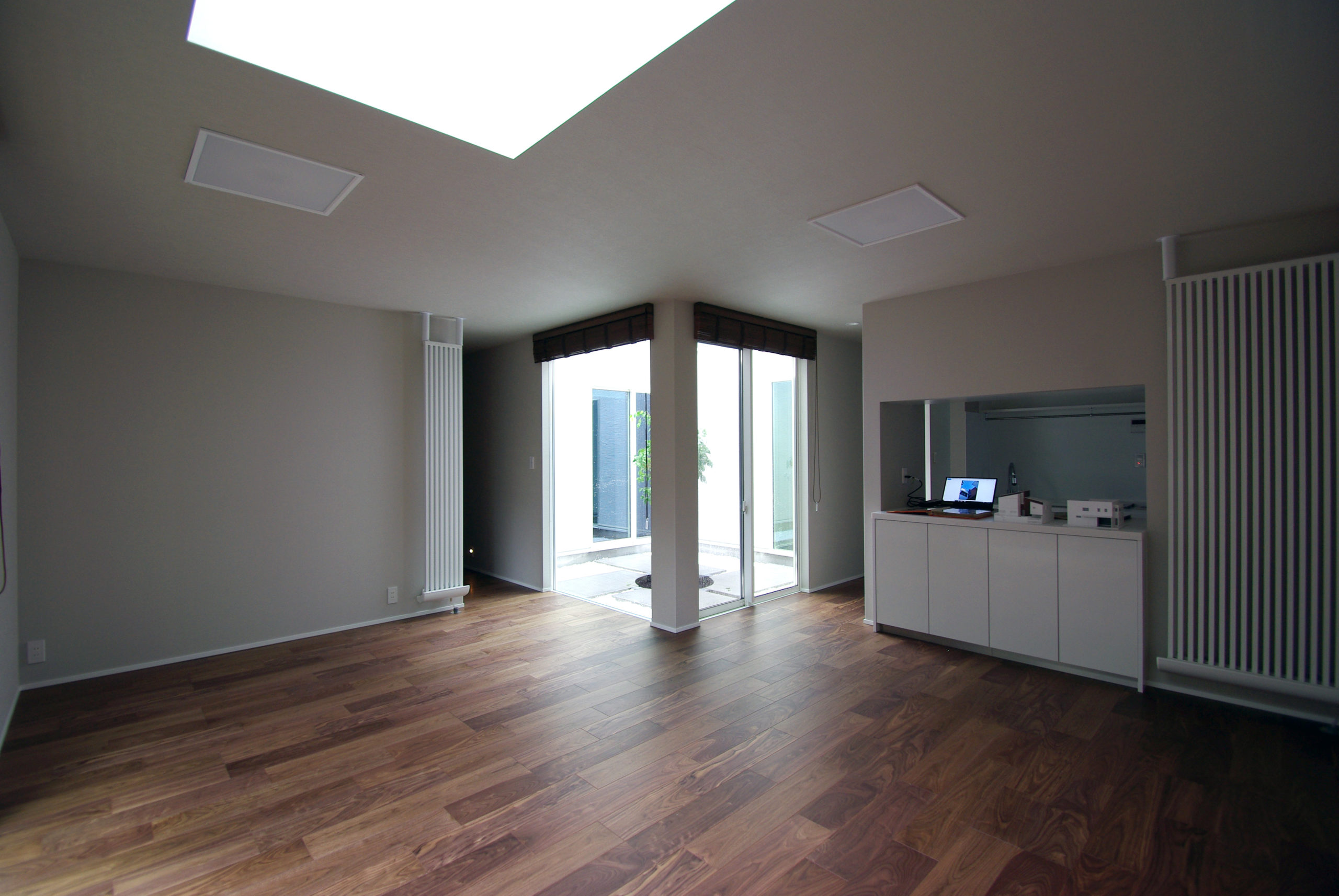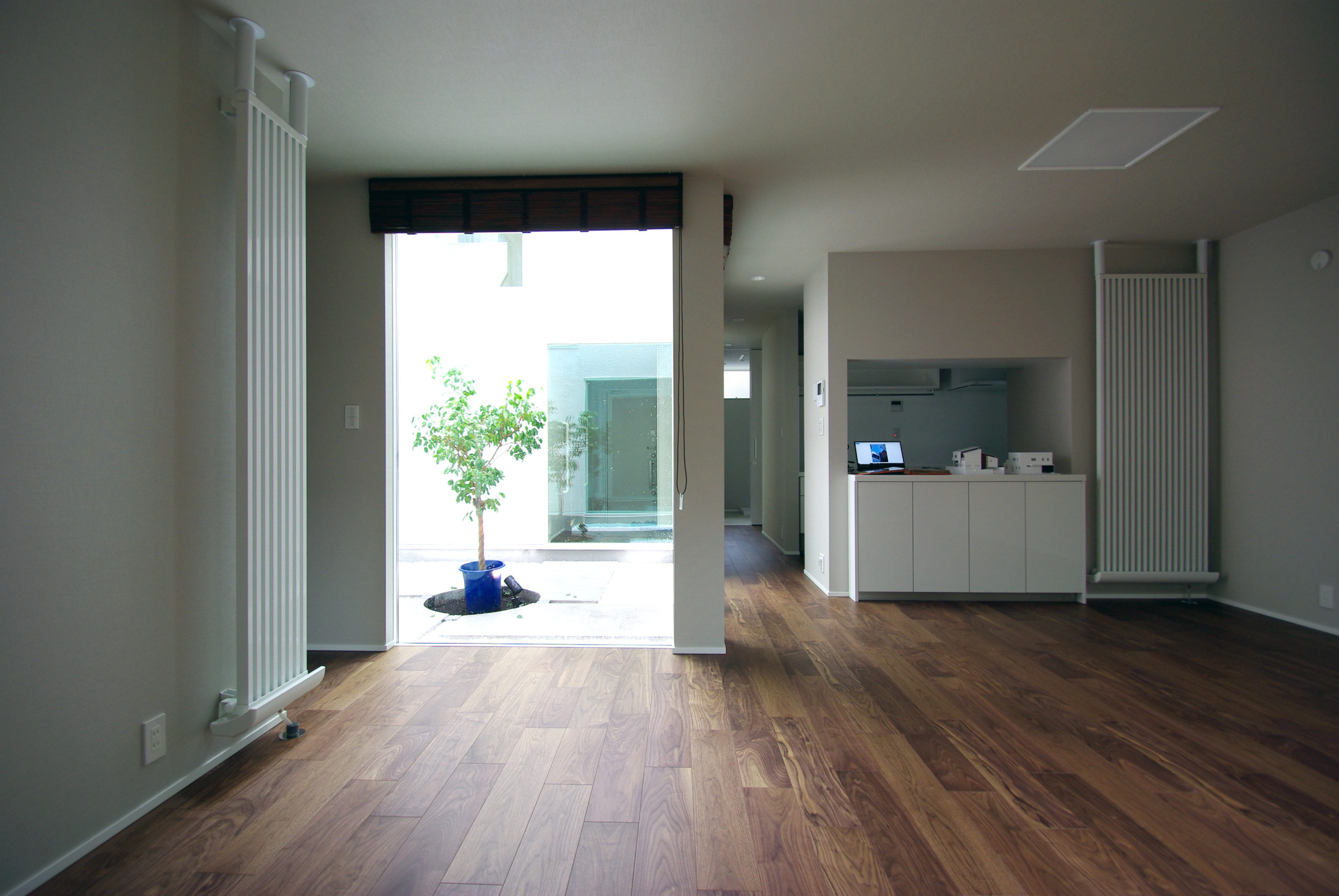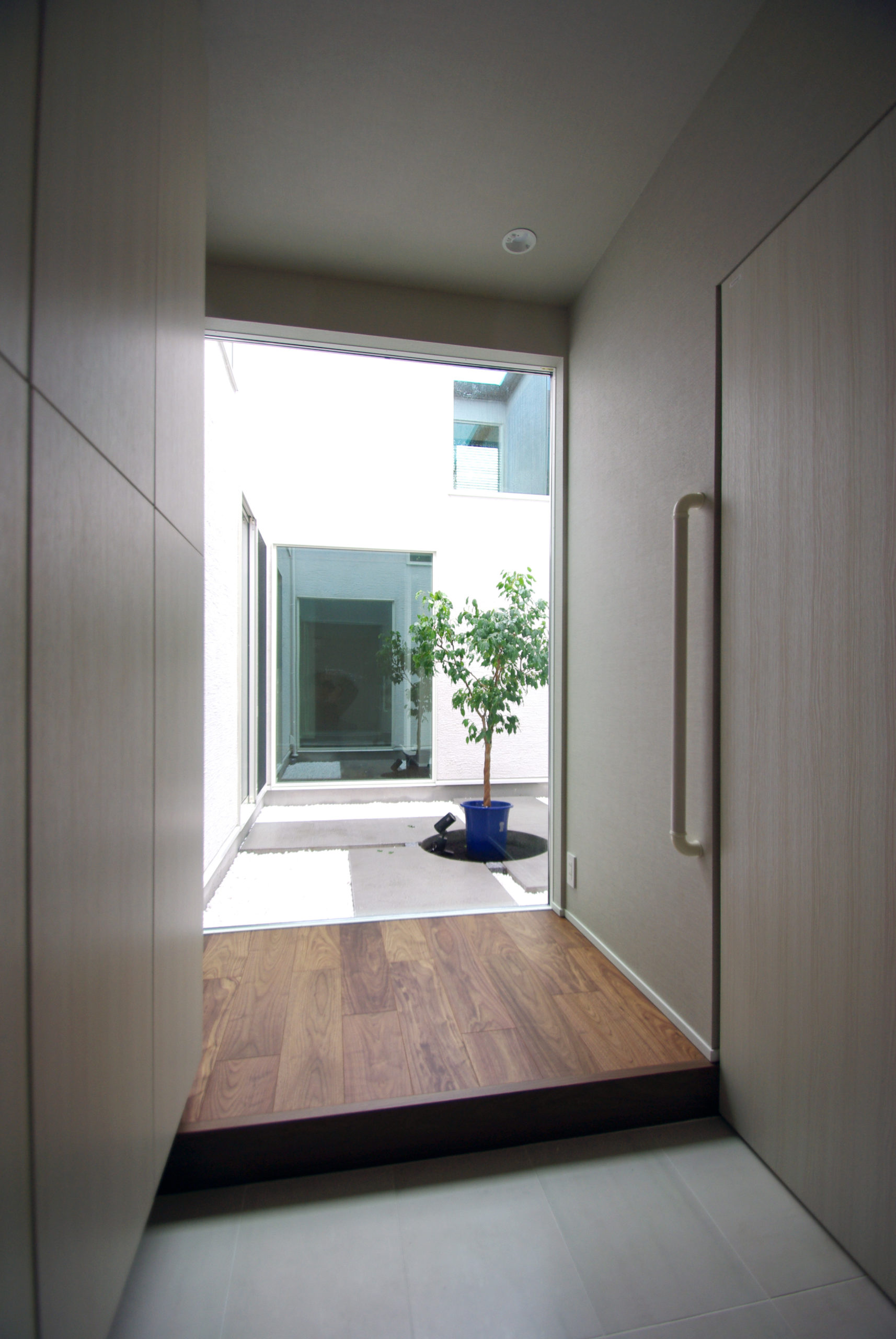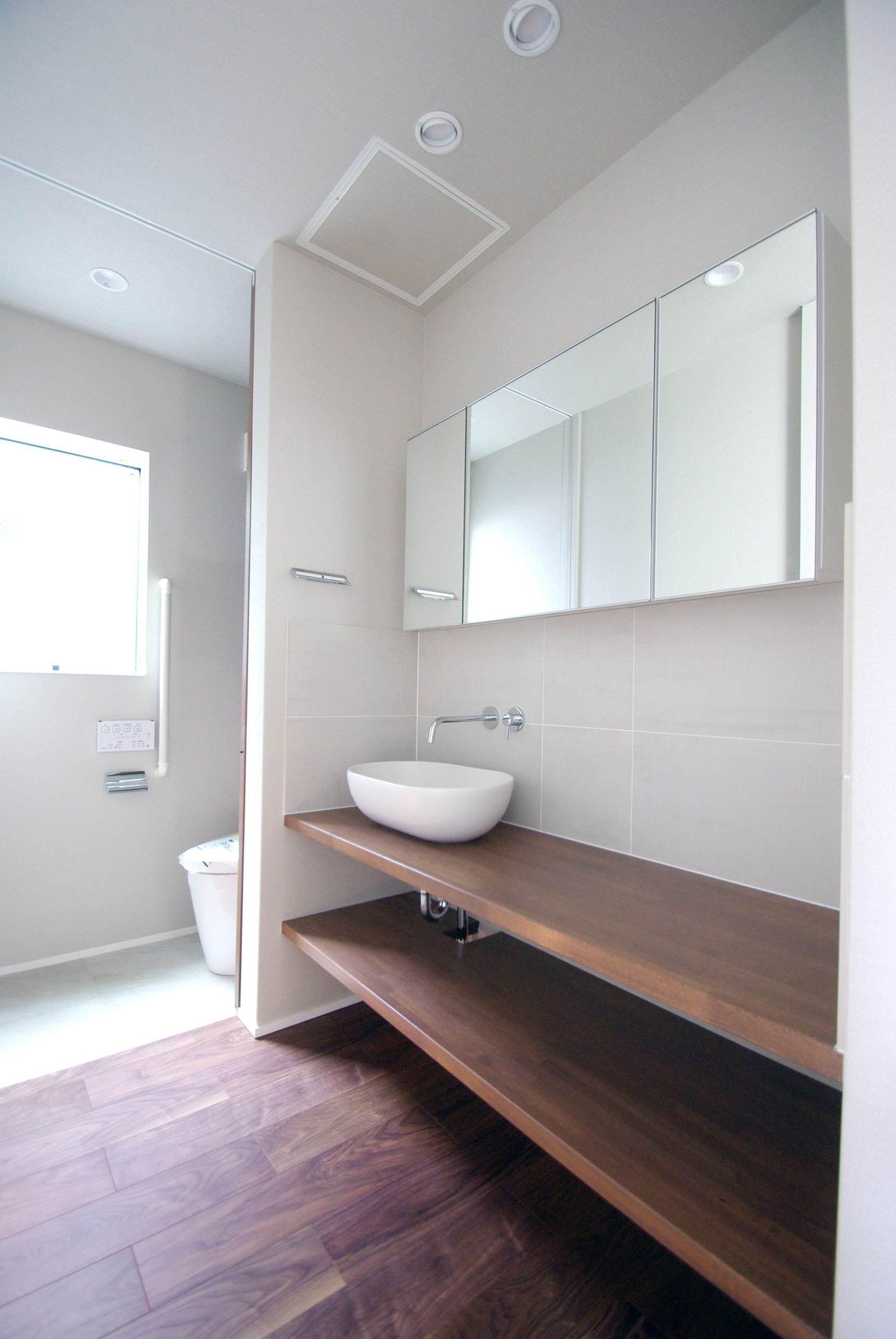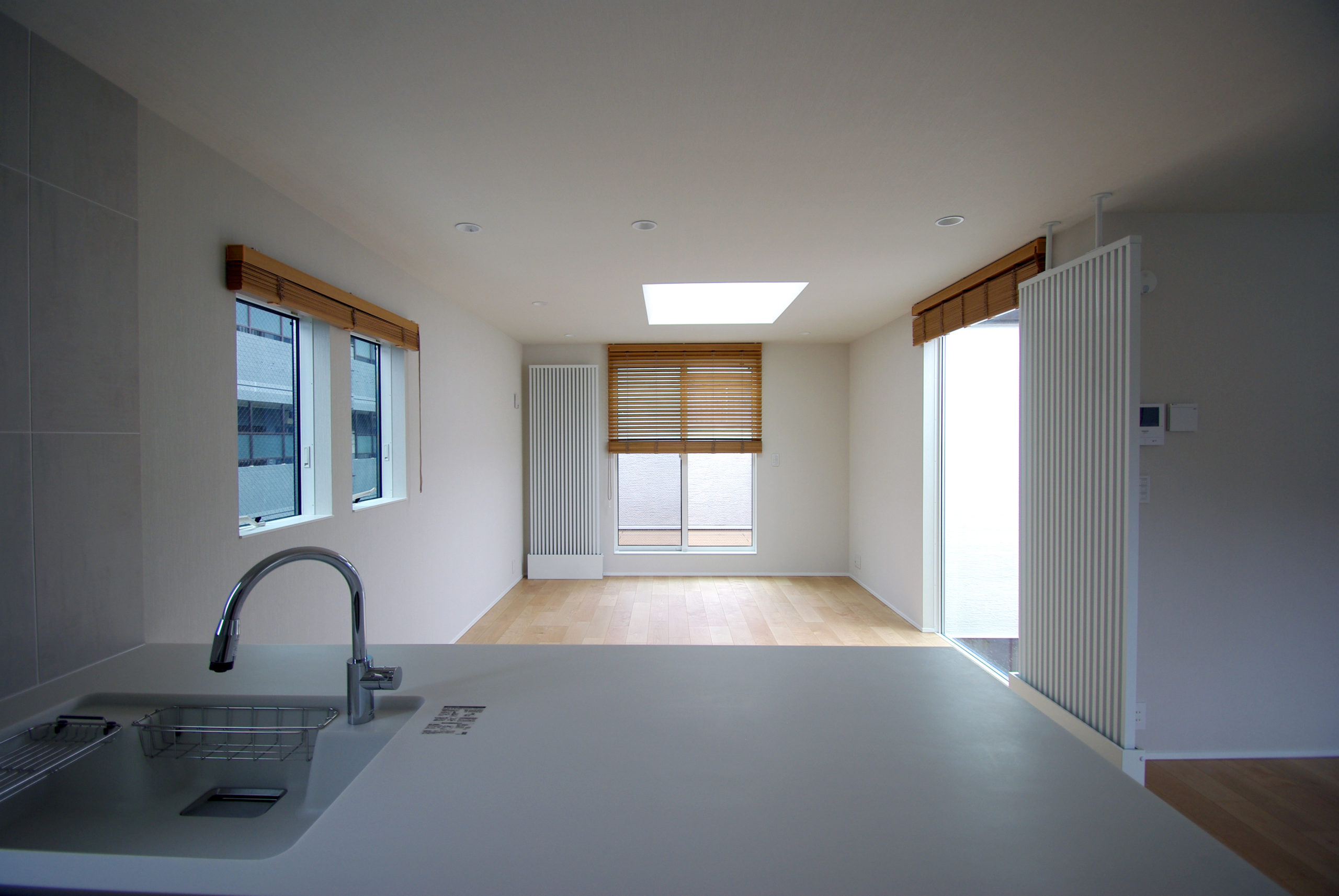 南面に十分な開口を確保しつつ、通りからの視線をかわす“奥行きの抜け”を計画。家の中心に回遊できるLDKを据え、キッチン‐ダイニング‐パントリー‐水まわりが短い導線で循環します。吹抜と高窓が一日を通して光を配り、格子と造作収納で生活感を抑制。外は植栽と塀で緑陰をつくり、内はオークの床とグレーのタイルで穏やかに統一。収納は適所に散らし、帰宅動線で片付く。素材と光、動線を整えることで、家族の気配が心地よくつながる住まいです。ワークスペースや室内干し動線も併設し、日々の家事と仕事が無理なく共存。静けさと開放感のバランスを、細部で調律しました。季節の陰影が、暮らしの時間に深さを添えます。毎日が少し誇らしく。