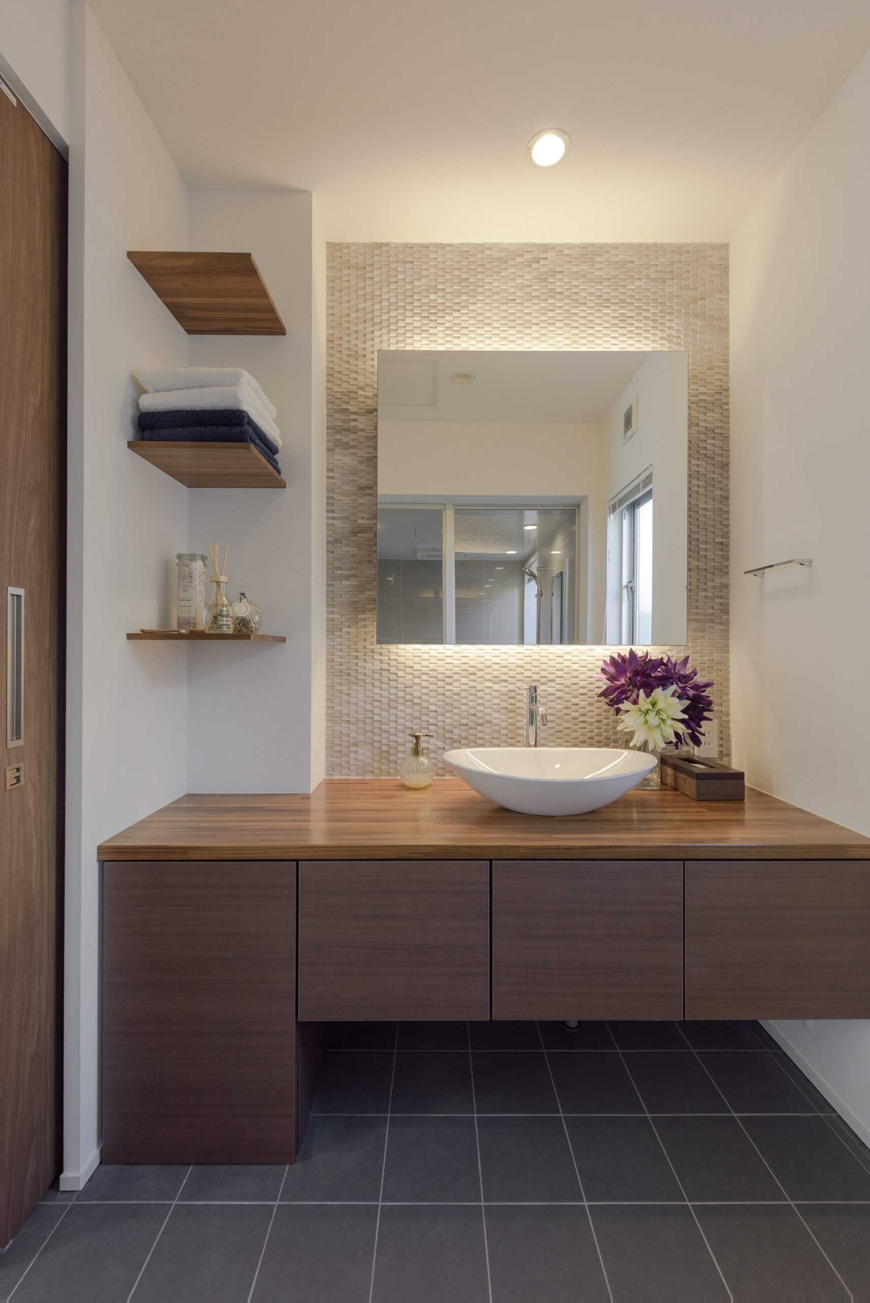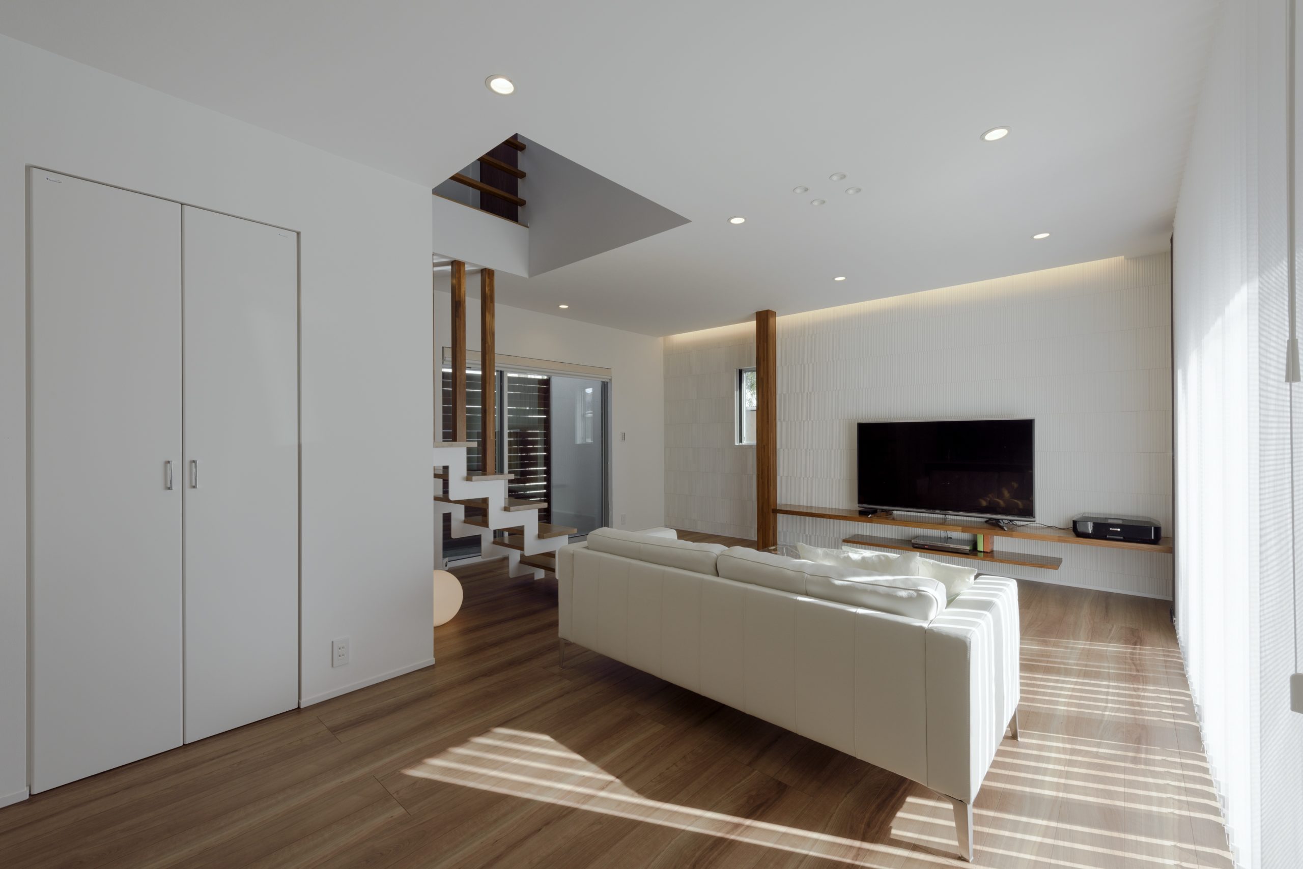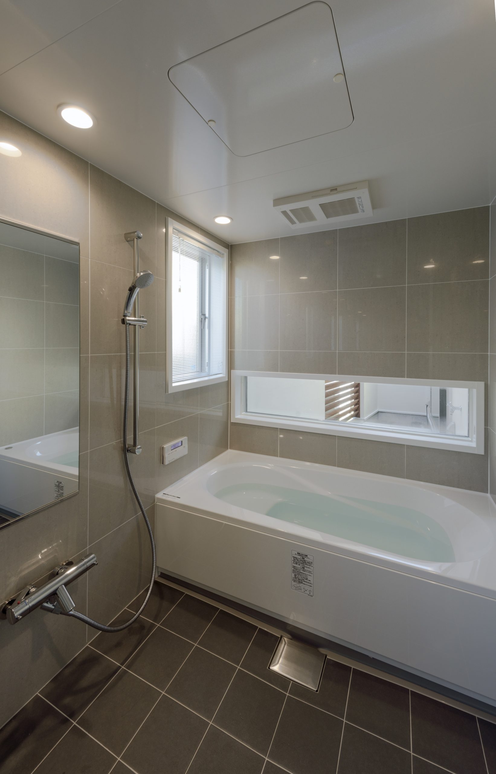 土地探しから伴走し、南面道路の条件を活かして1階に大きなLDKを計画。家電は階段下のパントリーに収め、視界と動線をすっきり整理。玄関は余白を残し、上階には格子でつながる小屋裏を設けました。洗面は正方形ミラーと間接照明、グレータイルで“ホテルライク”に統一。浴室は床壁を同材で包み、中庭へ抜ける横長窓で解放感を確保。オークの無垢床と落ち着いたトーンで全体を調和させ、家事導線は回遊性を高めています。南からの光は深い庇でほどよく調節し、一日を通じてより均質な明るさに。外構は道路側を囲い込み、プライバシーと開放感を両立。設計・施工・収納計画まで一体で、日常の上質を底上げした住まいです。