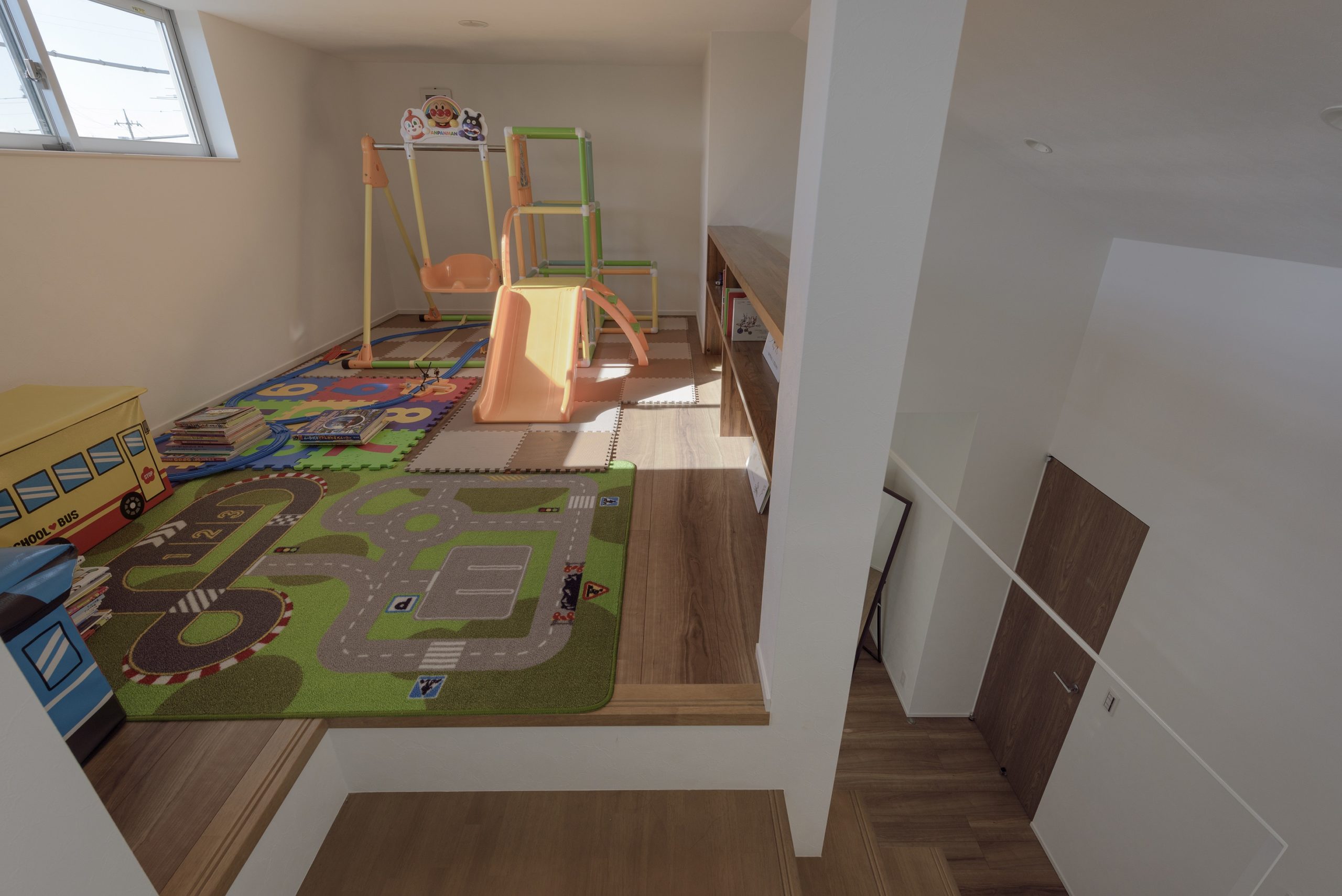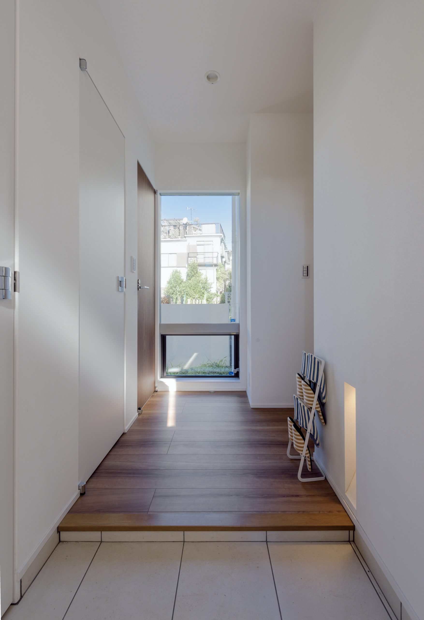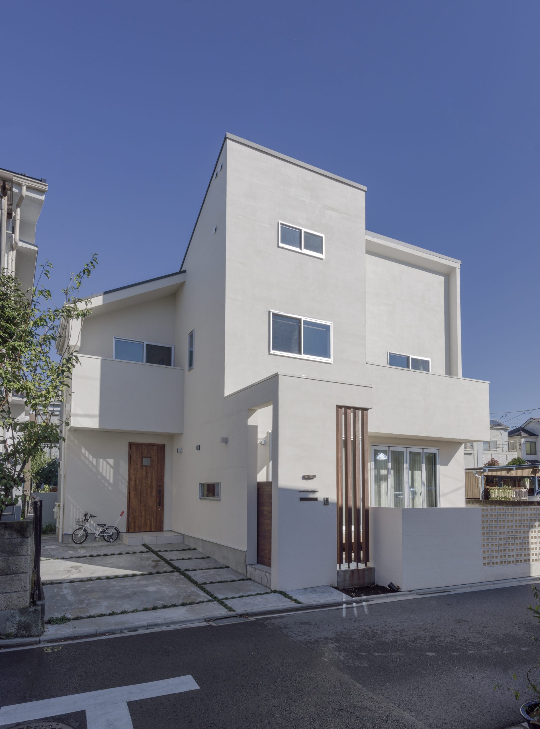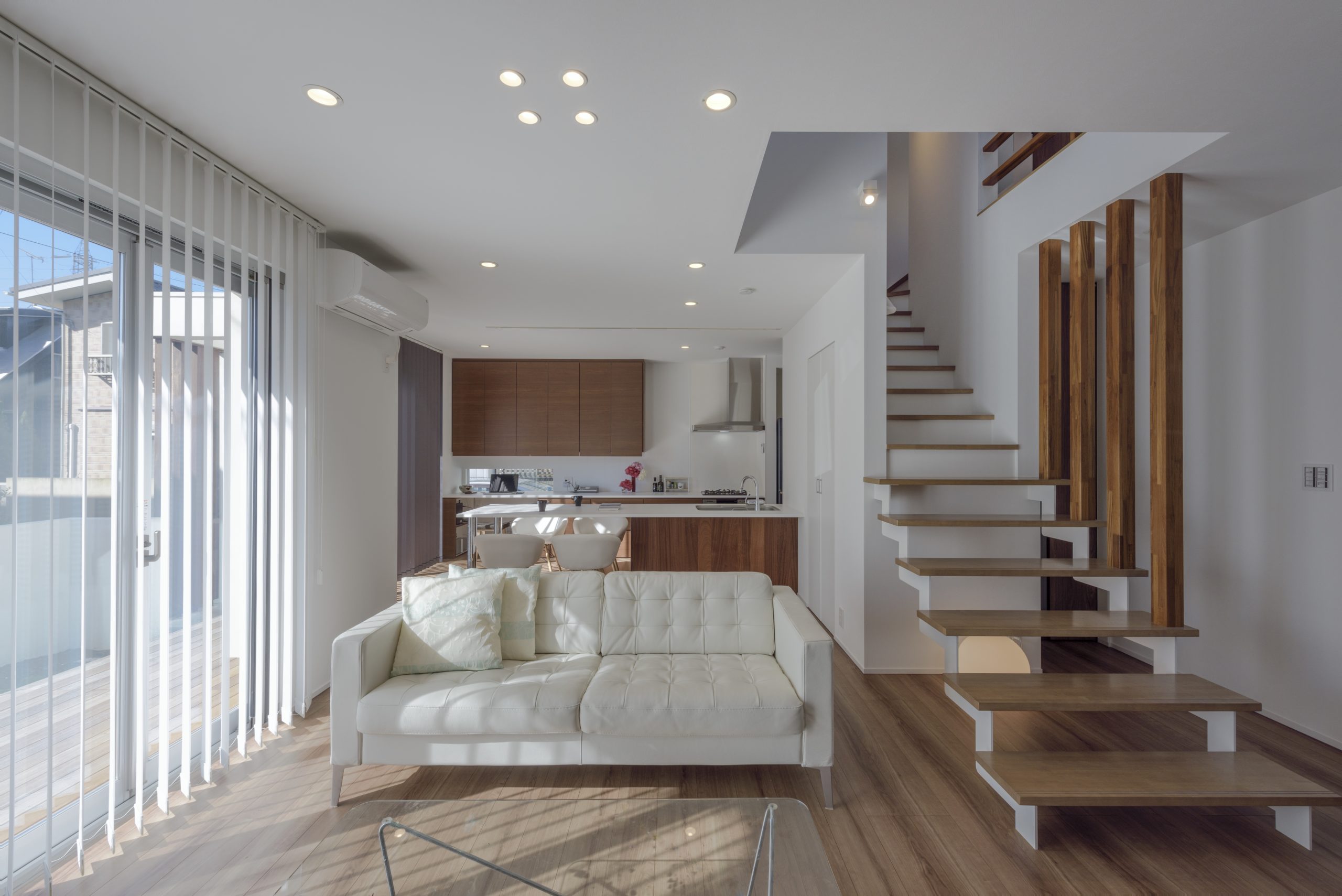 土地探しから伴走し、南面道路の条件を活かして1階に大きなLDKを計画。家電は階段下のパントリーに収め、視界と動線をすっきり整理。玄関は余白を残し、上階には格子でつながる小屋裏を設けました。洗面は正方形ミラーと間接照明、グレータイルで“ホテルライク”に統一。浴室は床壁を同材で包み、中庭へ抜ける横長窓で解放感を確保。オークの無垢床と落ち着いたトーンで全体を調和させ、家事導線は回遊性を高めています。南からの光は深い庇でほどよく調節し、一日を通じてより均質な明るさに。外構は道路側を囲い込み、プライバシーと開放感を両立。設計・施工・収納計画まで一体で、日常の上質を底上げした住まいです。