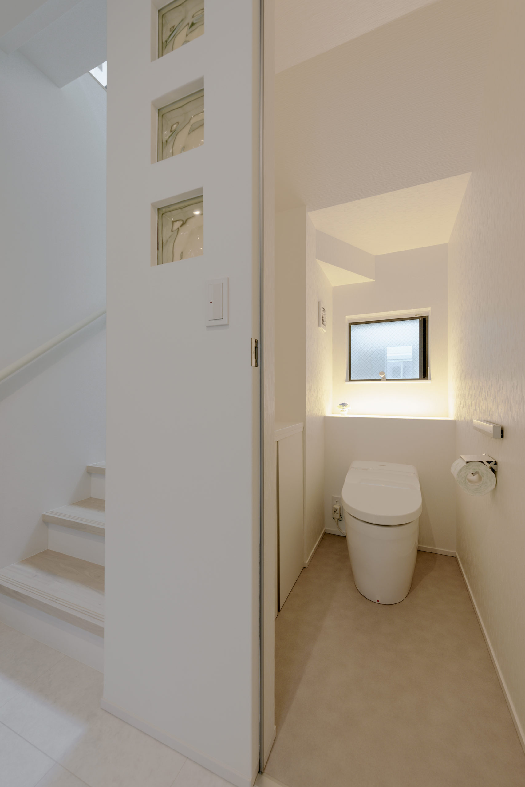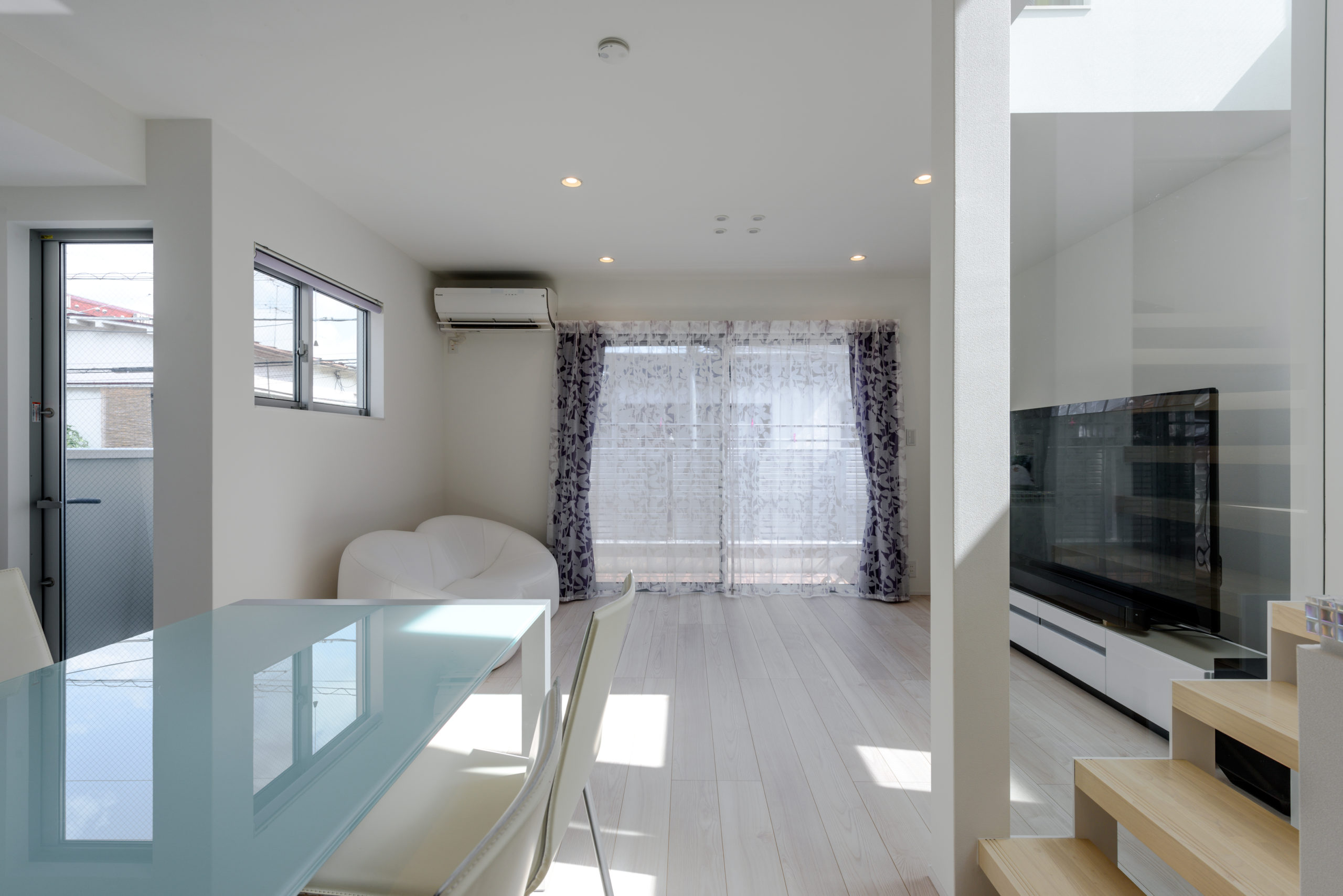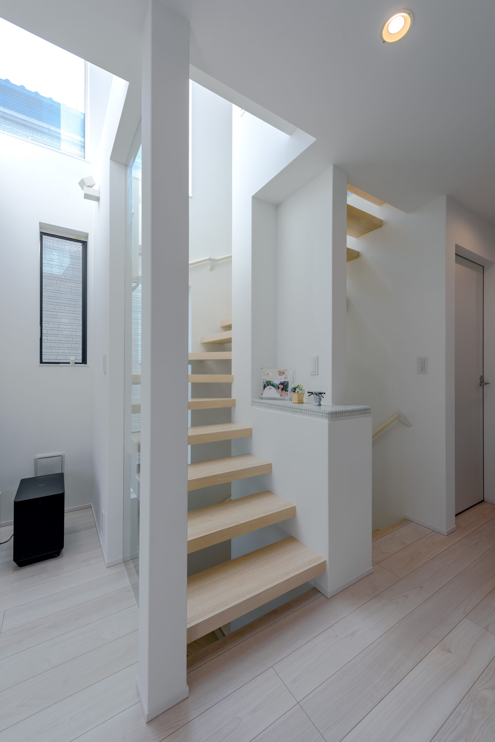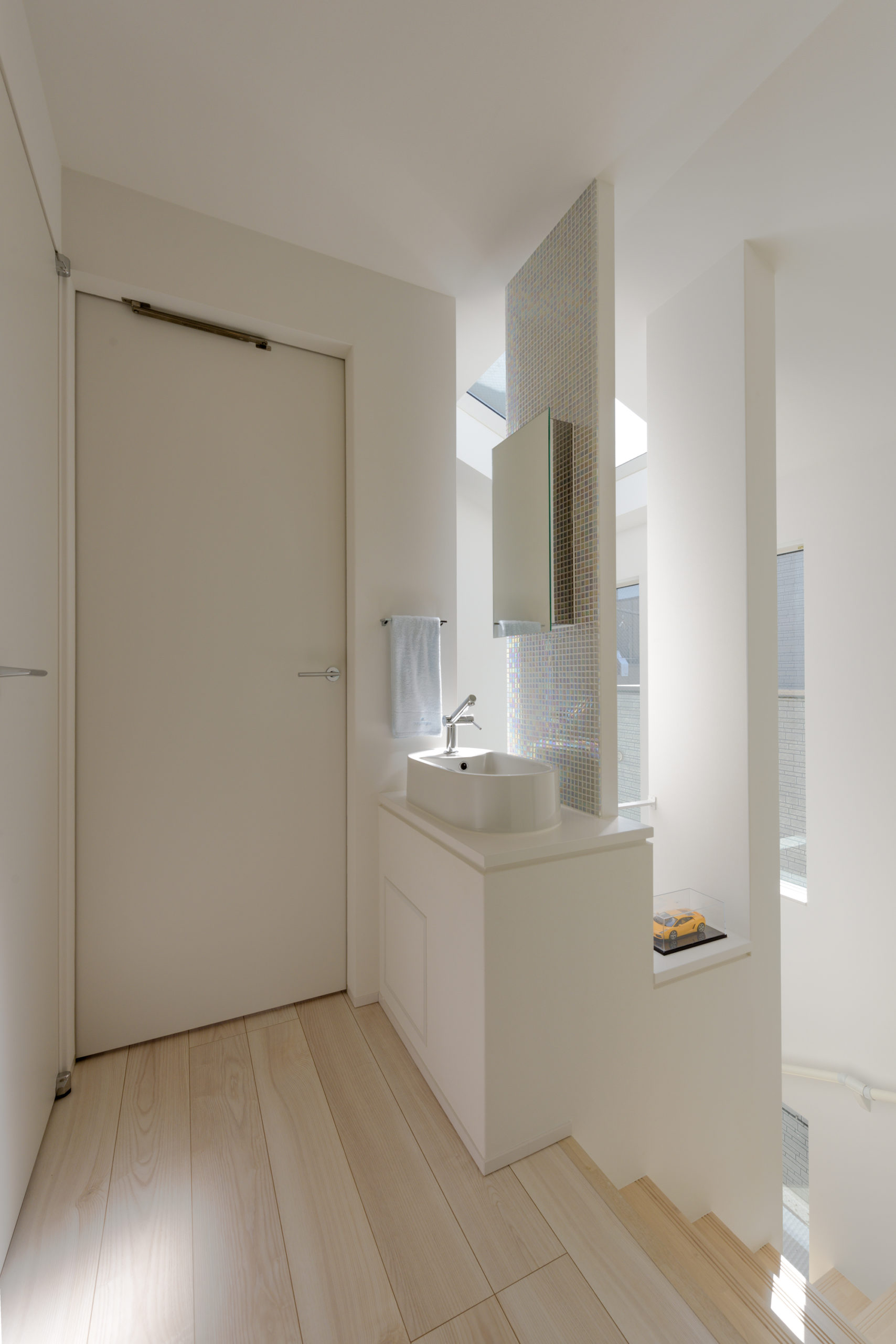 密集した街並みに建つ3階建ての狭小住宅。1階は駐車場とご主人の趣味室、2階にLDKと水まわり、3階に主寝室と子ども室を配し、上下の移動も暮らしやすく整えました。内装は「あたたかさのある白」を基調に、素材感と陰影でやわらかく。各階に造作手洗いを設け、外から帰ってすぐ、階ごとの動線の中で衛生習慣が完結します。隣家が近く採光が一方向となる敷地条件には、天窓で上から光を招き、階段まわりをガラスで包んで縦方向にも光を落とす工夫を重ねました。明るさの芯を住まいの中心に置くことで、居場所ごとに表情が移ろい、清潔さが続く白と光の設計が、日常を静かに整えてくれます。限られた器に、軽やかな抜け感を行き渡らせた一邸です。