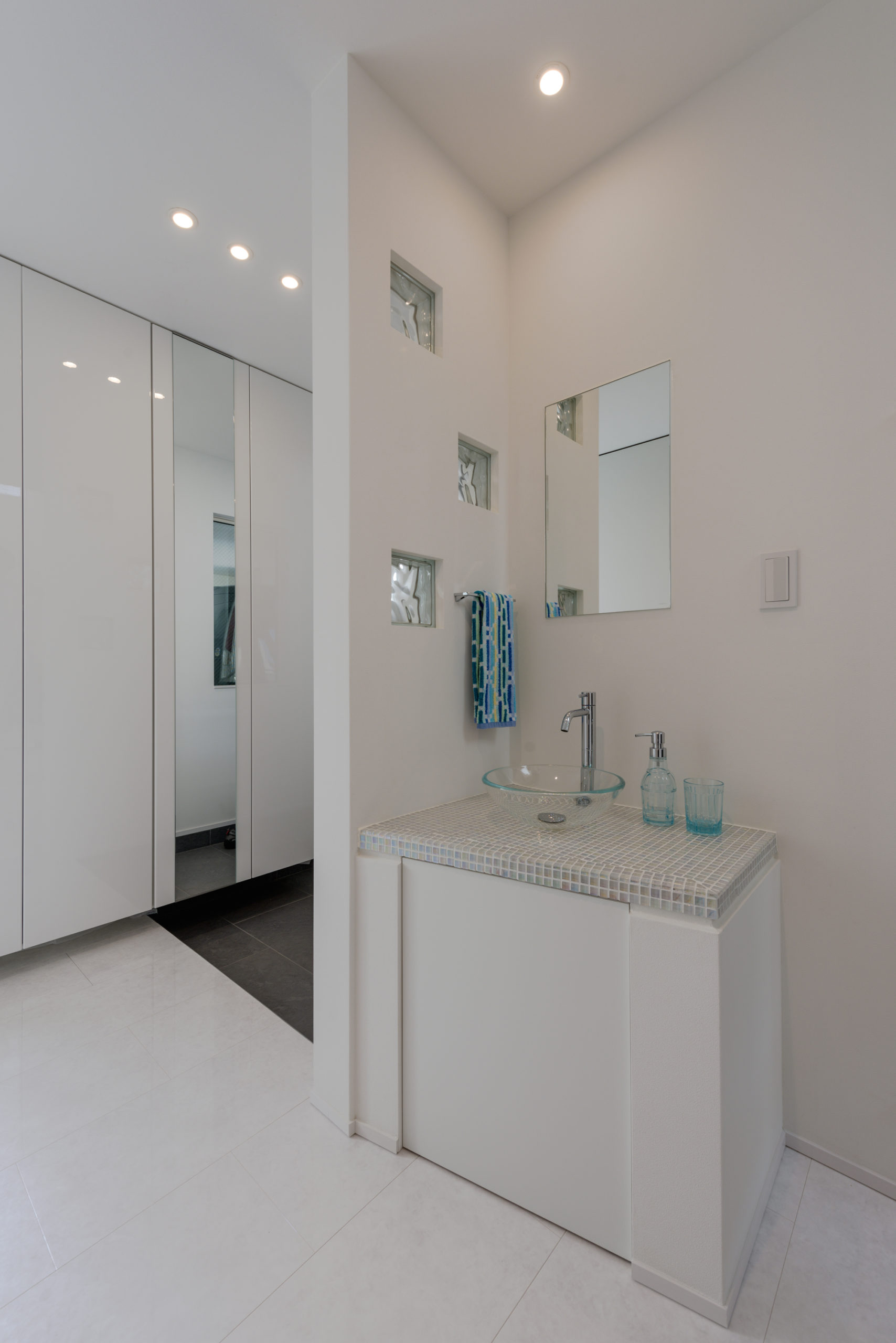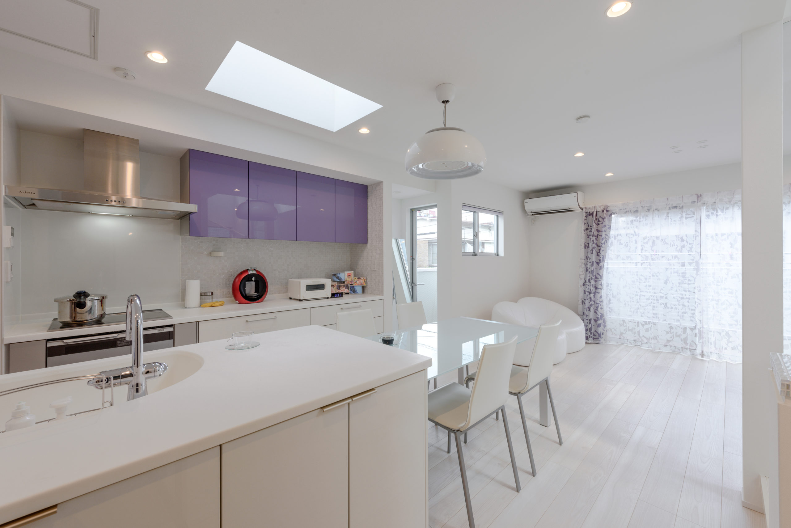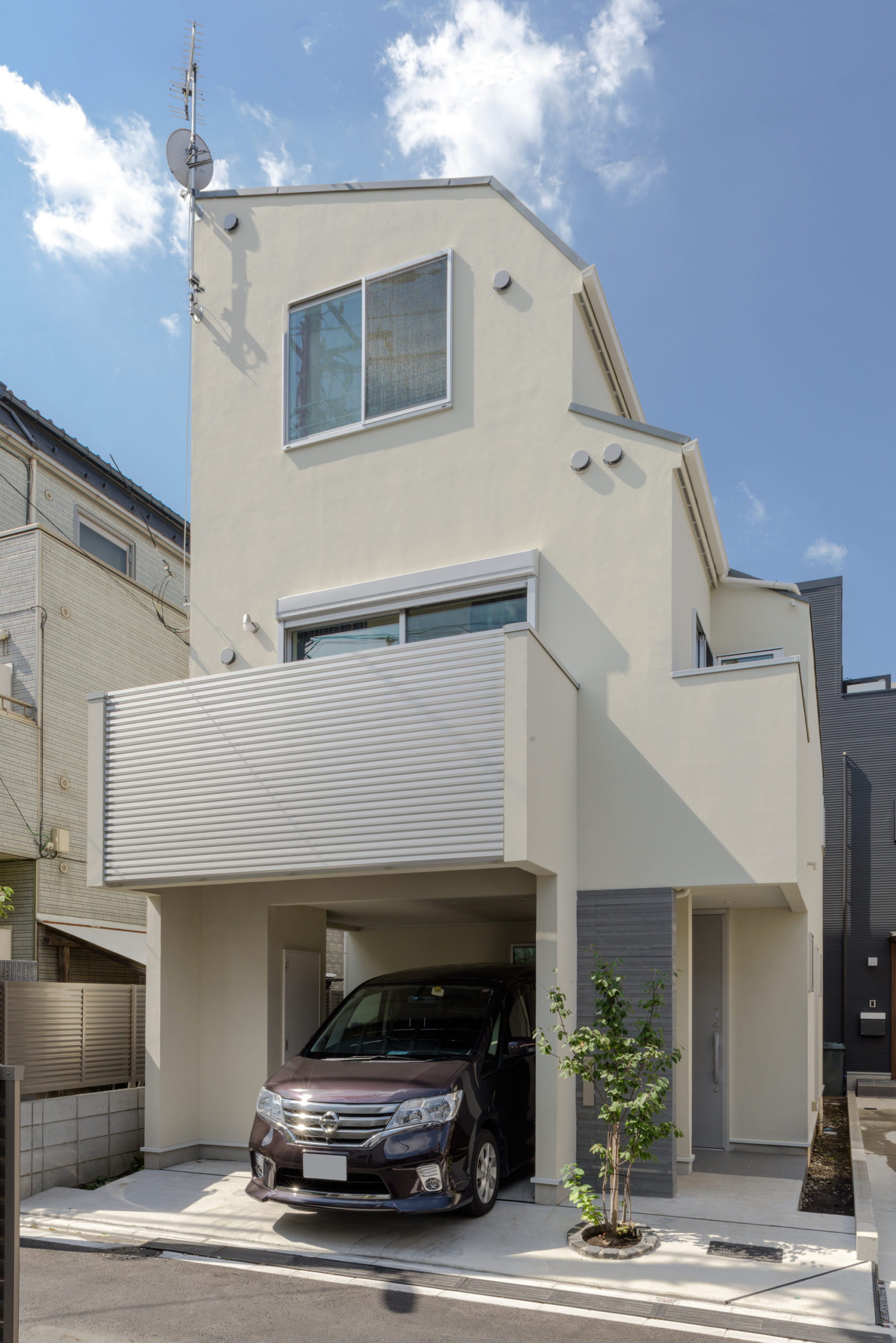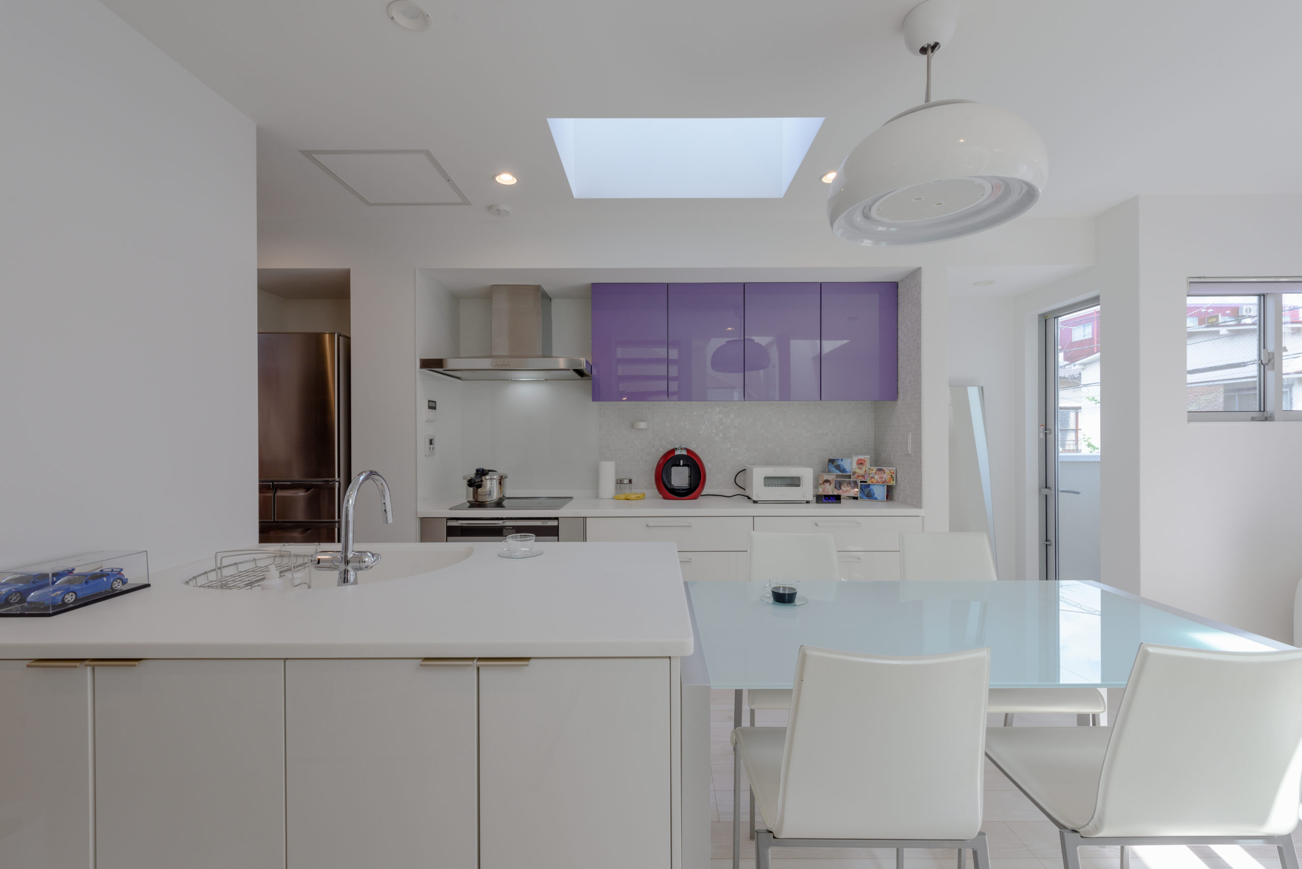 密集した街並みに建つ3階建ての狭小住宅。1階は駐車場とご主人の趣味室、2階にLDKと水まわり、3階に主寝室と子ども室を配し、上下の移動も暮らしやすく整えました。内装は「あたたかさのある白」を基調に、素材感と陰影でやわらかく。各階に造作手洗いを設け、外から帰ってすぐ、階ごとの動線の中で衛生習慣が完結します。隣家が近く採光が一方向となる敷地条件には、天窓で上から光を招き、階段まわりをガラスで包んで縦方向にも光を落とす工夫を重ねました。明るさの芯を住まいの中心に置くことで、居場所ごとに表情が移ろい、清潔さが続く白と光の設計が、日常を静かに整えてくれます。限られた器に、軽やかな抜け感を行き渡らせた一邸です。