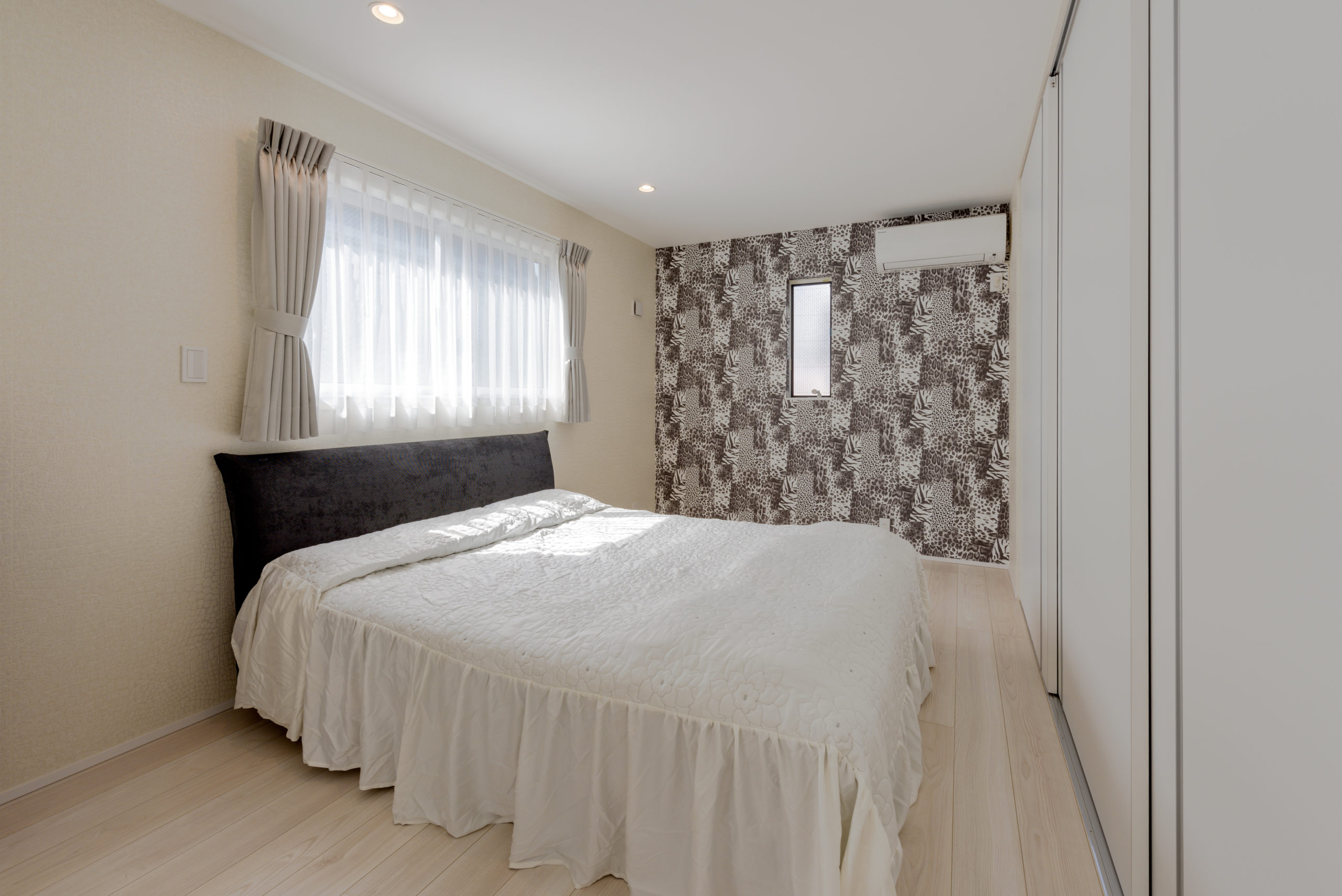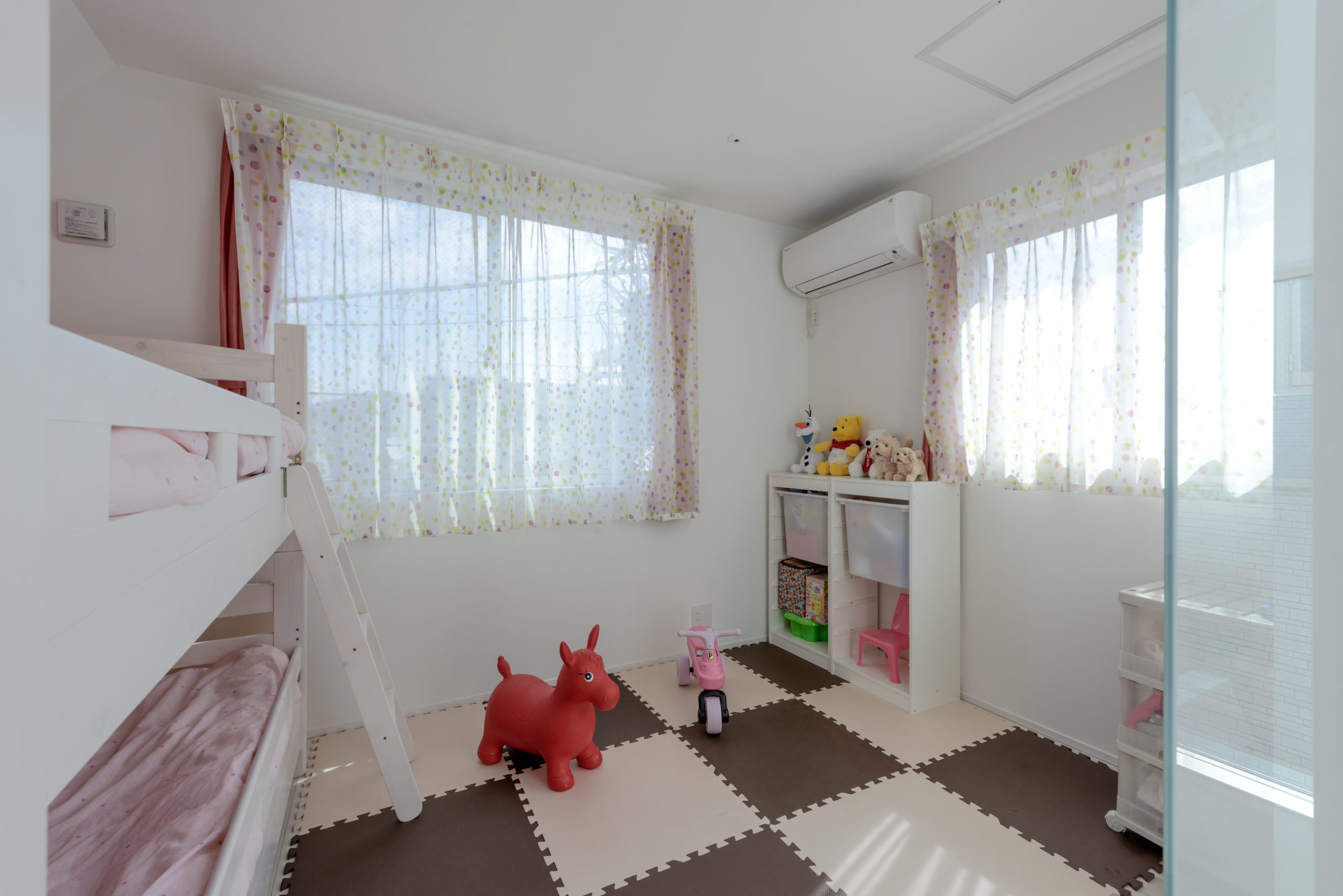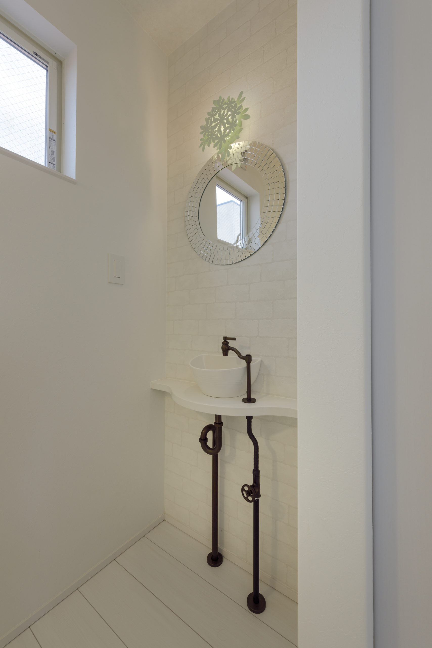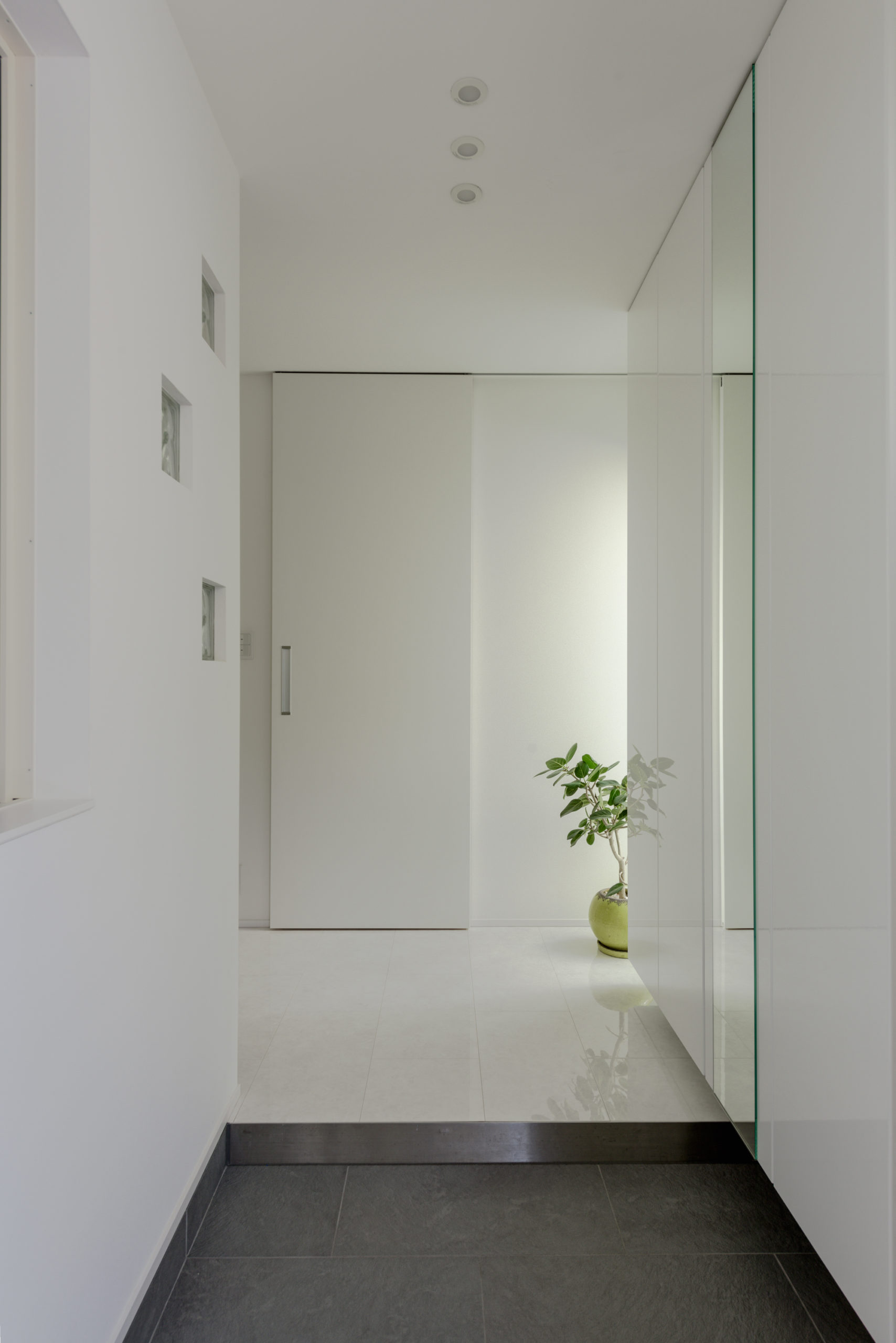 密集した街並みに建つ3階建ての狭小住宅。1階は駐車場とご主人の趣味室、2階にLDKと水まわり、3階に主寝室と子ども室を配し、上下の移動も暮らしやすく整えました。内装は「あたたかさのある白」を基調に、素材感と陰影でやわらかく。各階に造作手洗いを設け、外から帰ってすぐ、階ごとの動線の中で衛生習慣が完結します。隣家が近く採光が一方向となる敷地条件には、天窓で上から光を招き、階段まわりをガラスで包んで縦方向にも光を落とす工夫を重ねました。明るさの芯を住まいの中心に置くことで、居場所ごとに表情が移ろい、清潔さが続く白と光の設計が、日常を静かに整えてくれます。限られた器に、軽やかな抜け感を行き渡らせた一邸です。