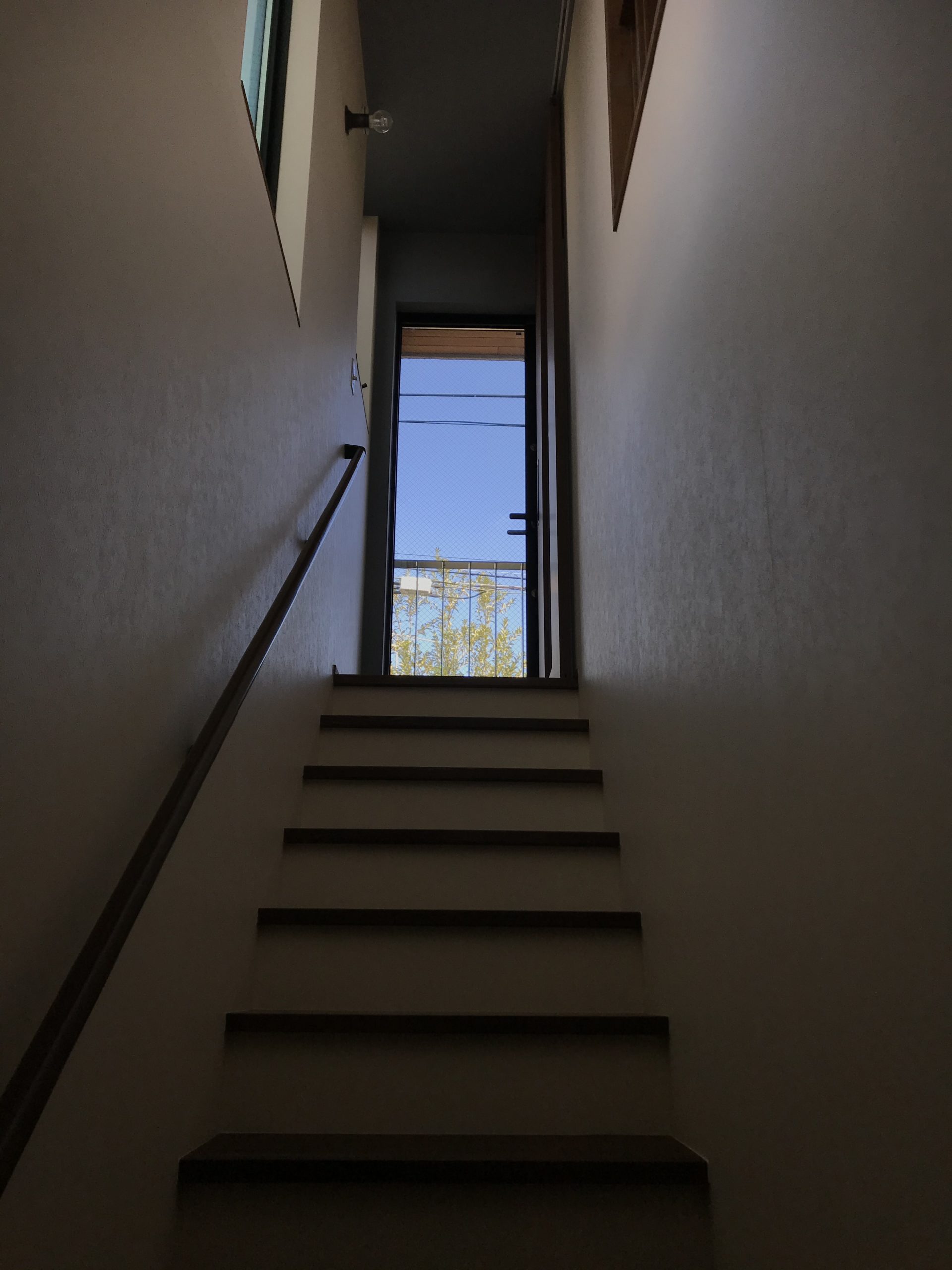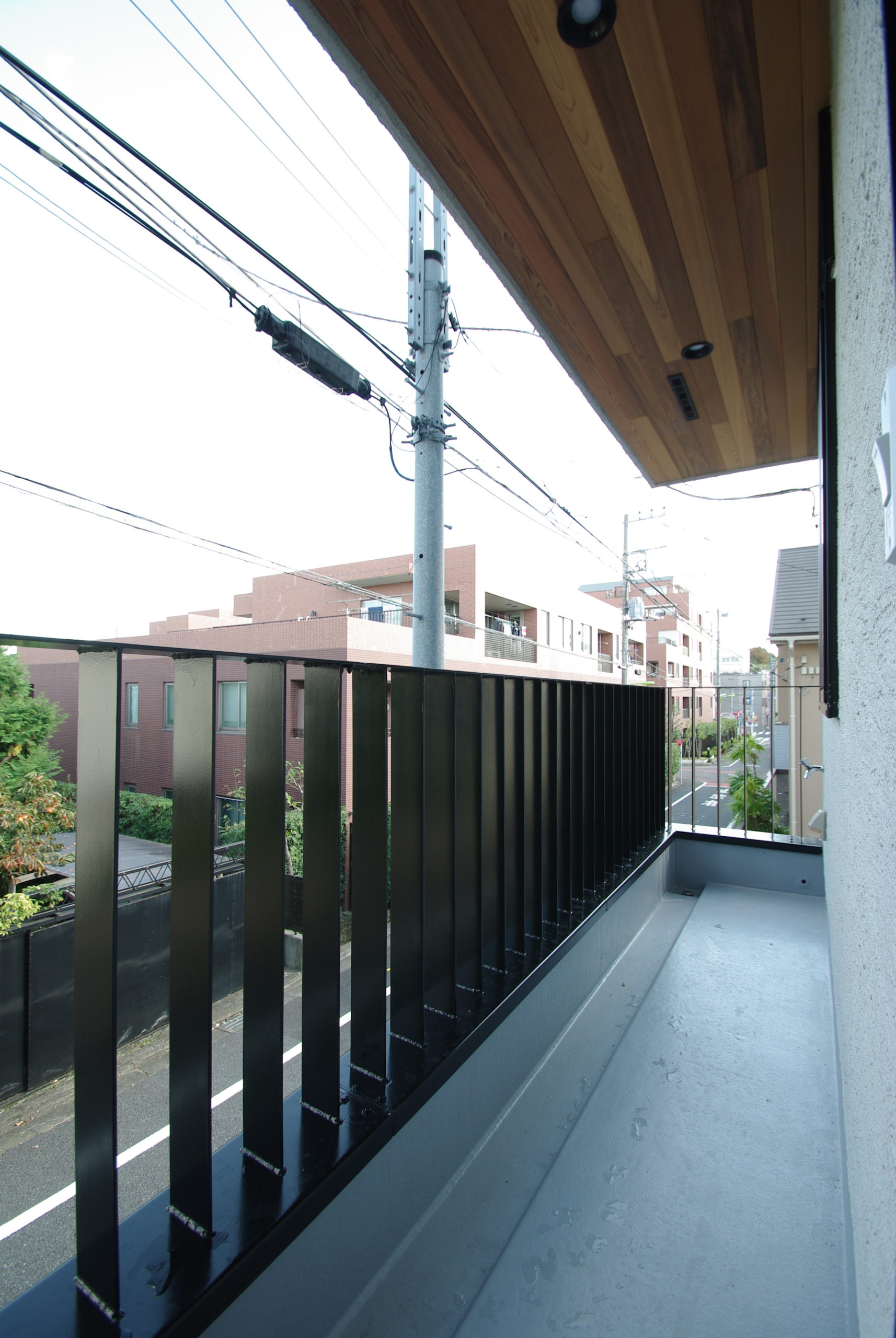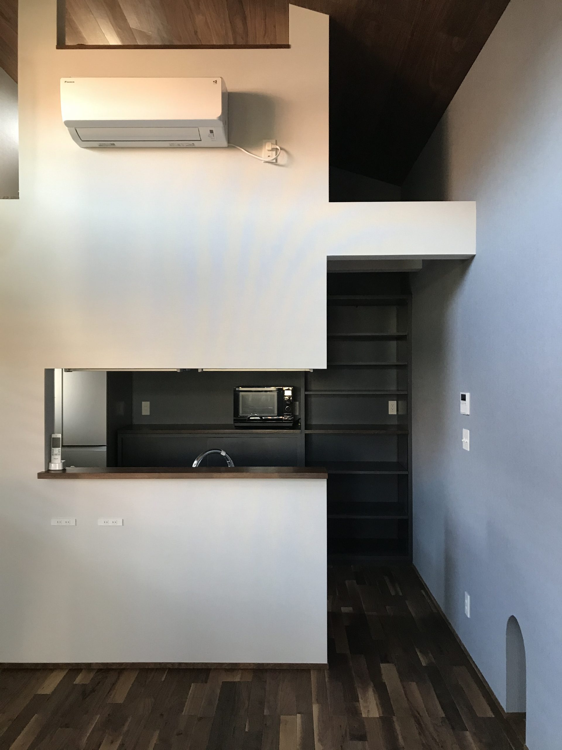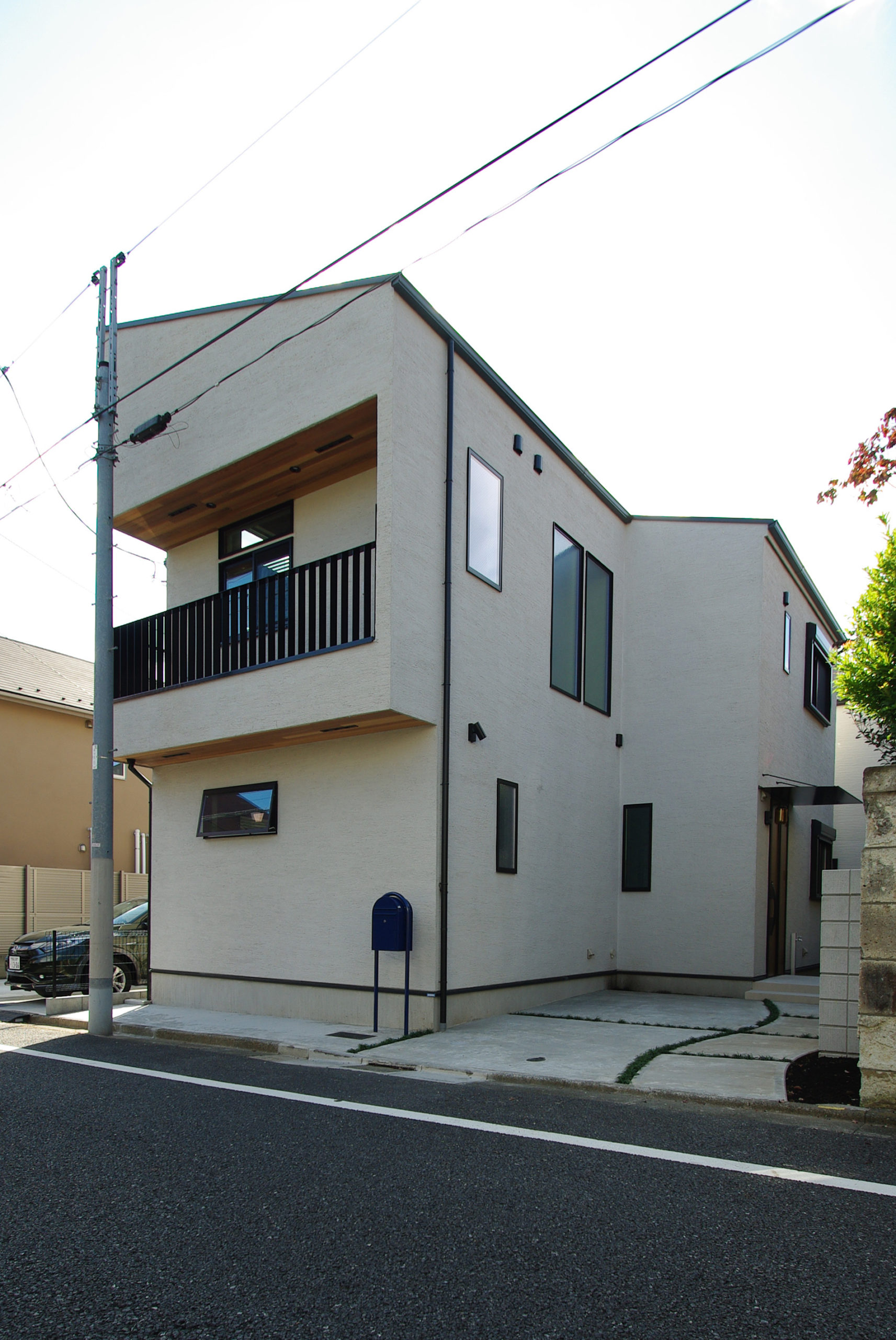 和モダンの外観に、むき出しの太い梁と磨りガラスが呼応する“古民家の懐”。勾配天井のLDKは、階段正面のベランダドアから1階まで光を落とし、奥行きと明るさを両立します。猫と暮らす工夫も随所に。専用ドアと窓辺のキャットウォークで回遊性を高め、爪や動線に配慮した素材計画で日々の負担を軽減。生活感の出やすいキッチンは収納を面でまとめて“ひそやか”に、玄関は磨りガラスの造作窓で外と内の気配を柔らかく接続。軒下の木部と黒アイアンの手摺が外観を引き締め、懐かしさと快適さが今の暮らしに馴染む一邸です。階段まわりの通風と採光を丁寧に整え、季節の陰影が家じゅうをやさしく巡ります。住まいの中心に豊かな余白を確保しました。