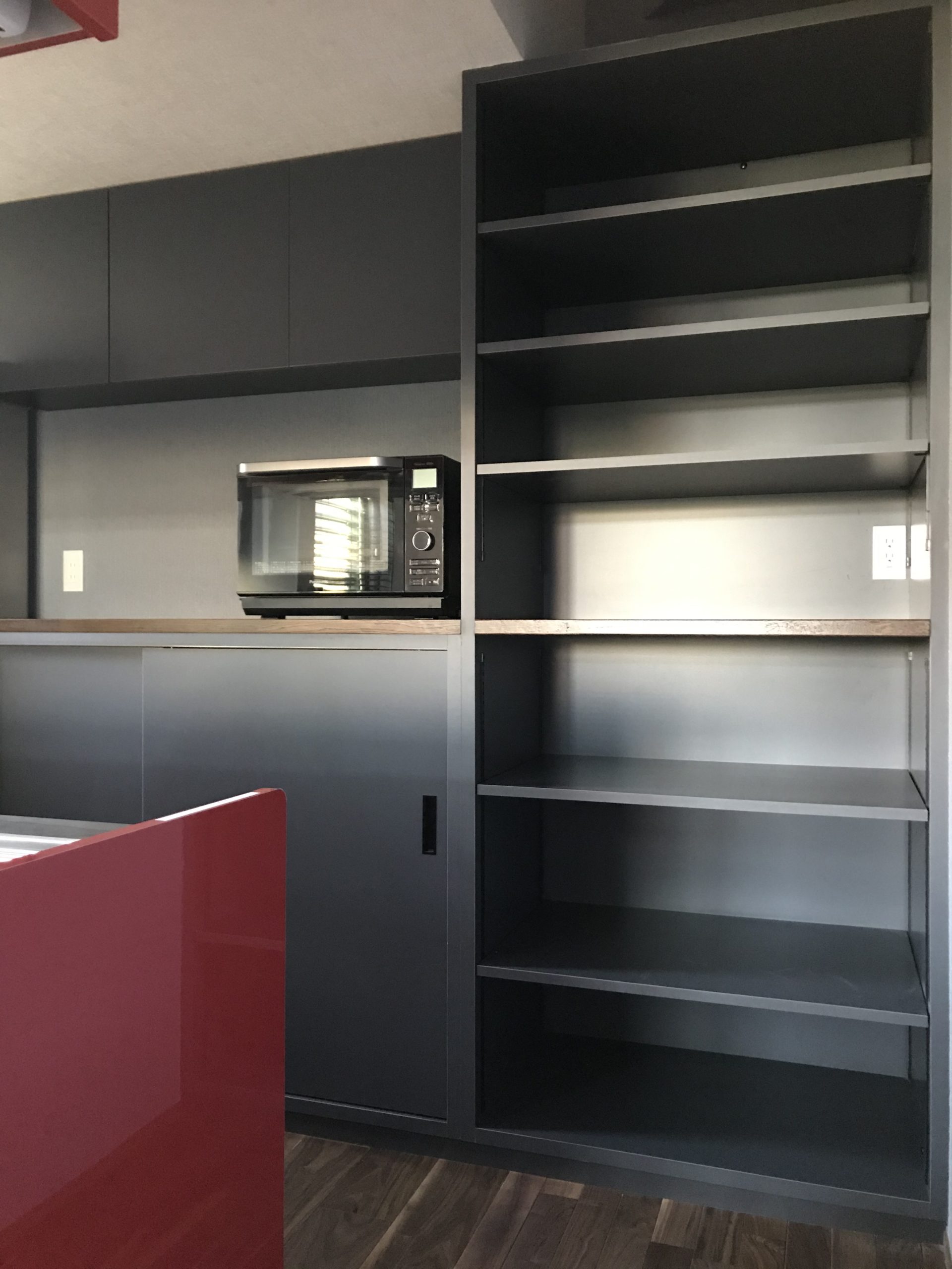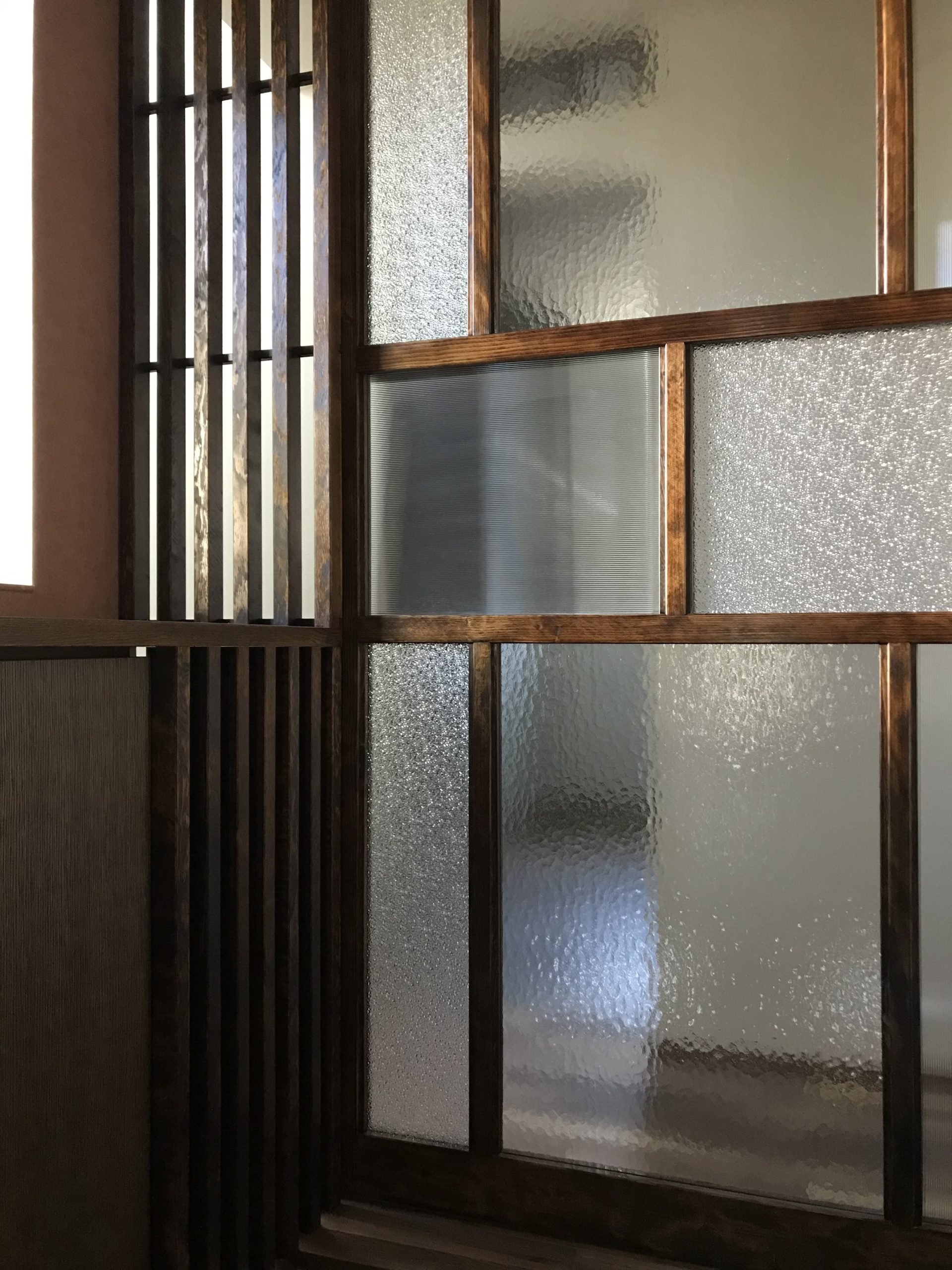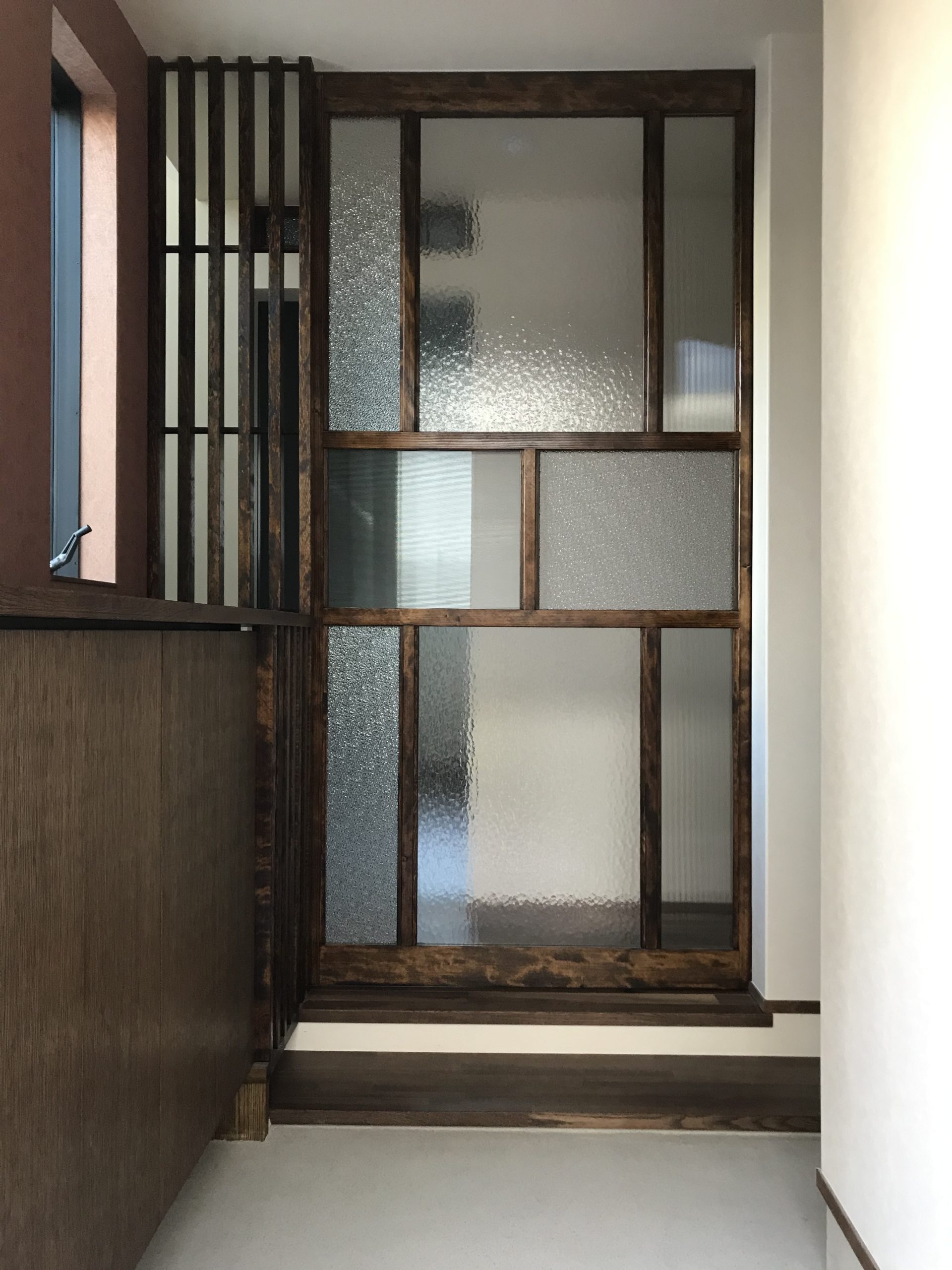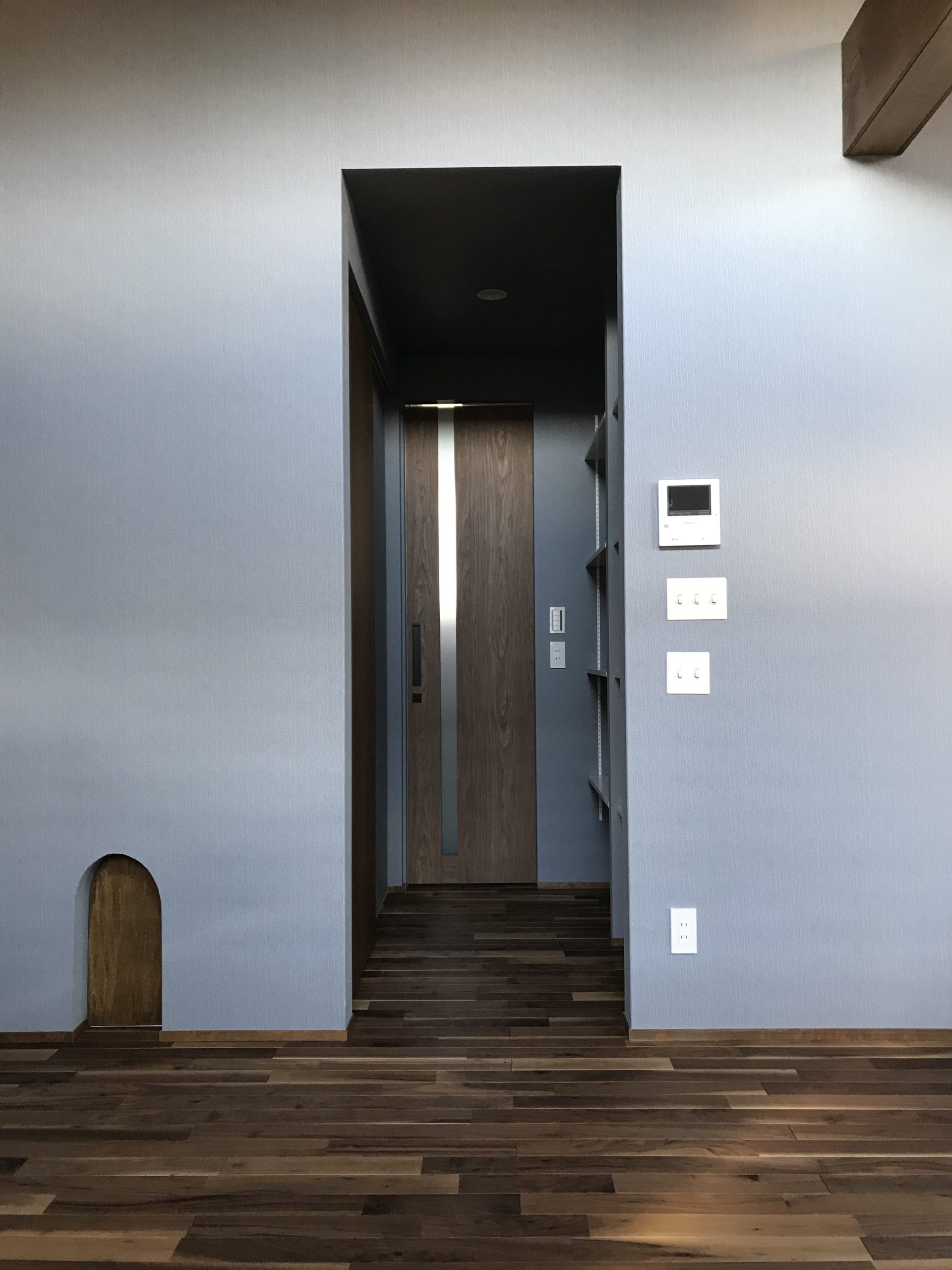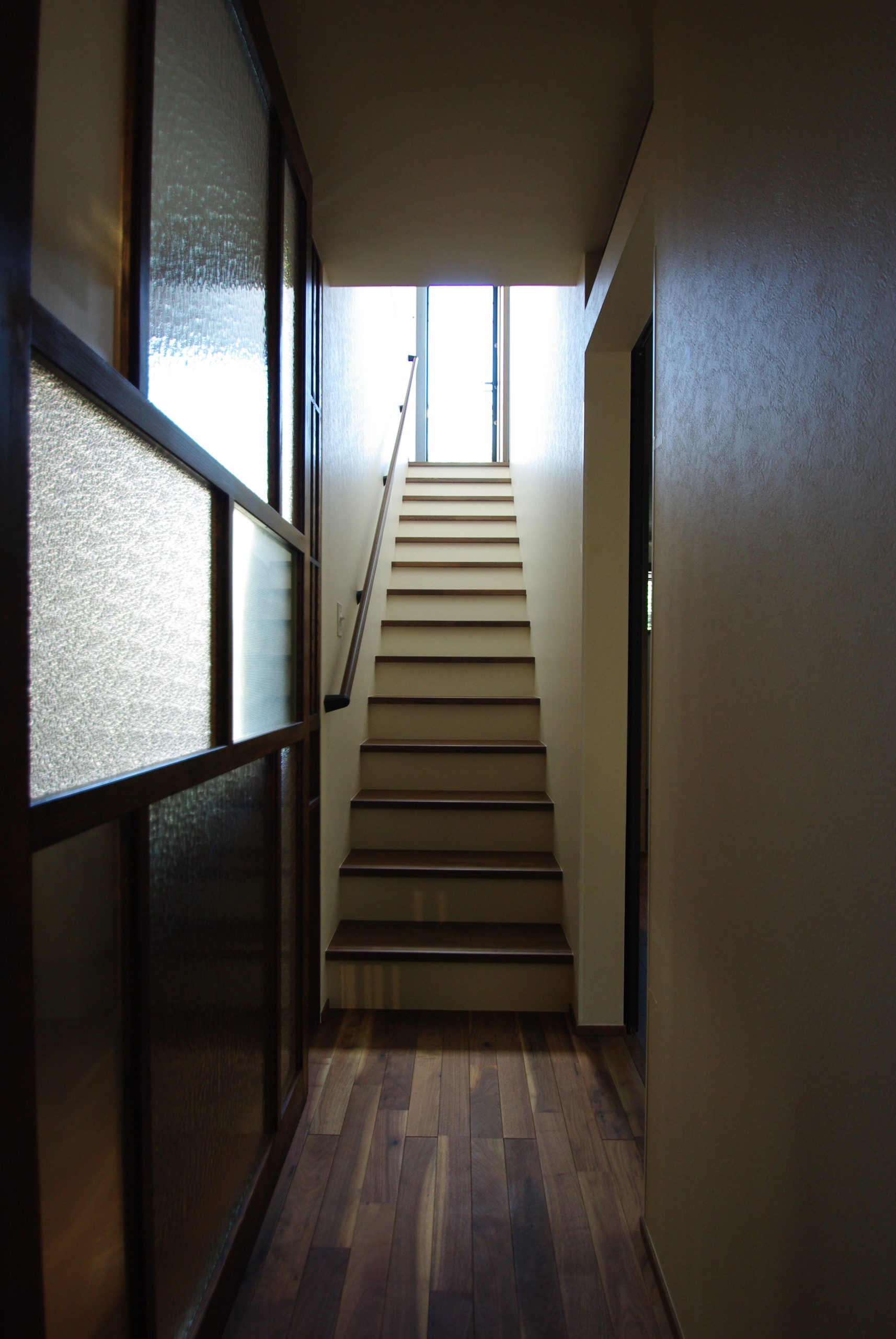 和モダンの外観に、むき出しの太い梁と磨りガラスが呼応する“古民家の懐”。勾配天井のLDKは、階段正面のベランダドアから1階まで光を落とし、奥行きと明るさを両立します。猫と暮らす工夫も随所に。専用ドアと窓辺のキャットウォークで回遊性を高め、爪や動線に配慮した素材計画で日々の負担を軽減。生活感の出やすいキッチンは収納を面でまとめて“ひそやか”に、玄関は磨りガラスの造作窓で外と内の気配を柔らかく接続。軒下の木部と黒アイアンの手摺が外観を引き締め、懐かしさと快適さが今の暮らしに馴染む一邸です。階段まわりの通風と採光を丁寧に整え、季節の陰影が家じゅうをやさしく巡ります。住まいの中心に豊かな余白を確保しました。