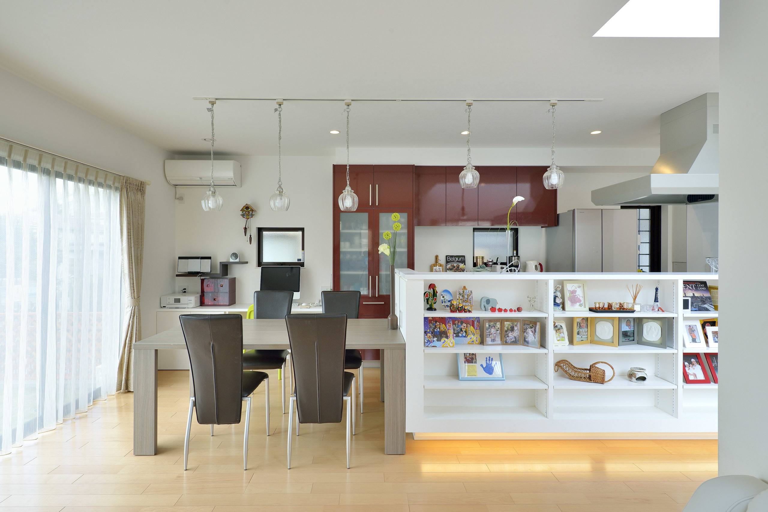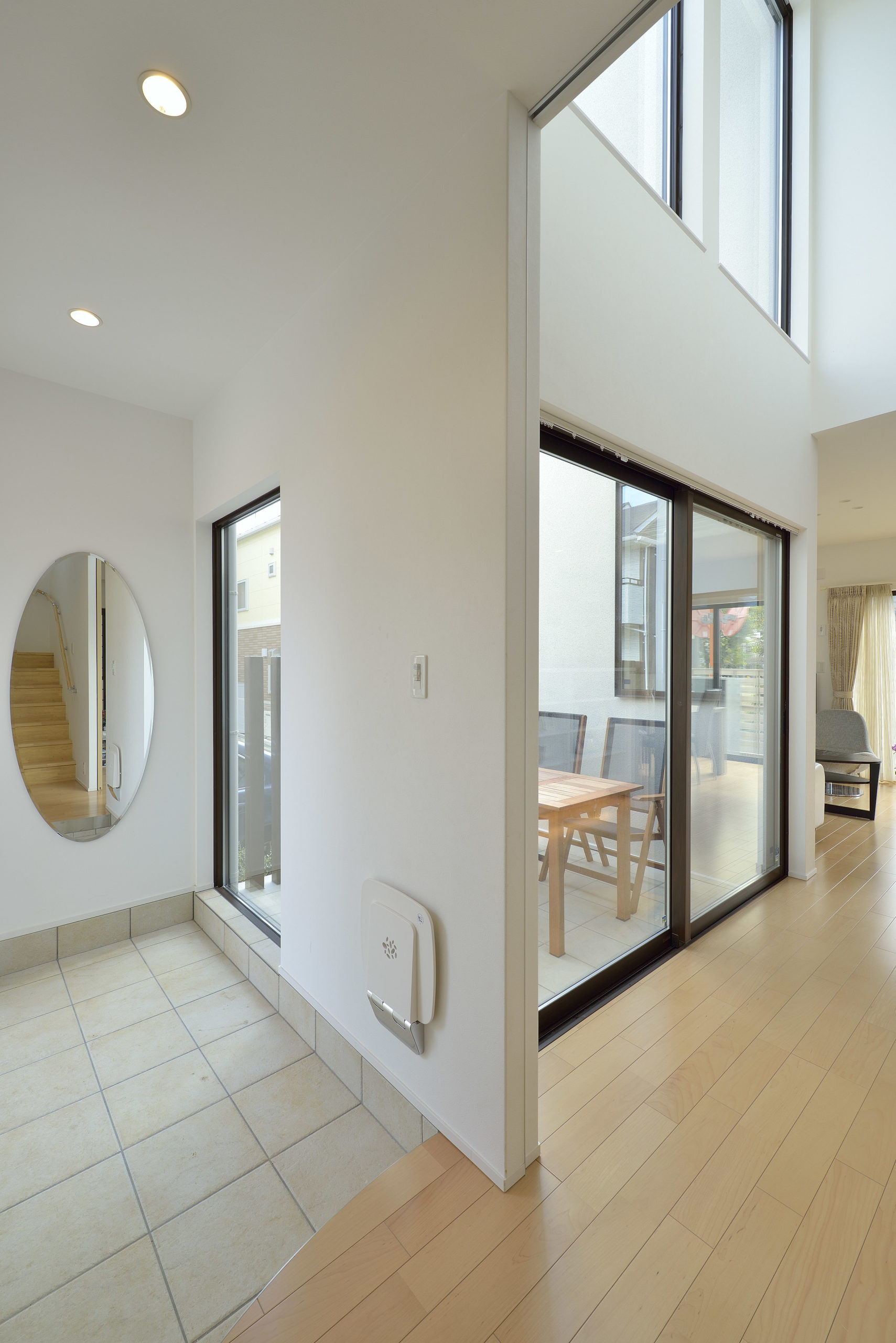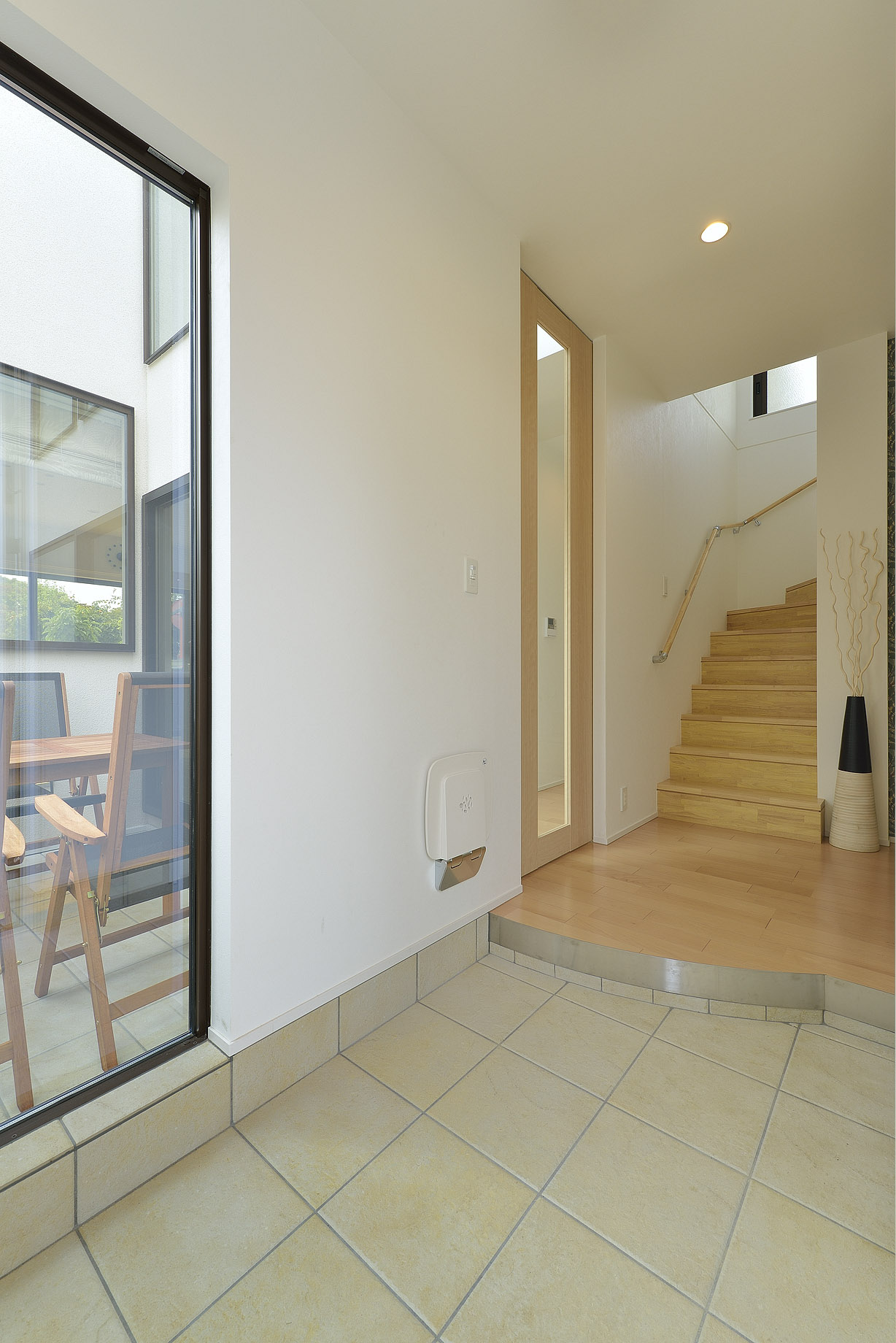 玄関扉を開けてまず目に入る中庭は、リビングダイニング、キッチンのどこにいても見えるように、空間の広がりを感じるように間取りを工夫しています。
