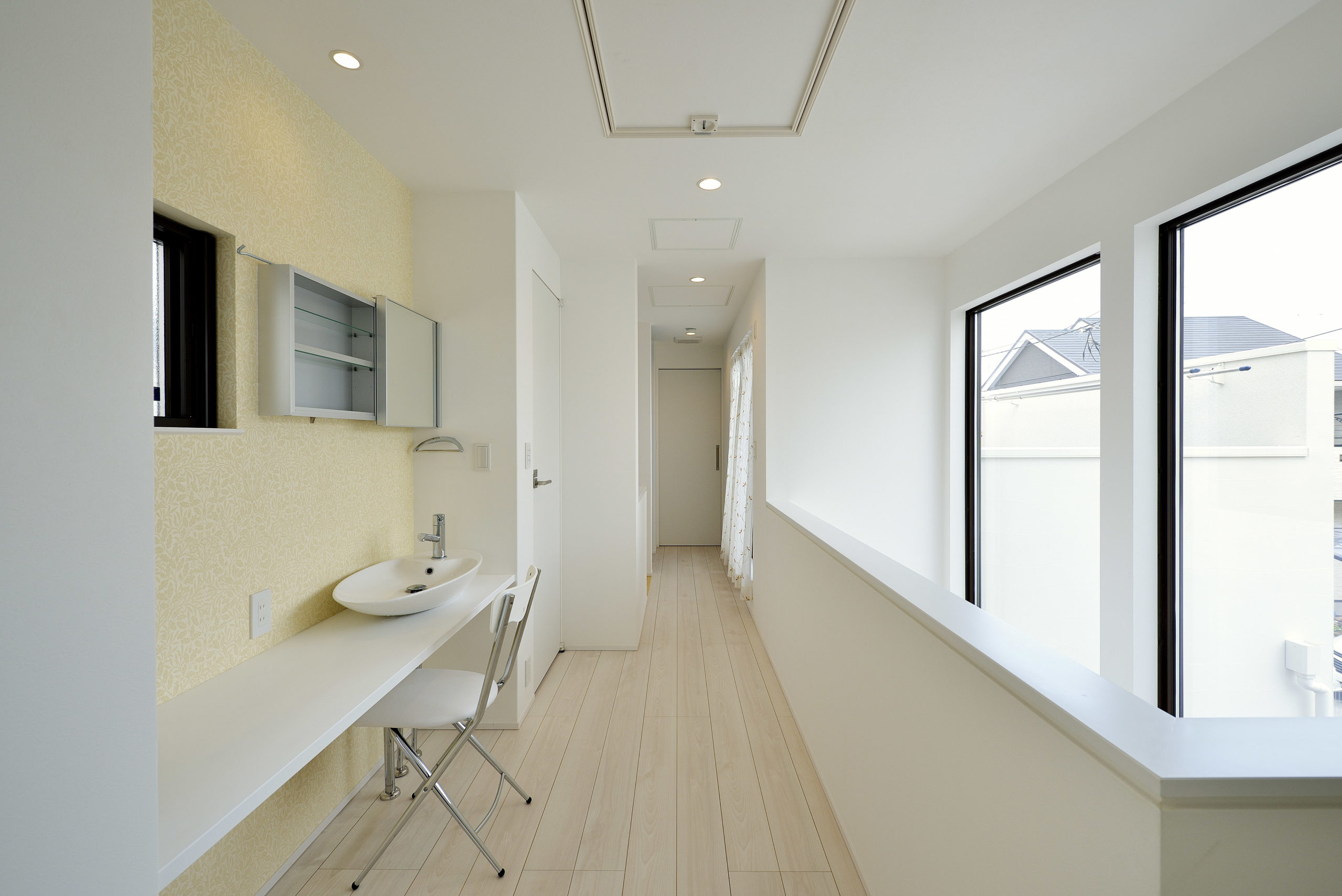 吹き抜けに設けた大きな窓は2階にも開放感と明るさを届けてくれます。