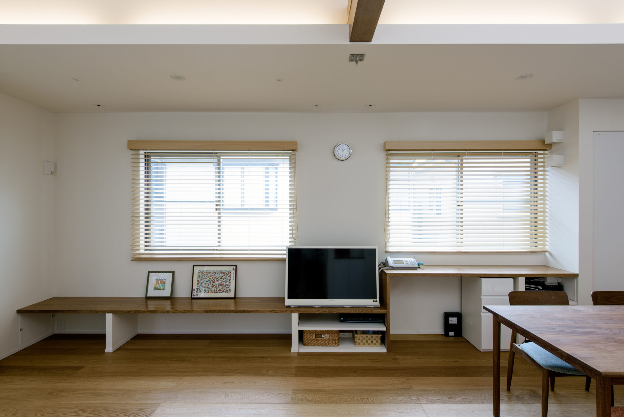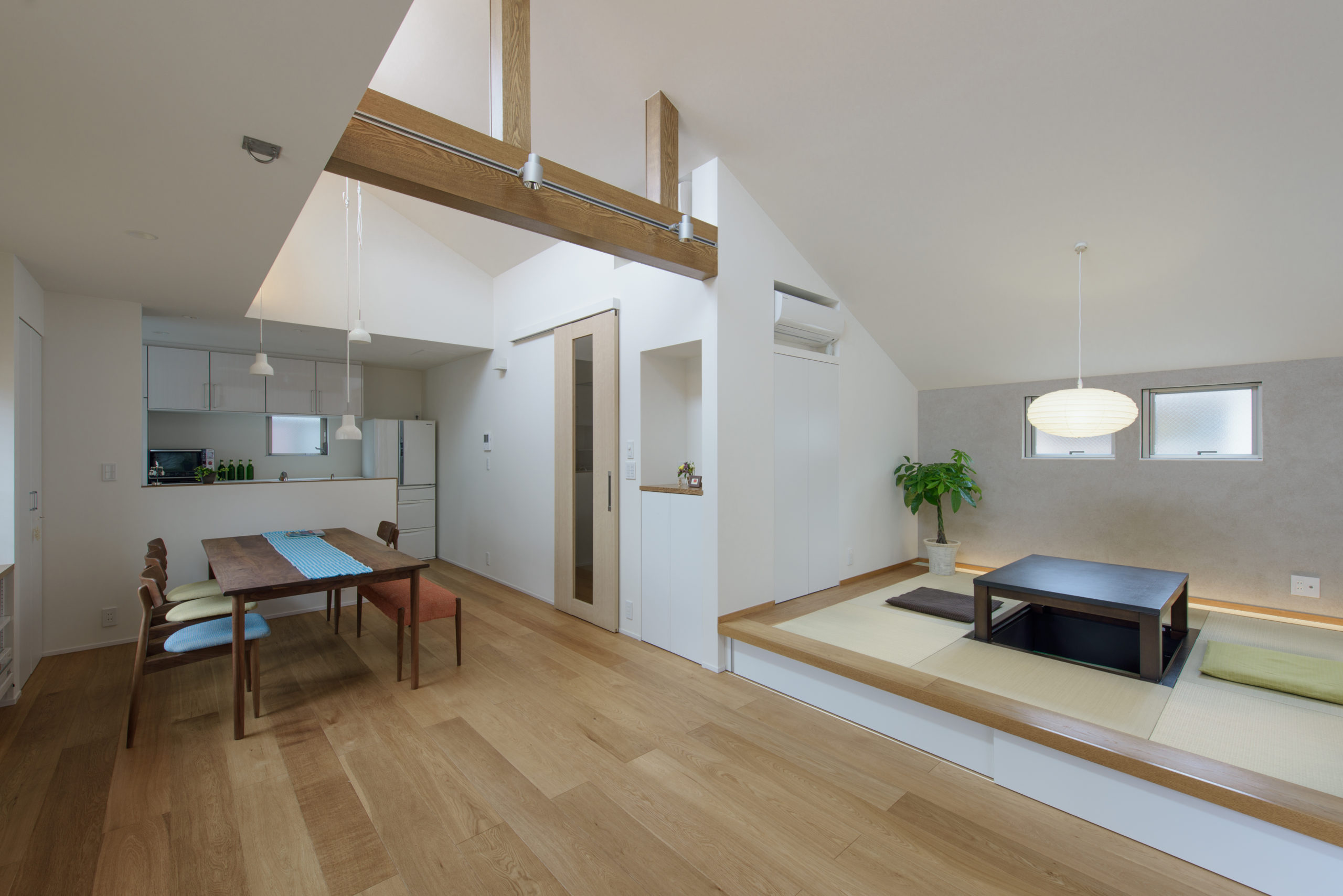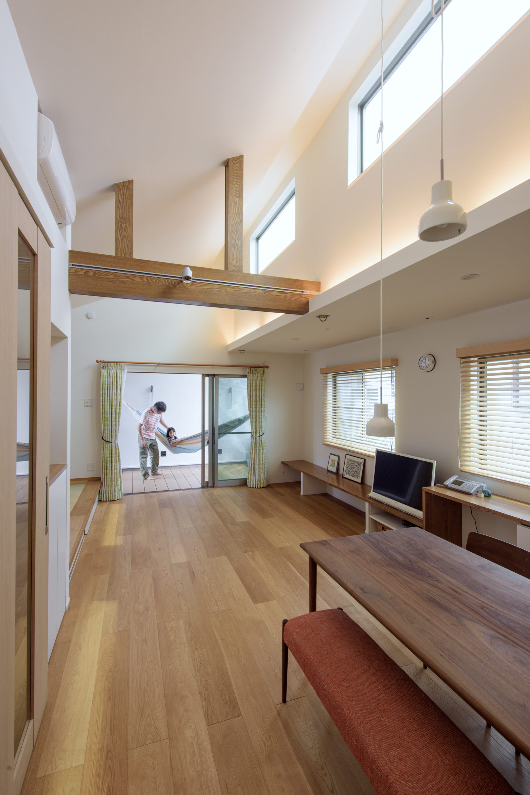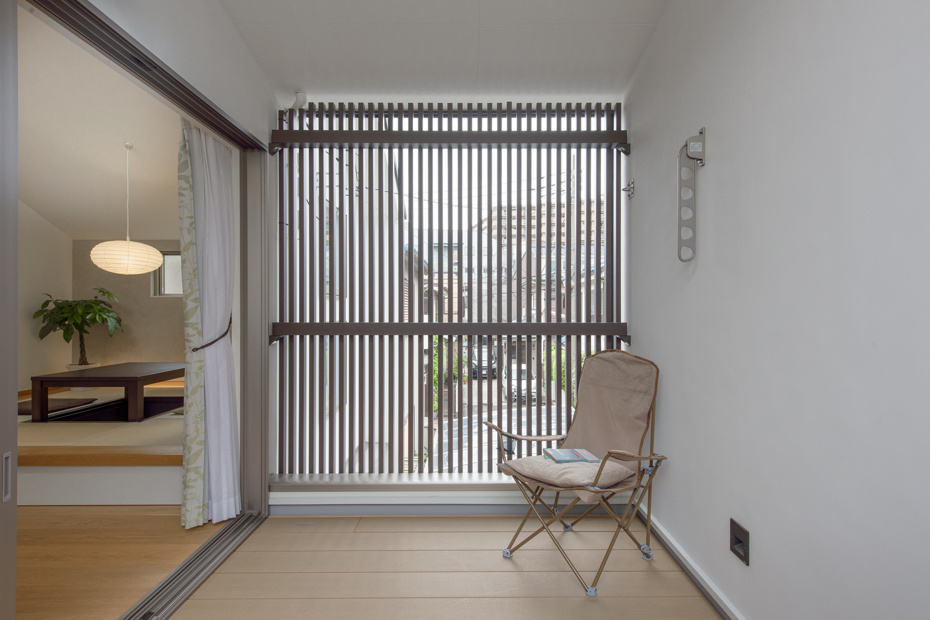 人通りの多い道路に面する敷地で、庭の視線を気にせず外を楽しめるよう、LDKを2階に上げ、その延長に壁と格子で囲った大きなベランダ=“アウトドアリビング”を計画。高窓からやわらかな採光を取り込み、視線の抜けと明るさを両立。掘りごたつの小上がりやワークスペースを一体に配し、家族の居場所が自然につながる。天井付きで雨天時の物干しにも対応し、子どもの遊び場や家族の団欒、週末のBBQまで多目的に活躍。リビング・ダイニングは大きな窓を設けず、高窓で光を採り入れることでプライバシー性と心地よい明るさを確保。3LDK+書庫、東京都練馬区に建つ住まい。