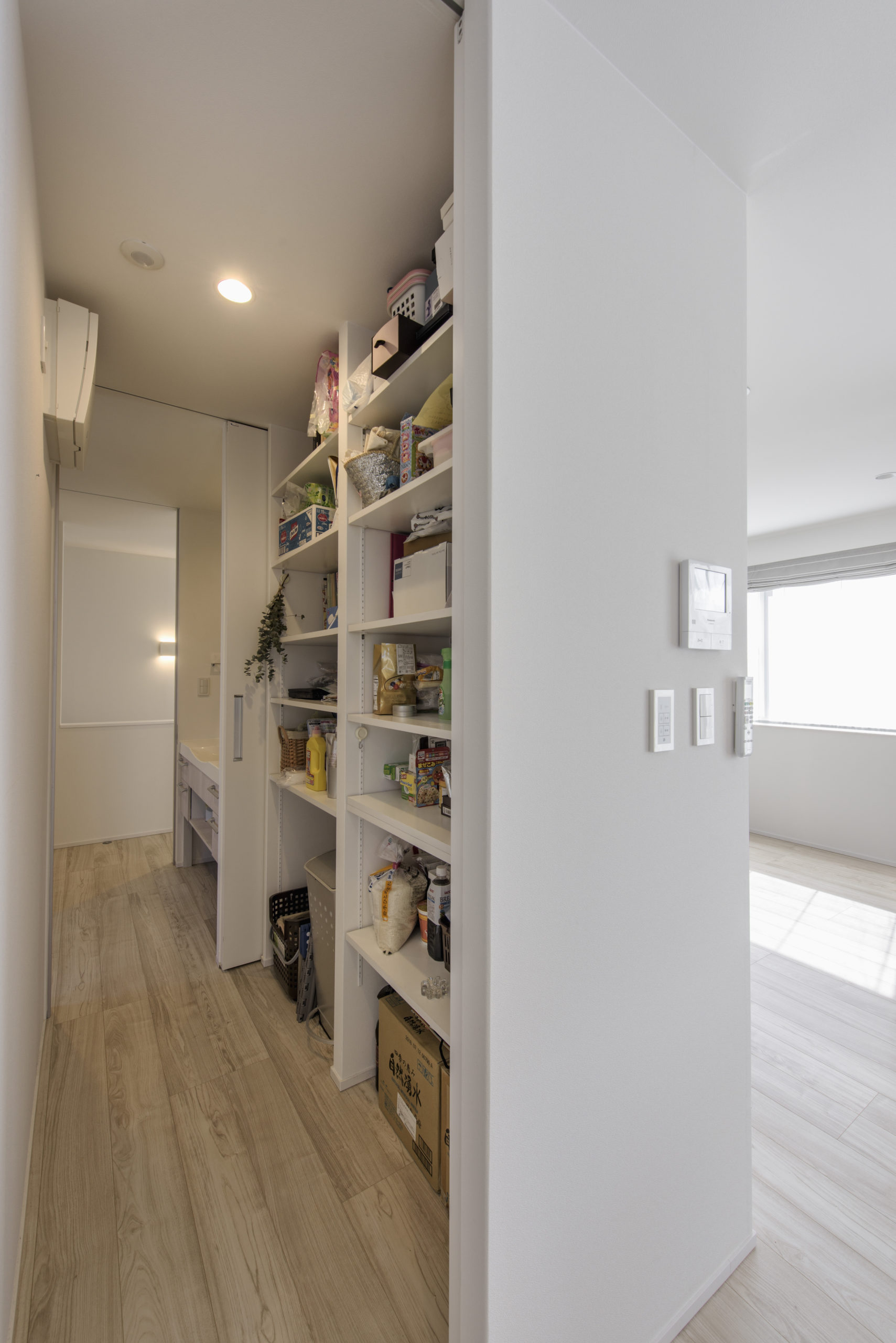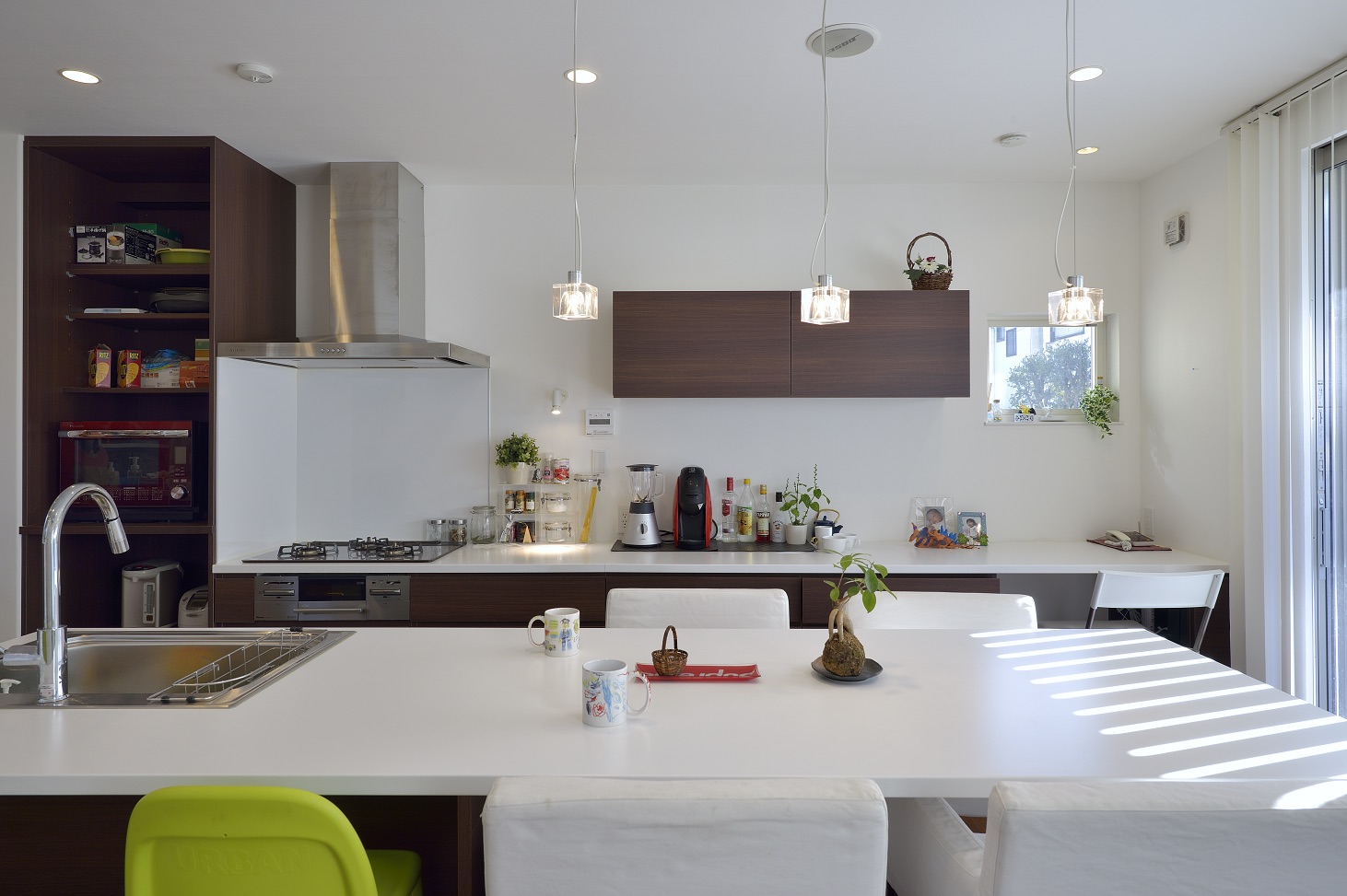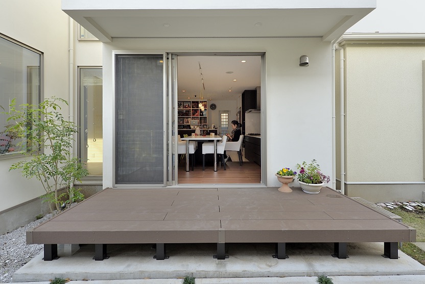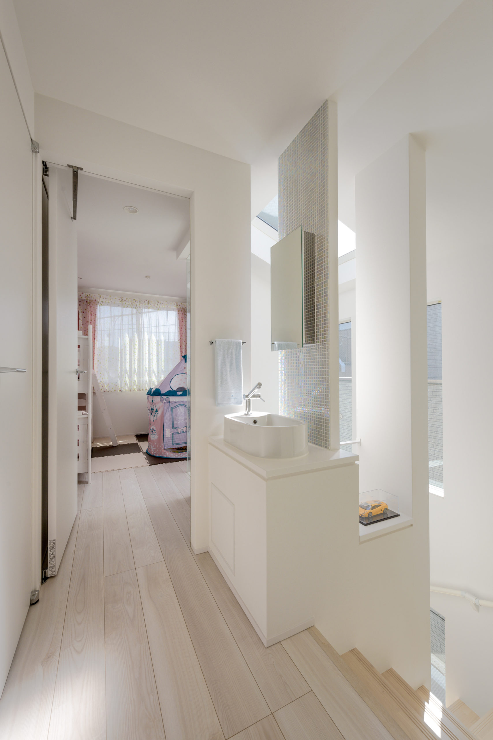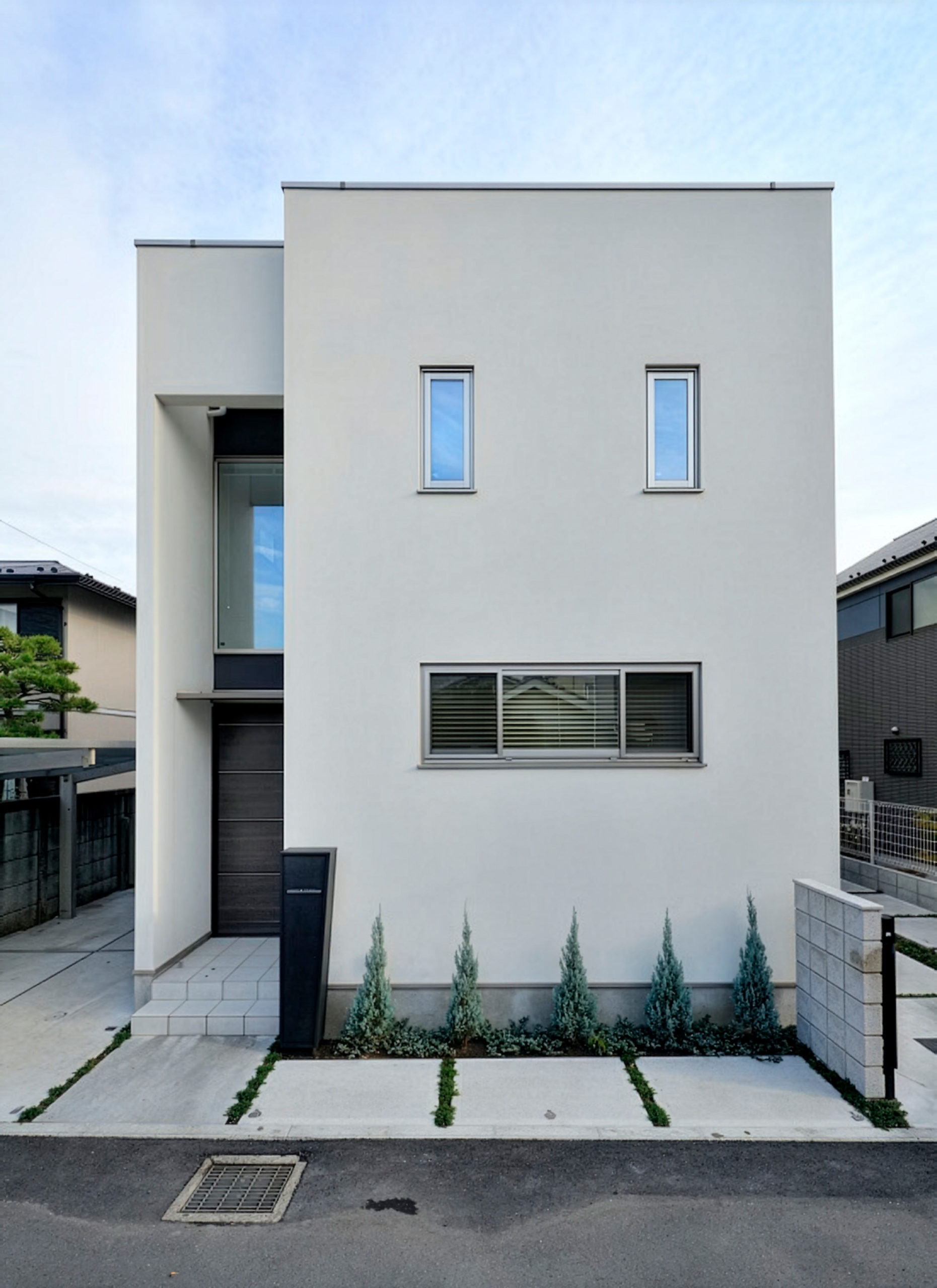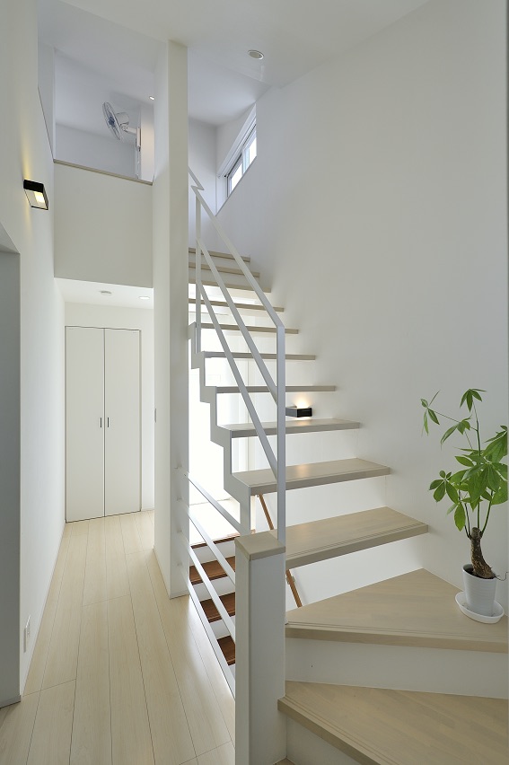 敷地の形状と周辺環境を読み解き、通りからの視線をかわしつつ、南北の風と光を取り込むプラン。LDKは回遊できる動線で、キッチン—パントリー—水まわりが一直線に連携し、調理・洗濯・片付けが自然に循環します。吹抜と高窓が一日を通してやわらかな明るさを配り、オークの無垢床とタイルの質感が穏やかな陰影をつくる。玄関はベビーカーも収まる土間収納を面で計画し、帰宅動線で“片付く”を習慣化。外構は植栽と塀で奥行きを設け、室内外の連続性を楽しむ住まいです。書斎コーナーや室内干し動線も設け、日常の小さな不便を先回りして解消。色数を絞り、素材と光で静かな上質さを育てます。家族の時間が、穏やかに積み重なる器の住まいです。