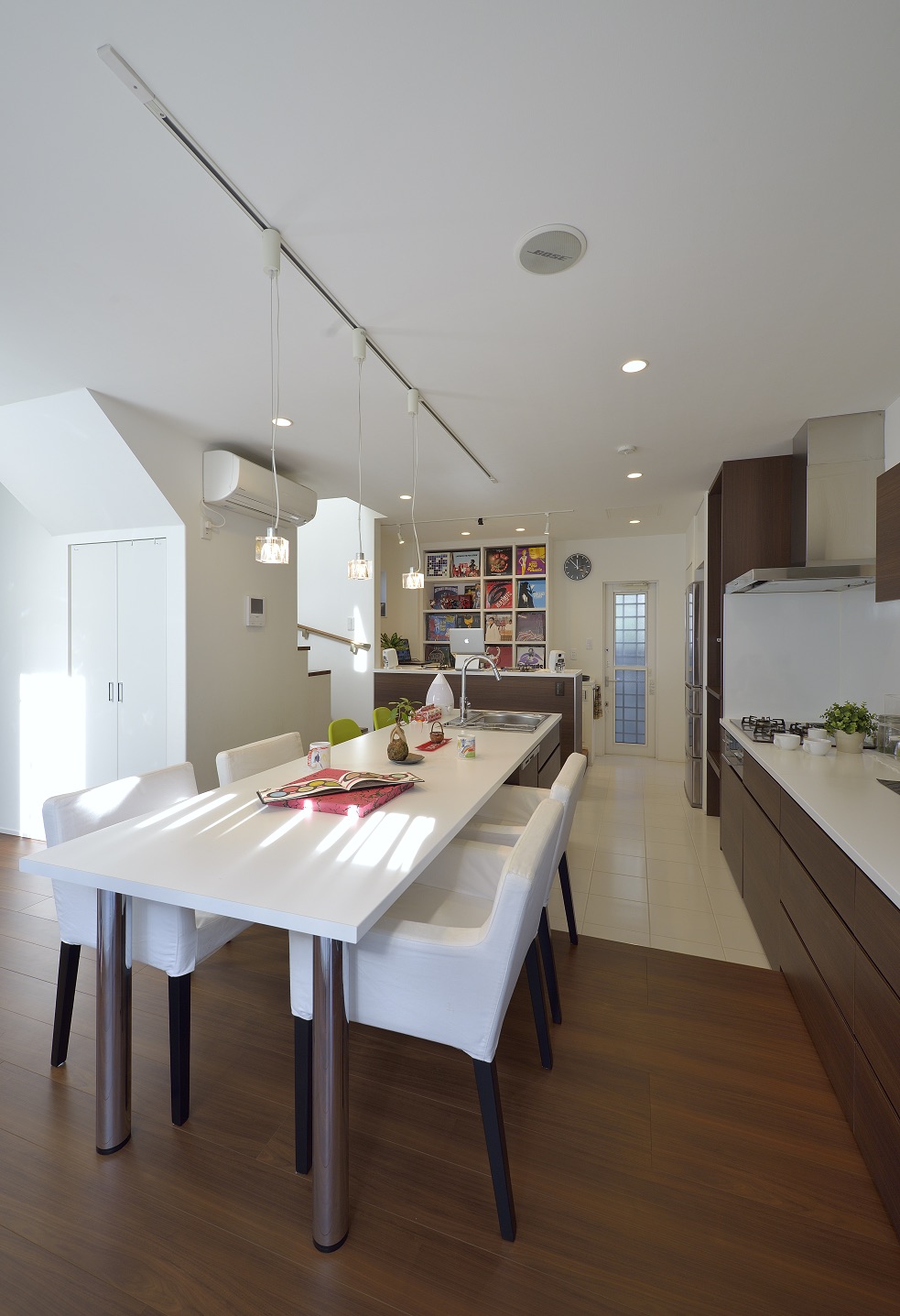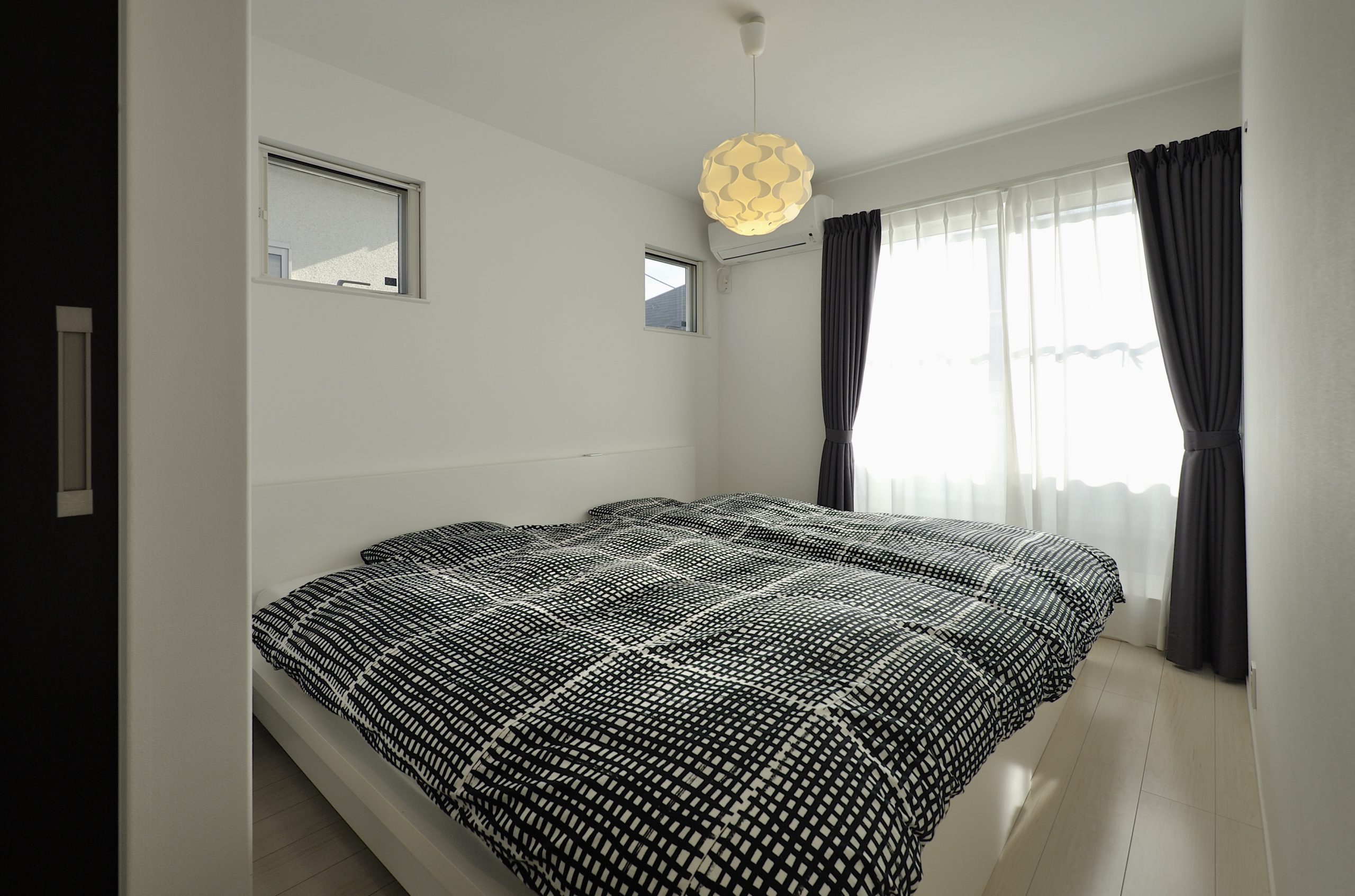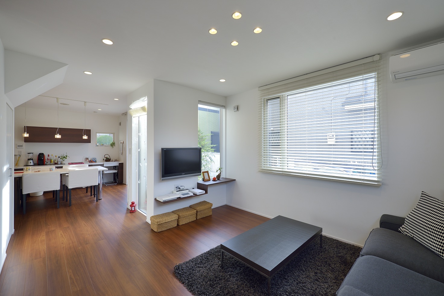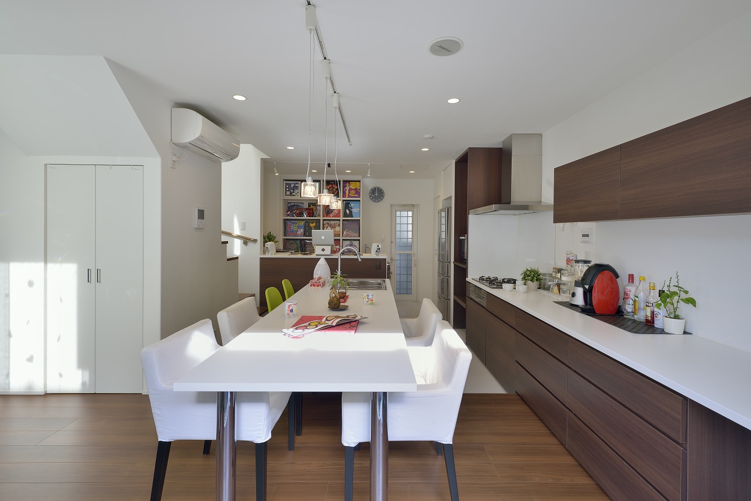 敷地の形状と周辺環境を読み解き、通りからの視線をかわしつつ、南北の風と光を取り込むプラン。LDKは回遊できる動線で、キッチン—パントリー—水まわりが一直線に連携し、調理・洗濯・片付けが自然に循環します。吹抜と高窓が一日を通してやわらかな明るさを配り、オークの無垢床とタイルの質感が穏やかな陰影をつくる。玄関はベビーカーも収まる土間収納を面で計画し、帰宅動線で“片付く”を習慣化。外構は植栽と塀で奥行きを設け、室内外の連続性を楽しむ住まいです。書斎コーナーや室内干し動線も設け、日常の小さな不便を先回りして解消。色数を絞り、素材と光で静かな上質さを育てます。家族の時間が、穏やかに積み重なる器の住まいです。