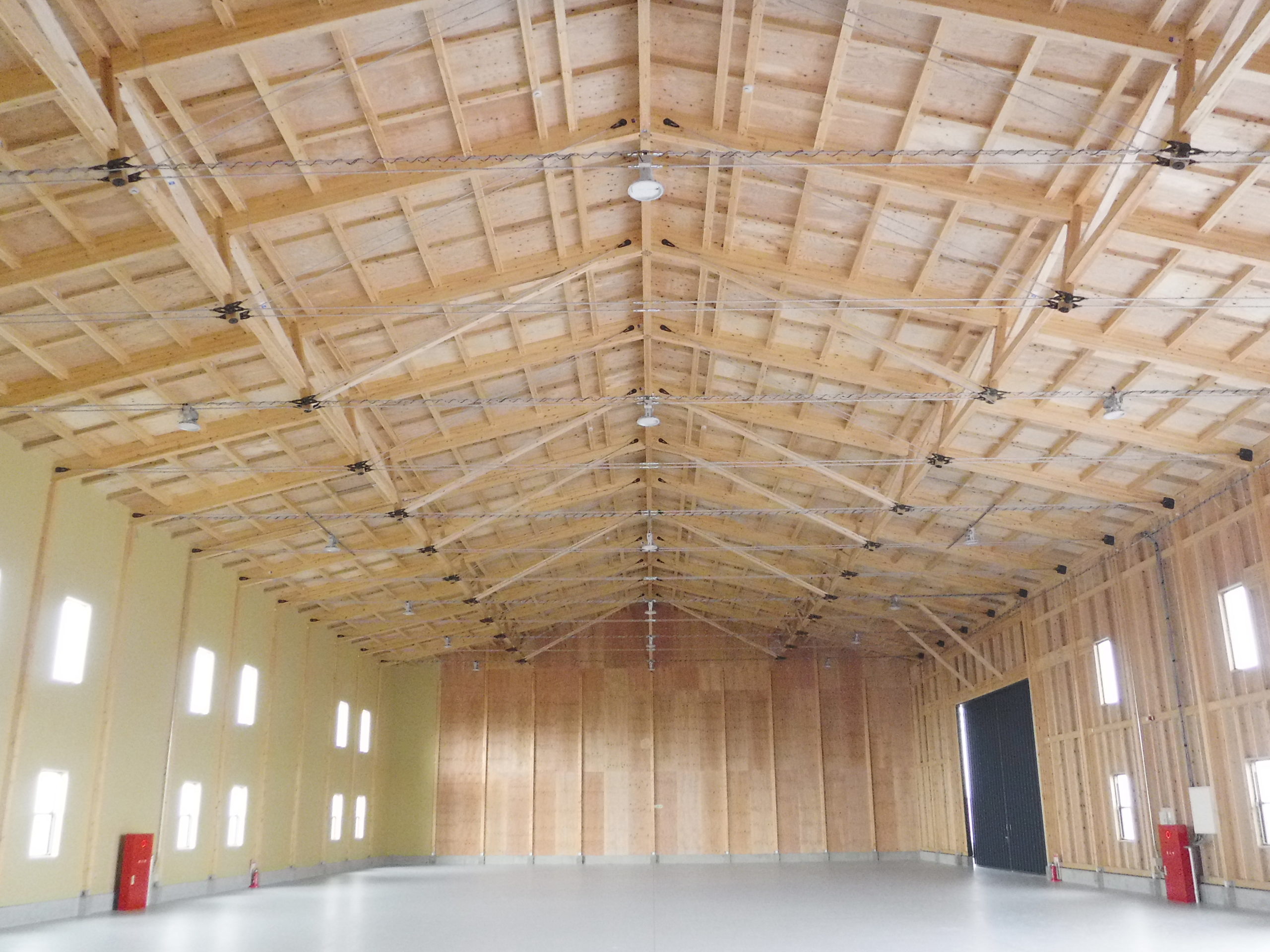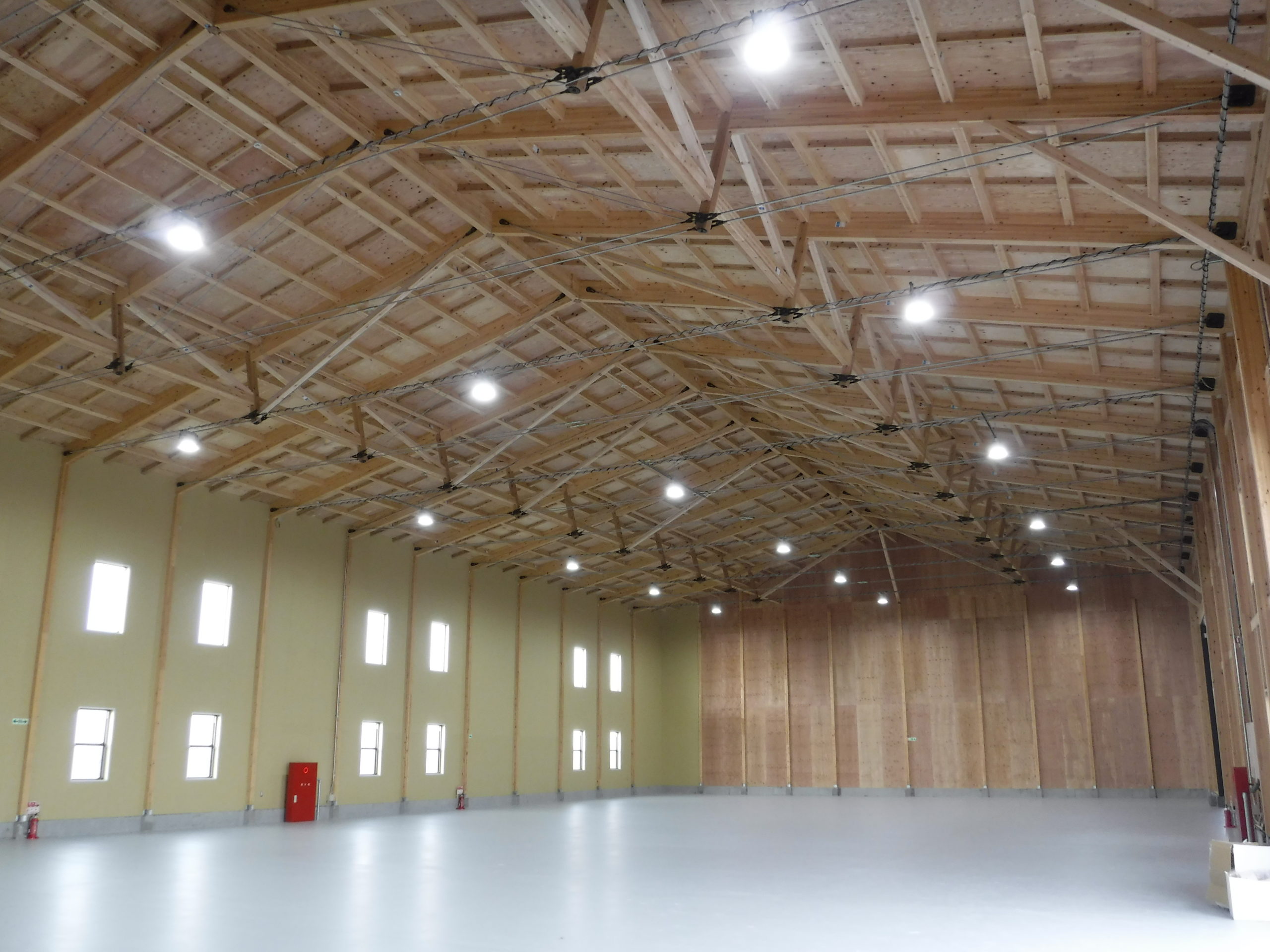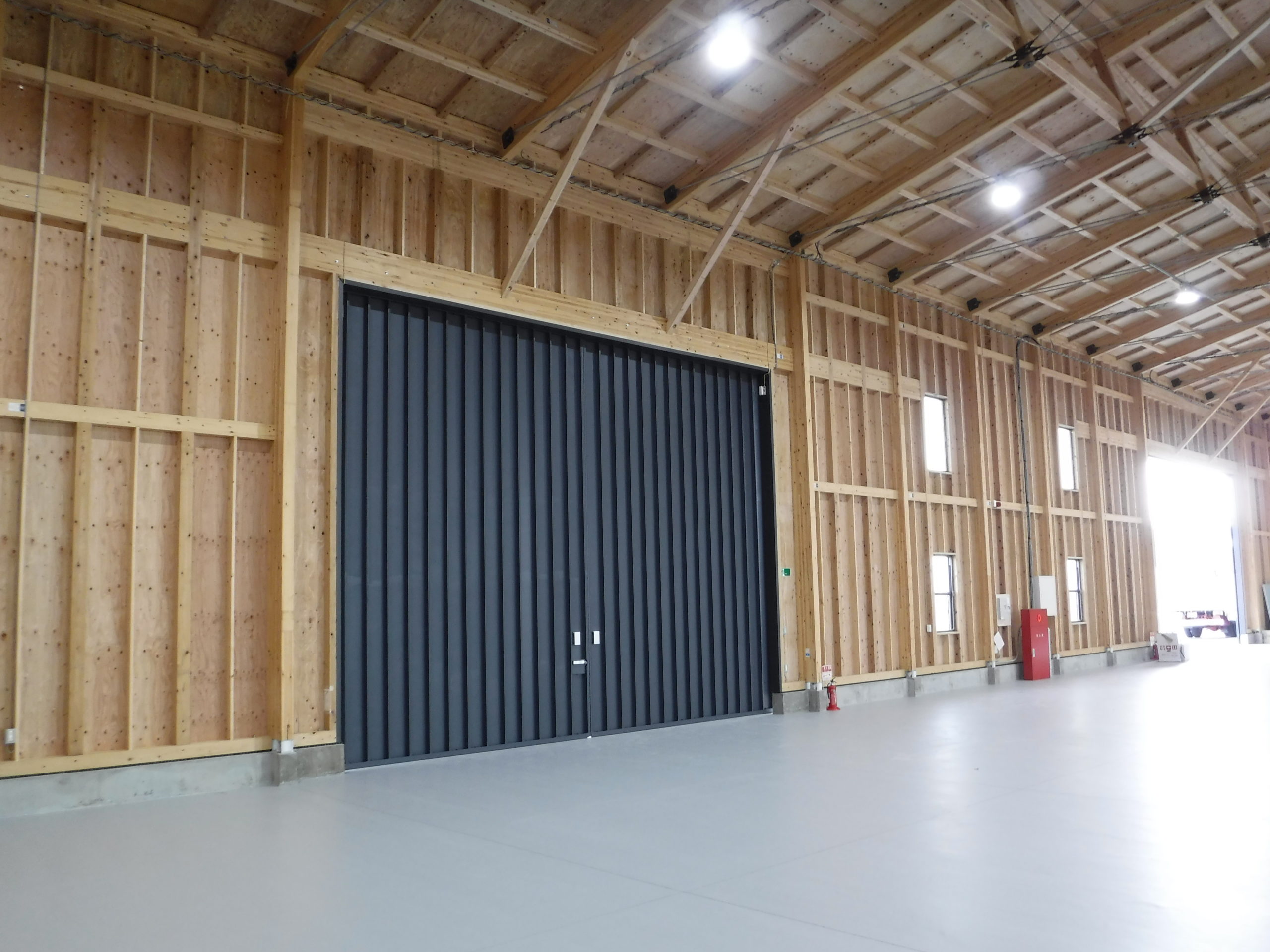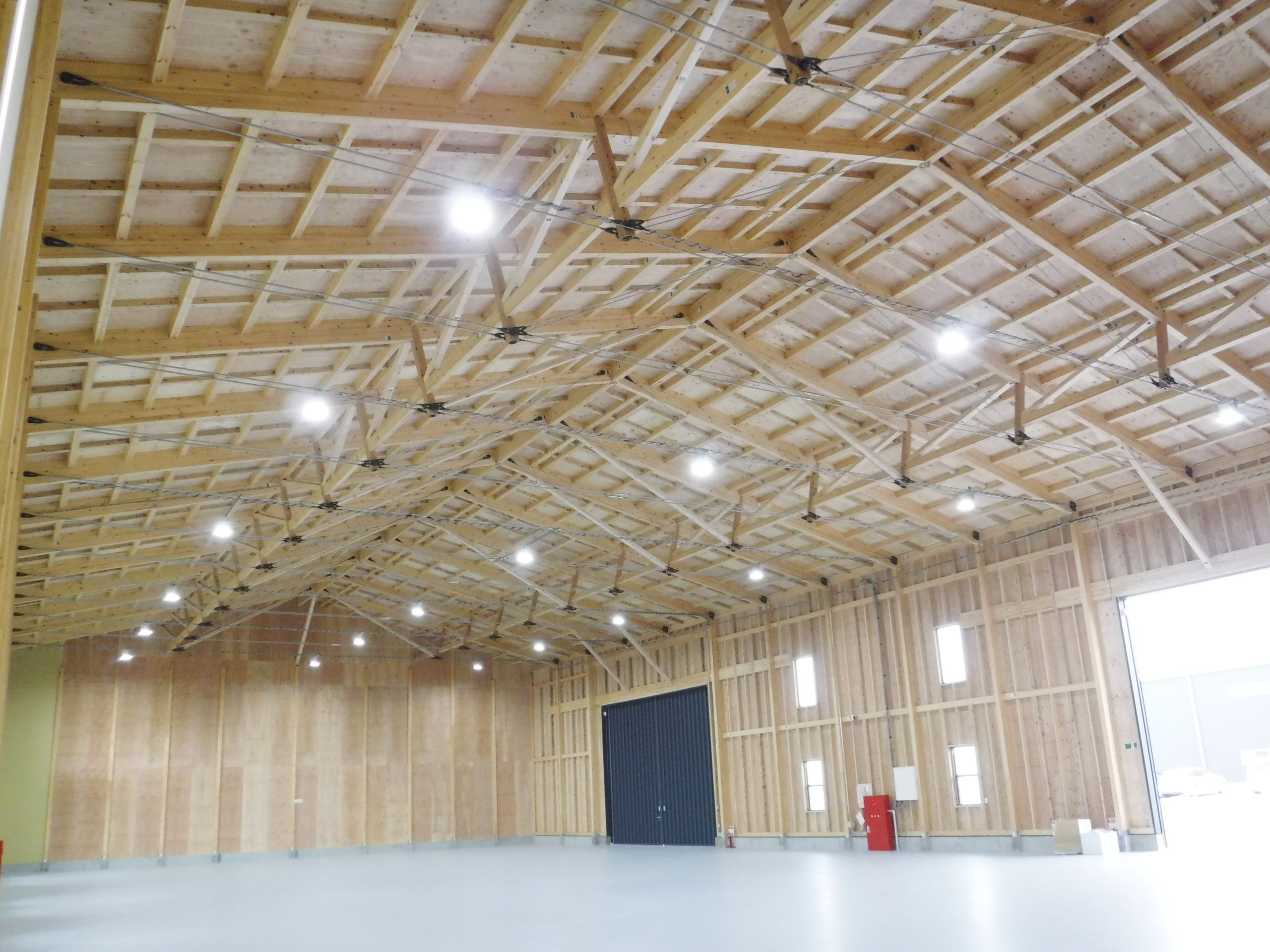 木造の倉庫に、ATAのハイブリッドトラスを採用。短手20m・長手40mまで柱を設けない大スパンを実現し、フォークリフトの旋回やラック計画の自由度を高めました。鶴崎工務店も所属する恒栄マツモトグループはATA構造体加工の認定を受けており、自社で構造体の供給が可能。設計—加工—施工をグループ内で一貫させ、品質とコストを安定化。木の軽さと剛性をいかした架構は、地震時の減衰にも寄与。防火・断熱・採光計画をバランスさせ、明るく温度ムラの少ない作業環境を実現。将来の設備更新や増設にも柔軟に対応できる、持続可能な木造倉庫です。無柱空間により見通しが良く、安全な車両動線を確保。耐久性の高い塗床で清掃性も向上しています。木質の温かさも魅力です。