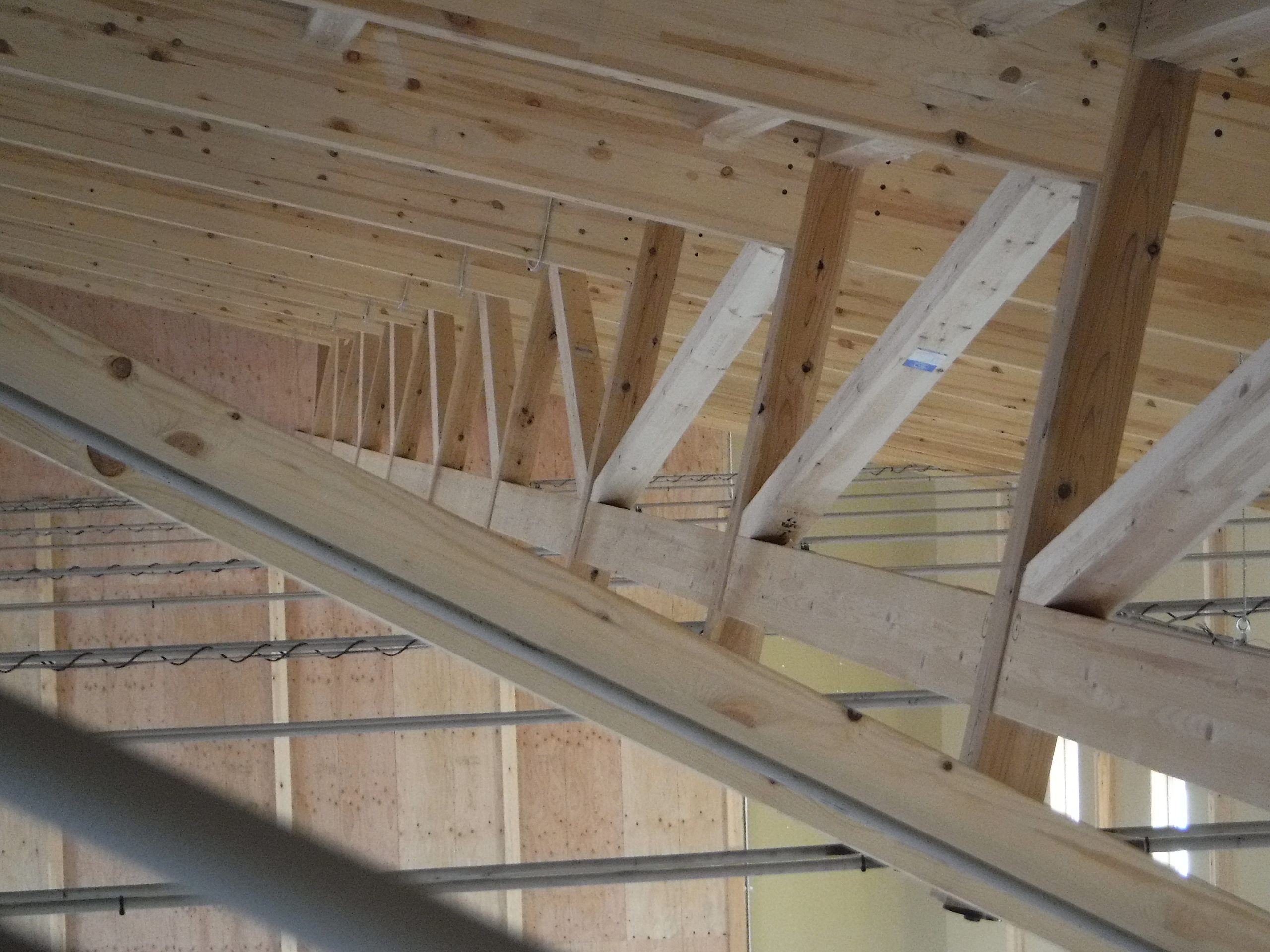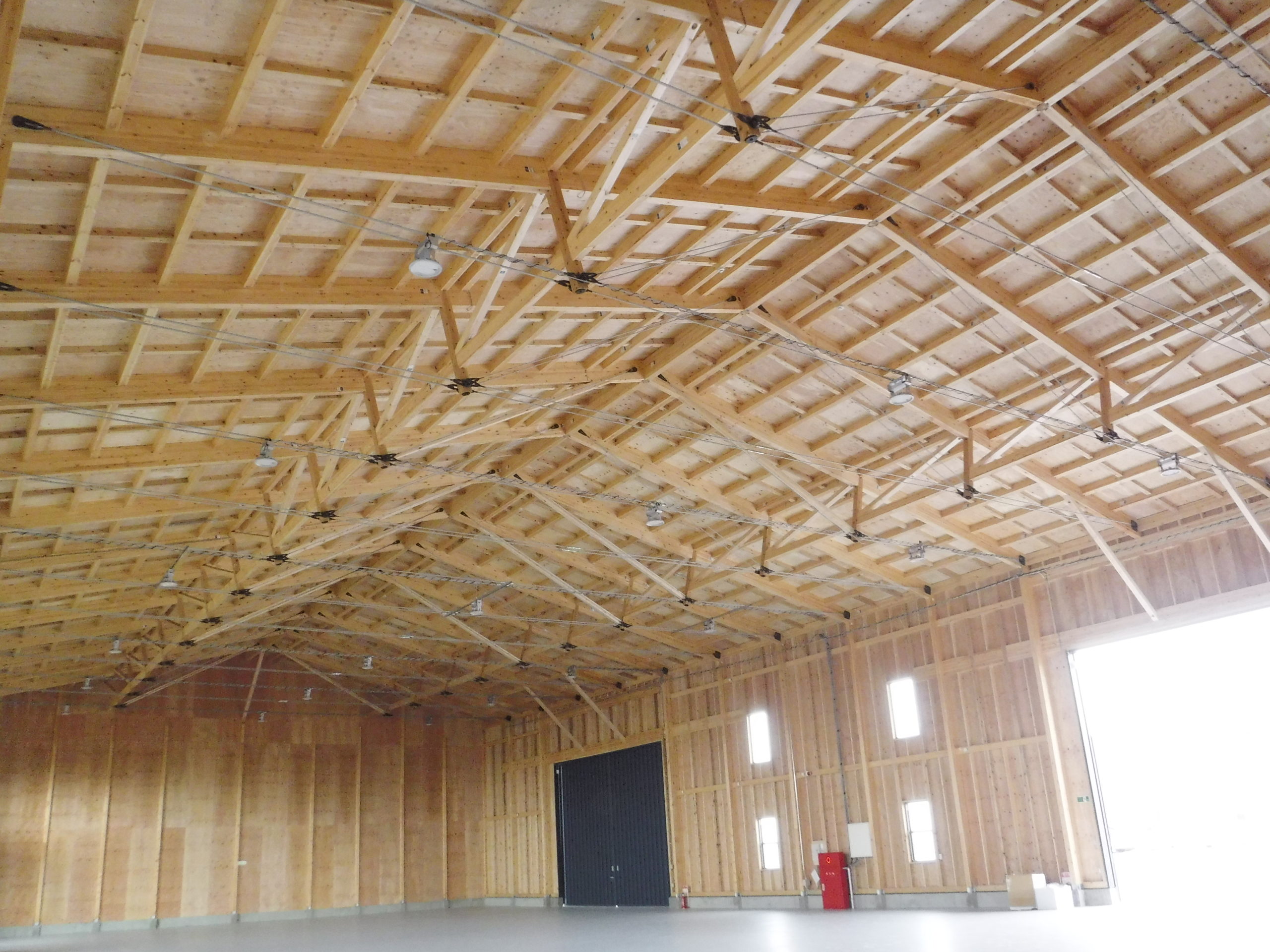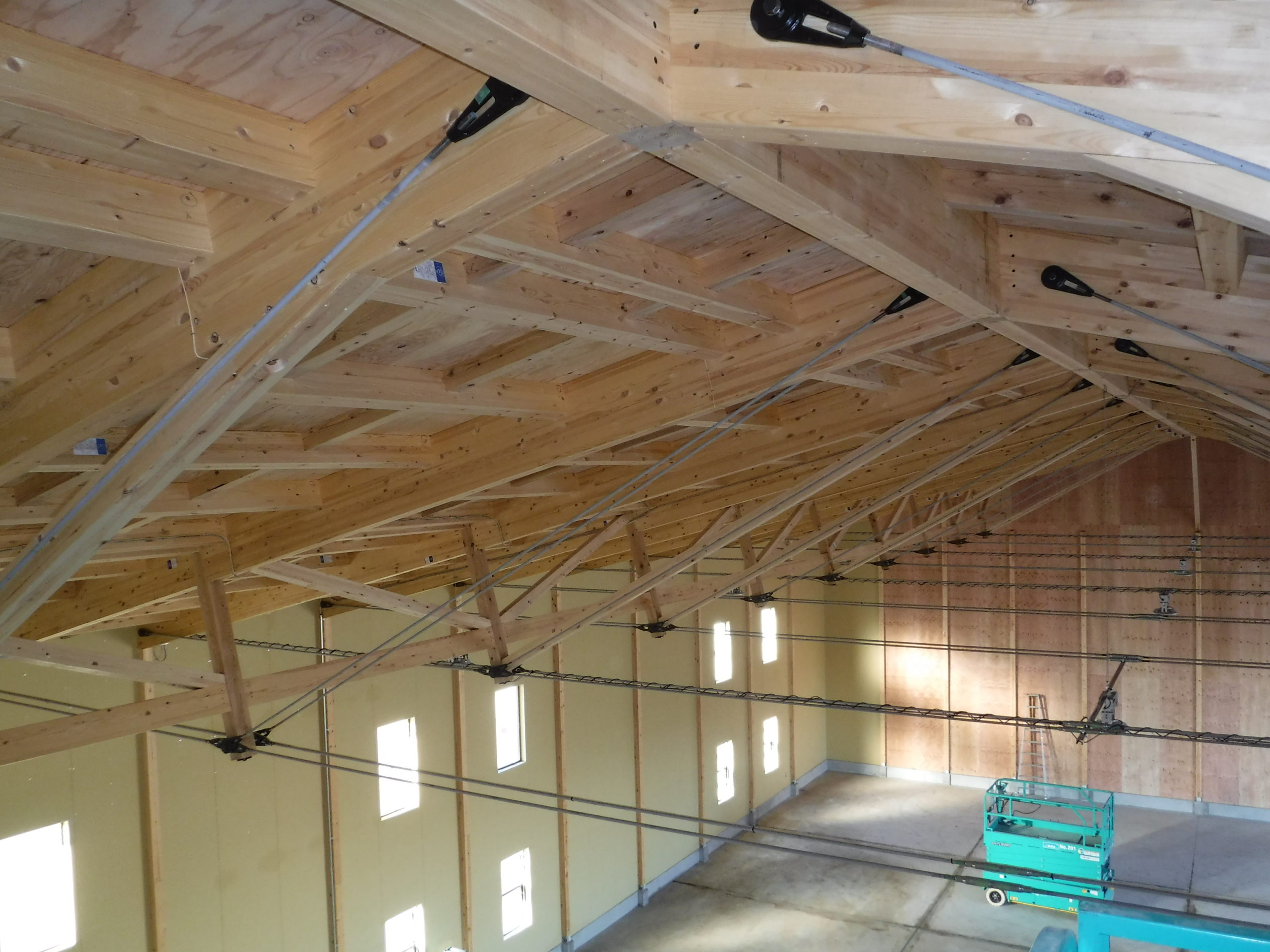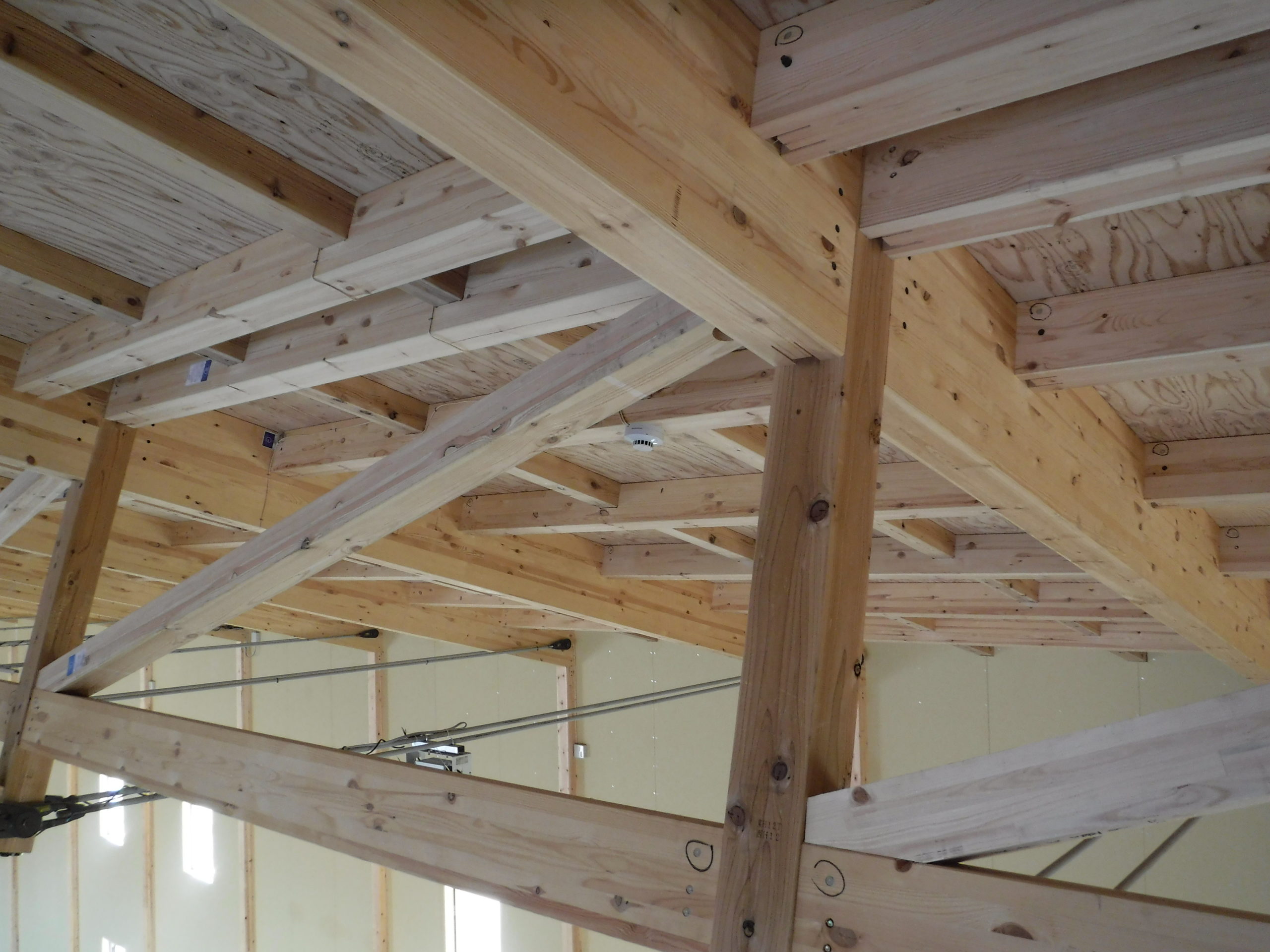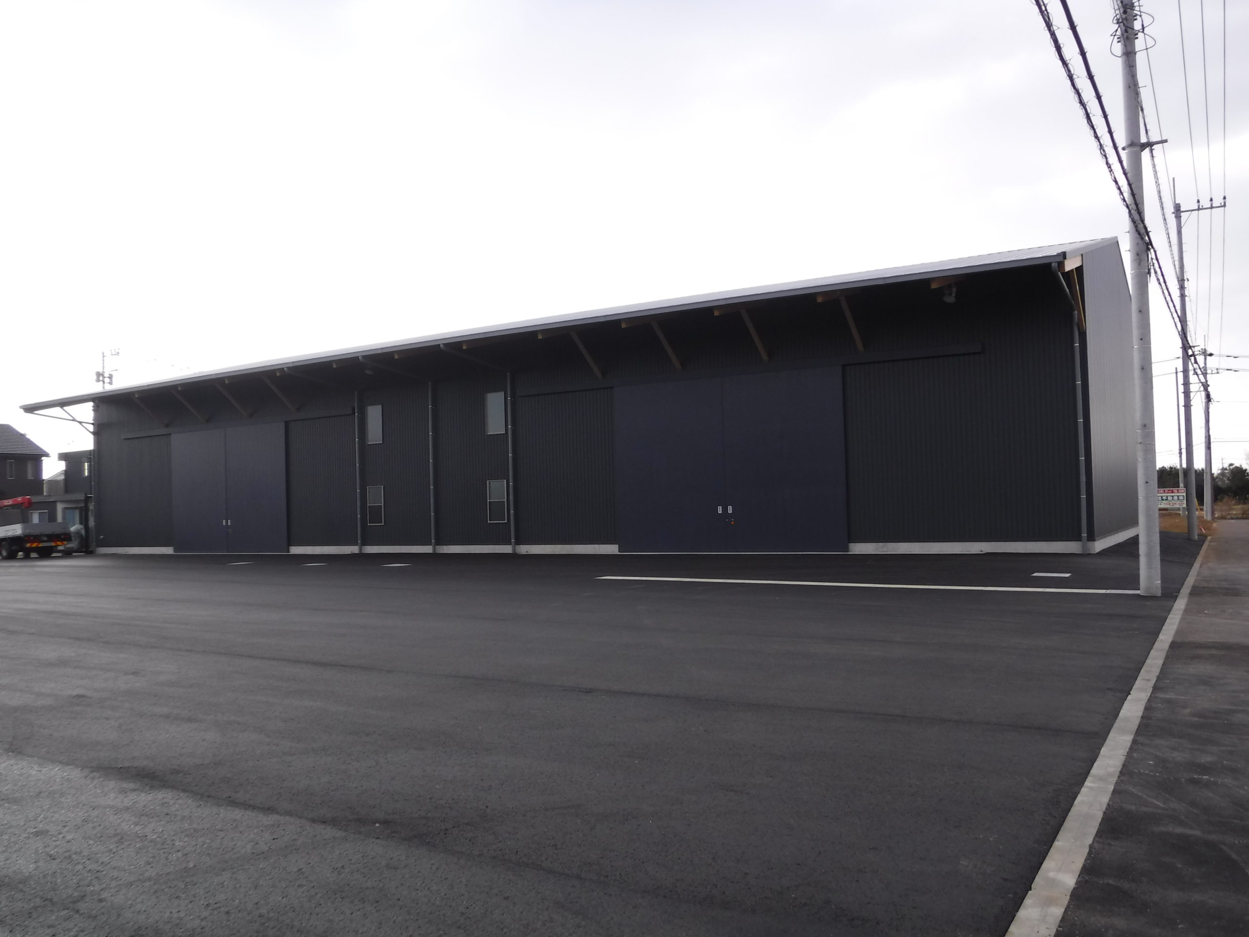 木造の倉庫に、ATAのハイブリッドトラスを採用。短手20m・長手40mまで柱を設けない大スパンを実現し、フォークリフトの旋回やラック計画の自由度を高めました。鶴崎工務店も所属する恒栄マツモトグループはATA構造体加工の認定を受けており、自社で構造体の供給が可能。設計—加工—施工をグループ内で一貫させ、品質とコストを安定化。木の軽さと剛性をいかした架構は、地震時の減衰にも寄与。防火・断熱・採光計画をバランスさせ、明るく温度ムラの少ない作業環境を実現。将来の設備更新や増設にも柔軟に対応できる、持続可能な木造倉庫です。無柱空間により見通しが良く、安全な車両動線を確保。耐久性の高い塗床で清掃性も向上しています。木質の温かさも魅力です。