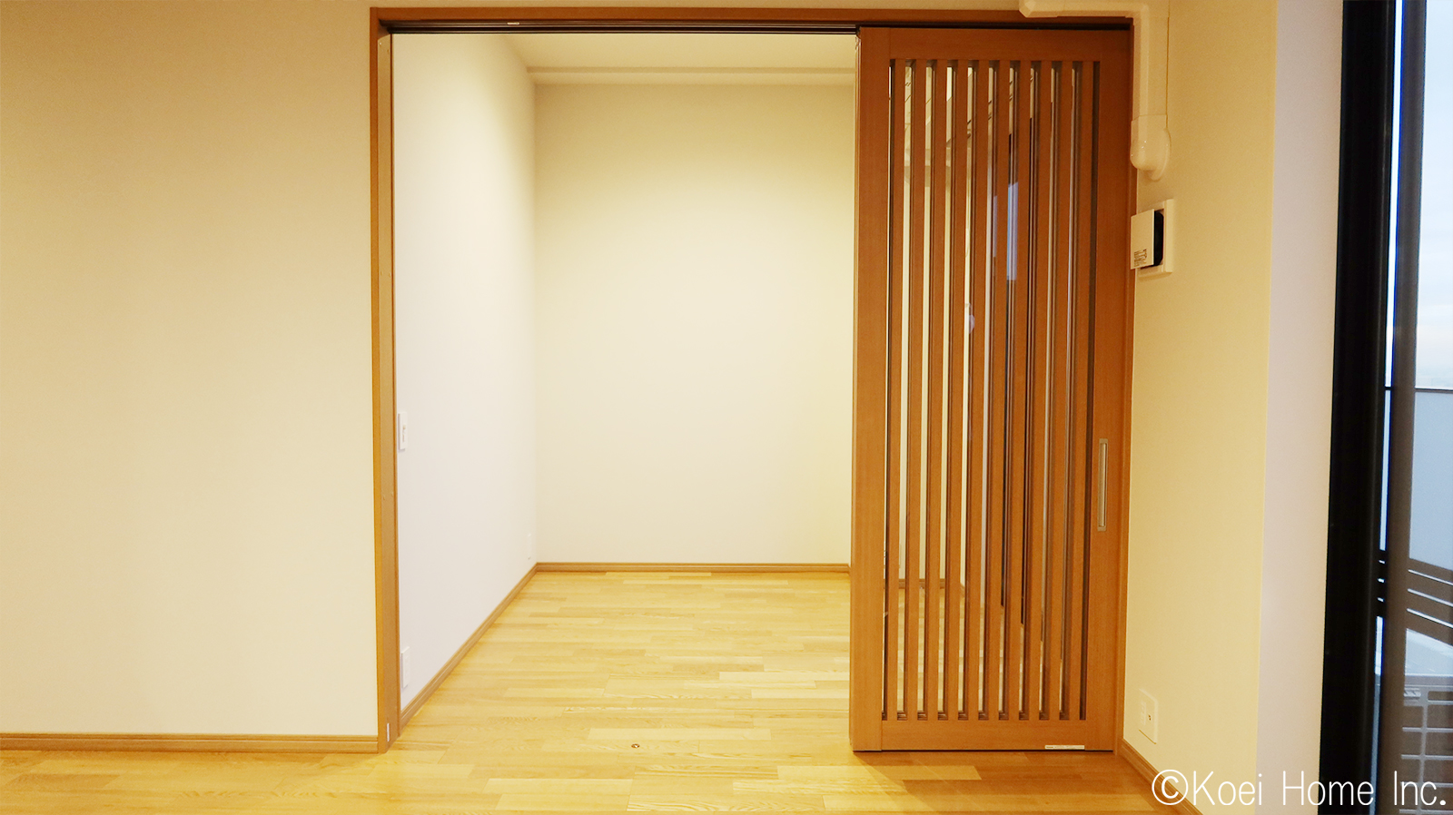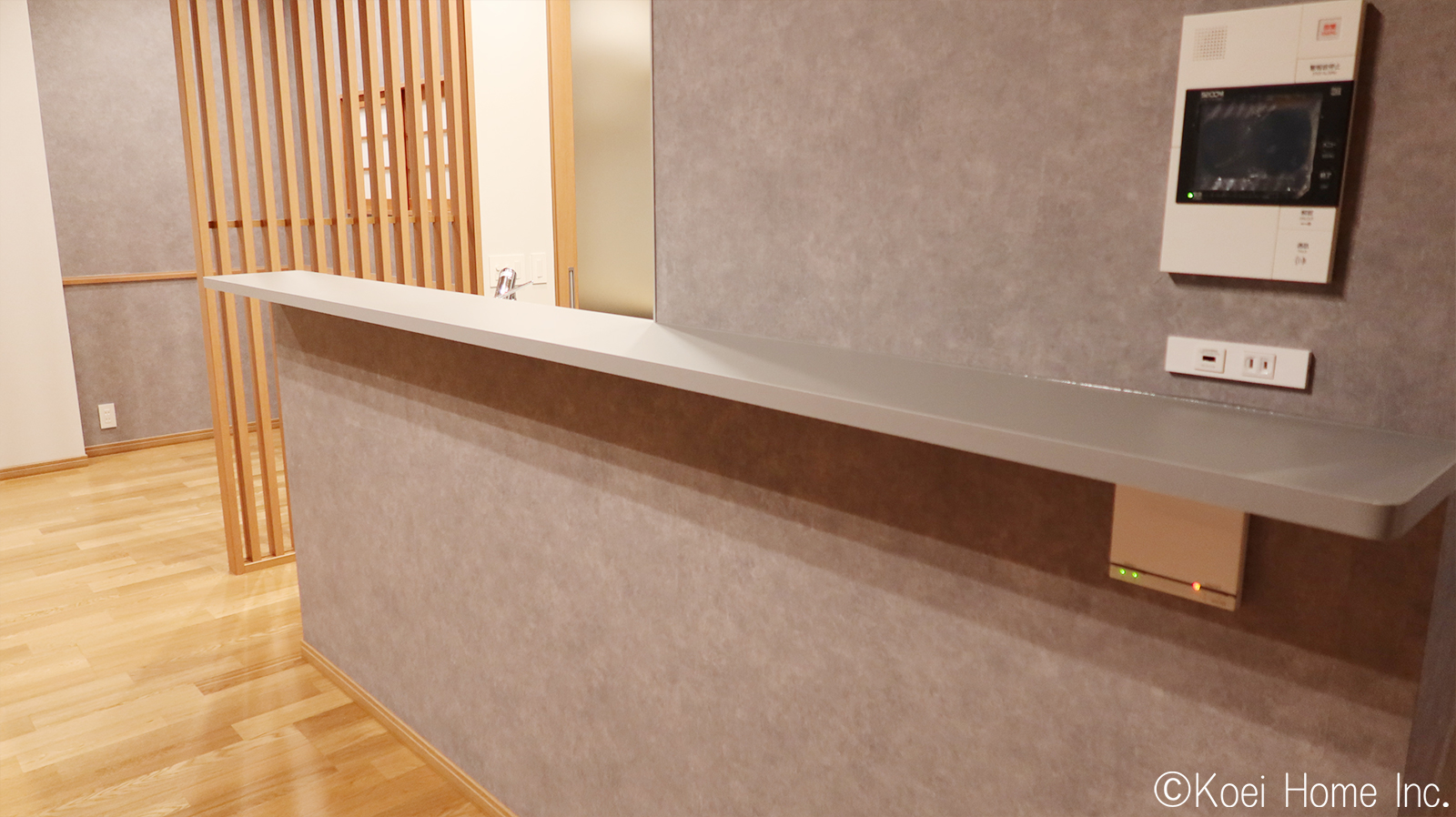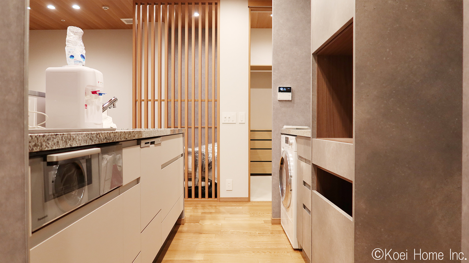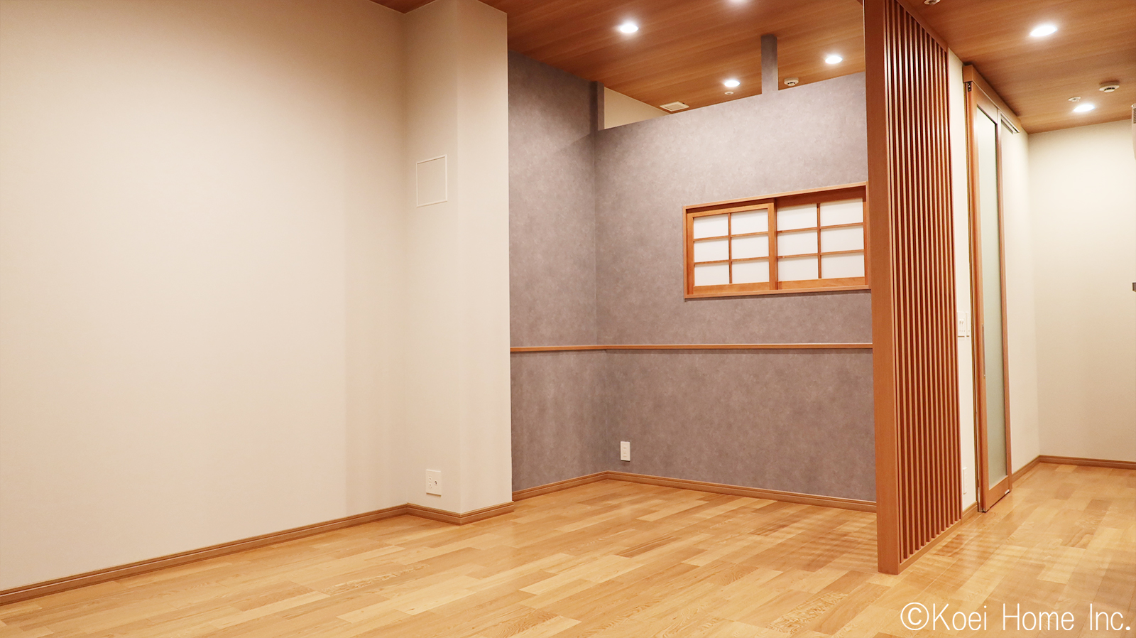 約70㎡のマンションを、海外で暮らすような“ホテルライク”に全面リノベ。もとの3LDKは洋室の壁を取り払い、約17畳の一体LDKへ。浴室はニッコー〈バンクチュール〉のオーダーシステムで約2倍に拡張し、シャワーブースを2基備えた特別なバス空間に更新。キッチンは既存を活かし扉色を貼替、背面カップボードに海外製洗濯乾燥機を組込み、静音家電で家事のストレスを軽減。突き板パネルや木目天井で奥行きを強調し、3LDK→1LDK+Sへ間取り最適化。玄関と廊下は遮りを減らして明るく、洋室にいても家族のつながりを感じられる構成に。突き板は背面から天井へ連続させ、空間をより広く高く見せています。