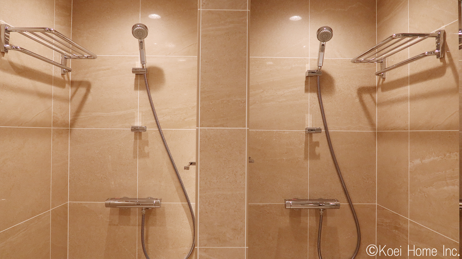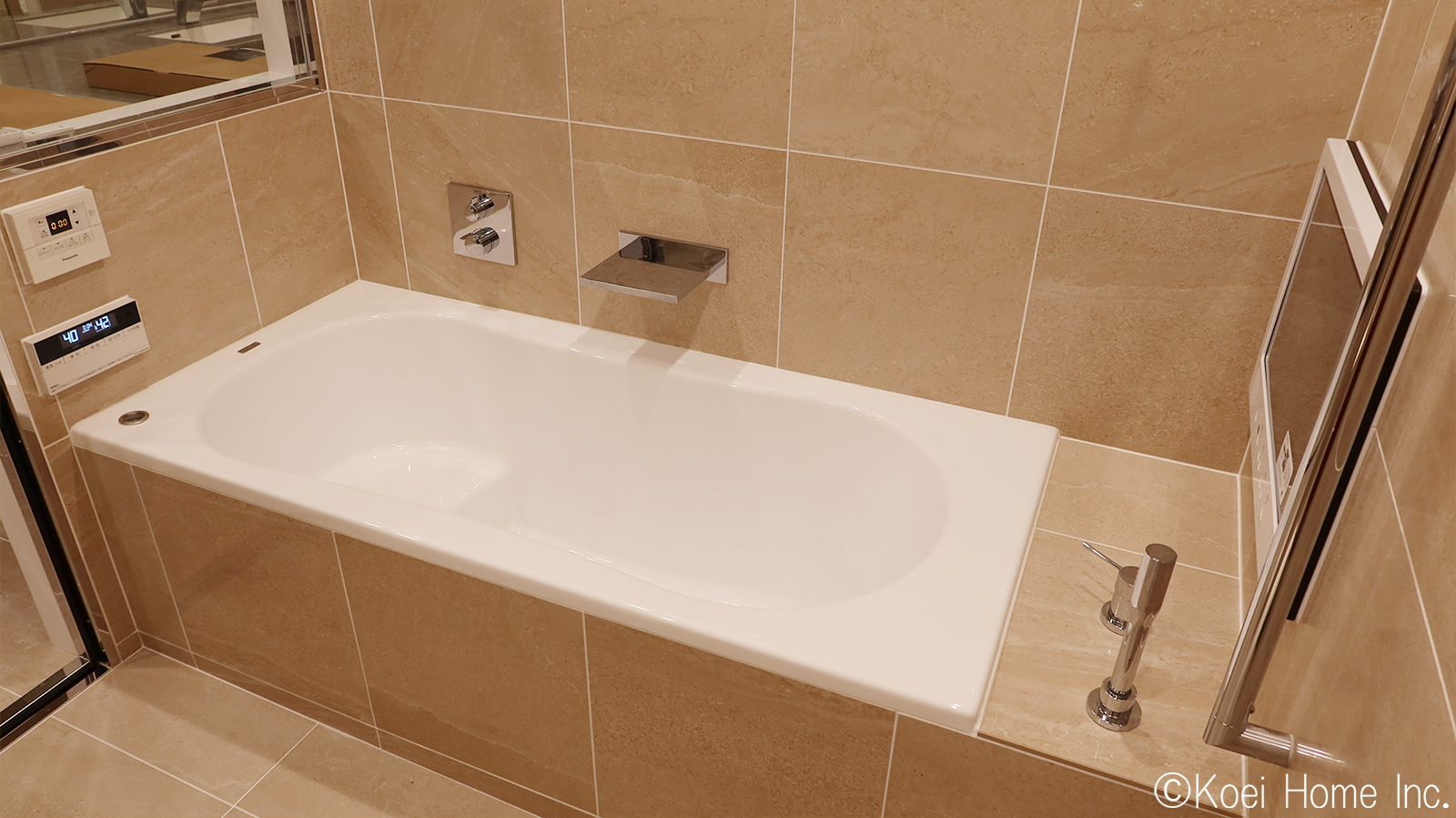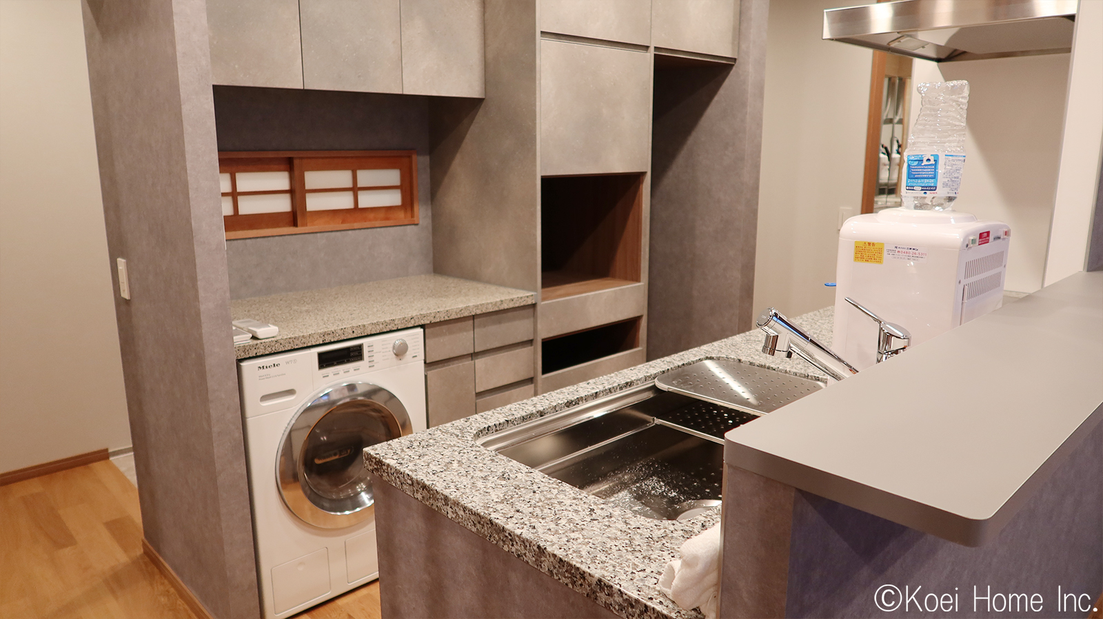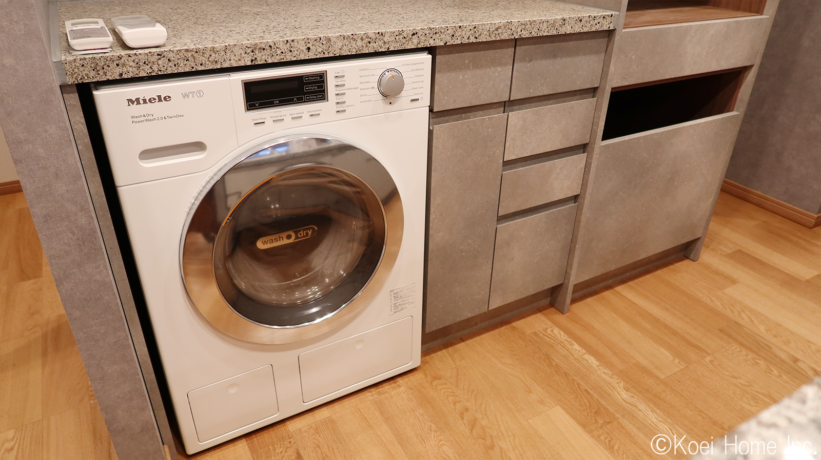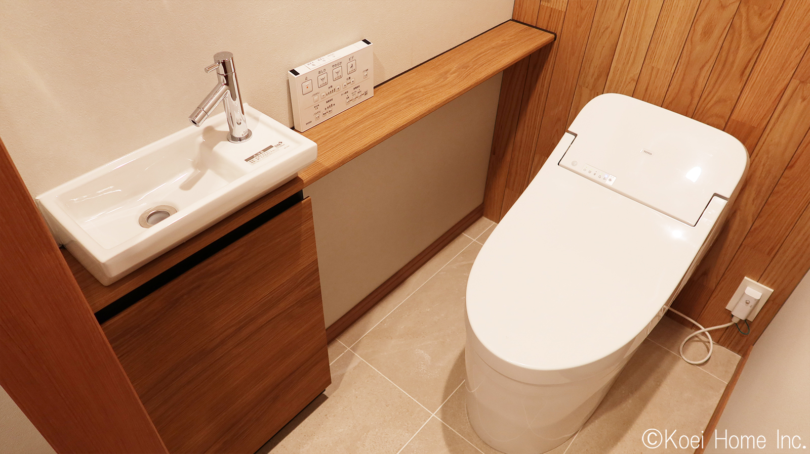 約70㎡のマンションを、海外で暮らすような“ホテルライク”に全面リノベ。もとの3LDKは洋室の壁を取り払い、約17畳の一体LDKへ。浴室はニッコー〈バンクチュール〉のオーダーシステムで約2倍に拡張し、シャワーブースを2基備えた特別なバス空間に更新。キッチンは既存を活かし扉色を貼替、背面カップボードに海外製洗濯乾燥機を組込み、静音家電で家事のストレスを軽減。突き板パネルや木目天井で奥行きを強調し、3LDK→1LDK+Sへ間取り最適化。玄関と廊下は遮りを減らして明るく、洋室にいても家族のつながりを感じられる構成に。突き板は背面から天井へ連続させ、空間をより広く高く見せています。