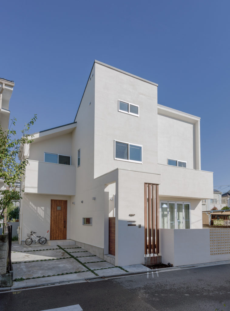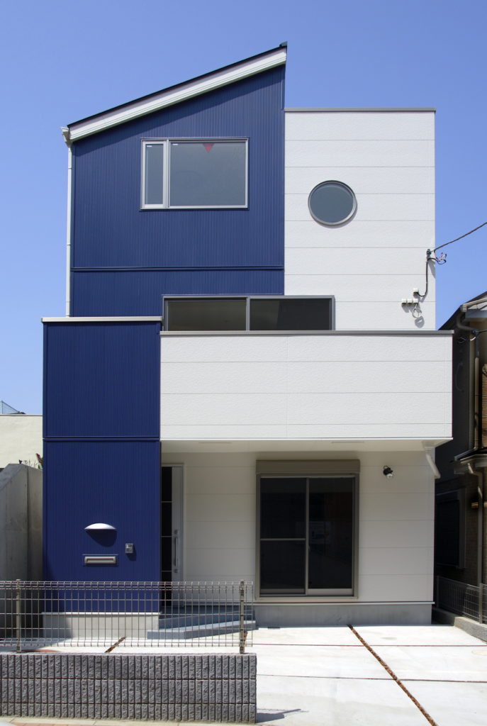 マリンブルーとホワイトの外観に丸窓をあしらい、海を感じる3階建て+屋上の住まい。分譲地条件に合わせて居室を正面側に計画し、2階LDKの中心には五角形のバルコニーを...