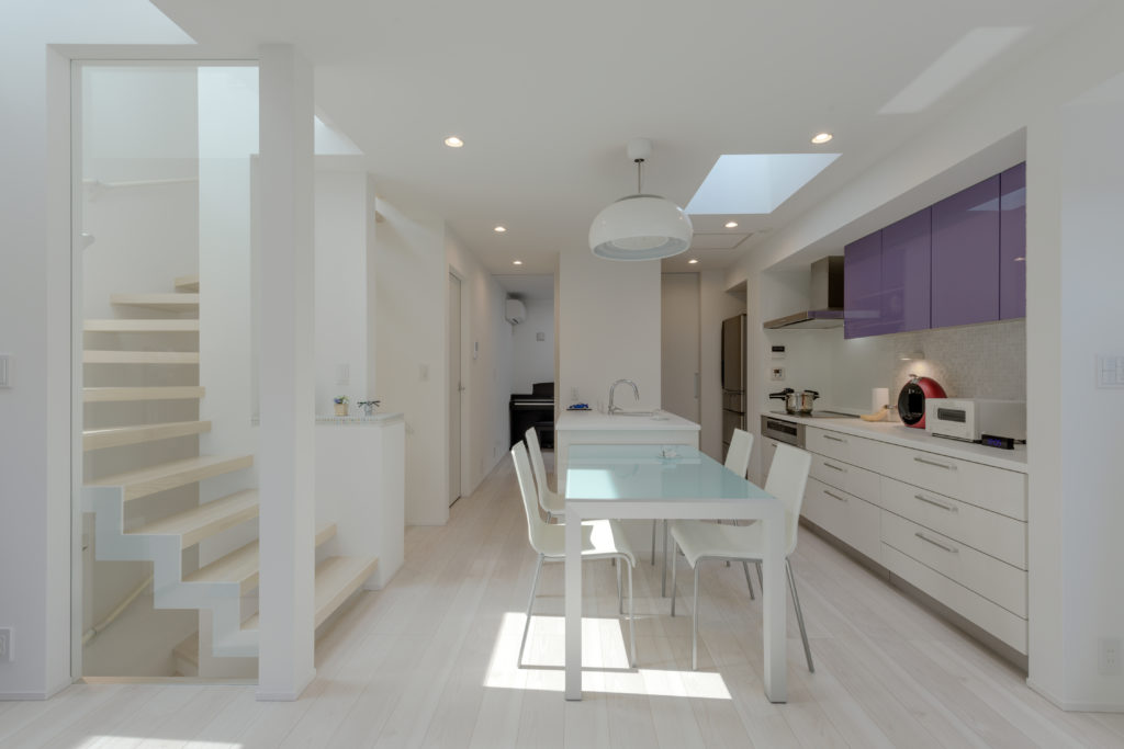 狭小ゆえ家の芯に光が届きにくい敷地条件を読み解き、思い切ってキッチンを“家の真ん中”へ。天窓の自然光がワークトップを柔らかく照らし、正面の室内窓は抜けのある階... -