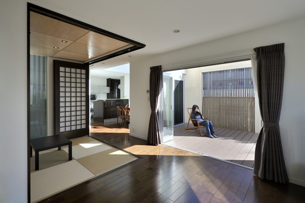 和モダンの外観に、むき出しの太い梁と磨りガラスが呼応する“古民家の懐”。勾配天井のLDKは、階段正面のベランダドアから1階まで光を落とし、奥行きと明るさを両立しま...