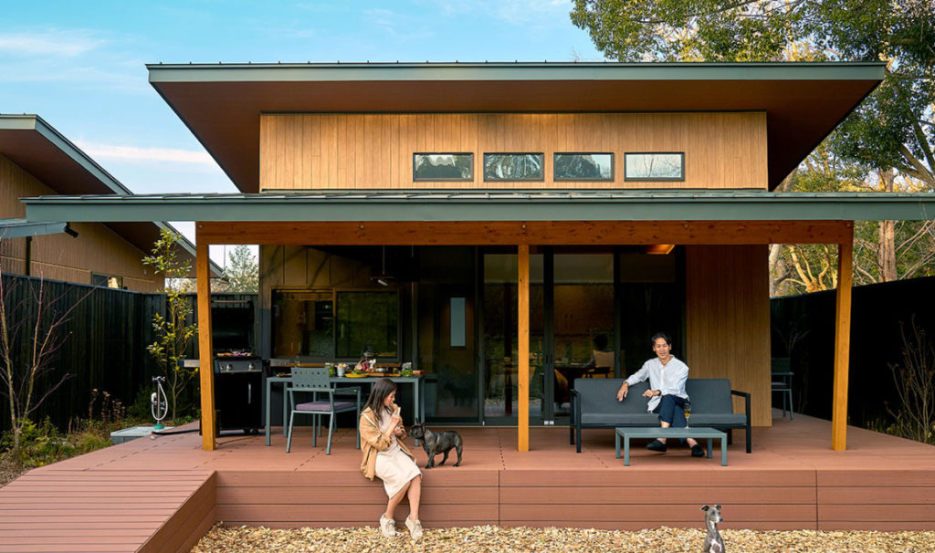 天井のフラットな水平線とワイドスパンの開口で視線を森へ導き、床レベルとテラスを近接させて段差感を抑えています。深い庇と外周の水仕舞いで雨天時も半屋外の居場所が成立。軒下の陰影が夏季の直射を軽減し、冬は低い日射を取り込むパッシブな環境制御を意図しています。