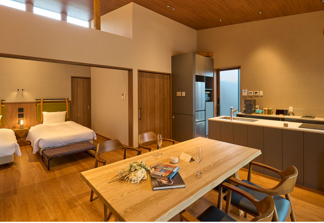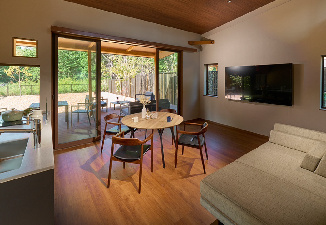 宿泊施設、ヴィラ、コテージ群、温浴・サウナ棟、レストラン、ワークスペース、地域交流施設