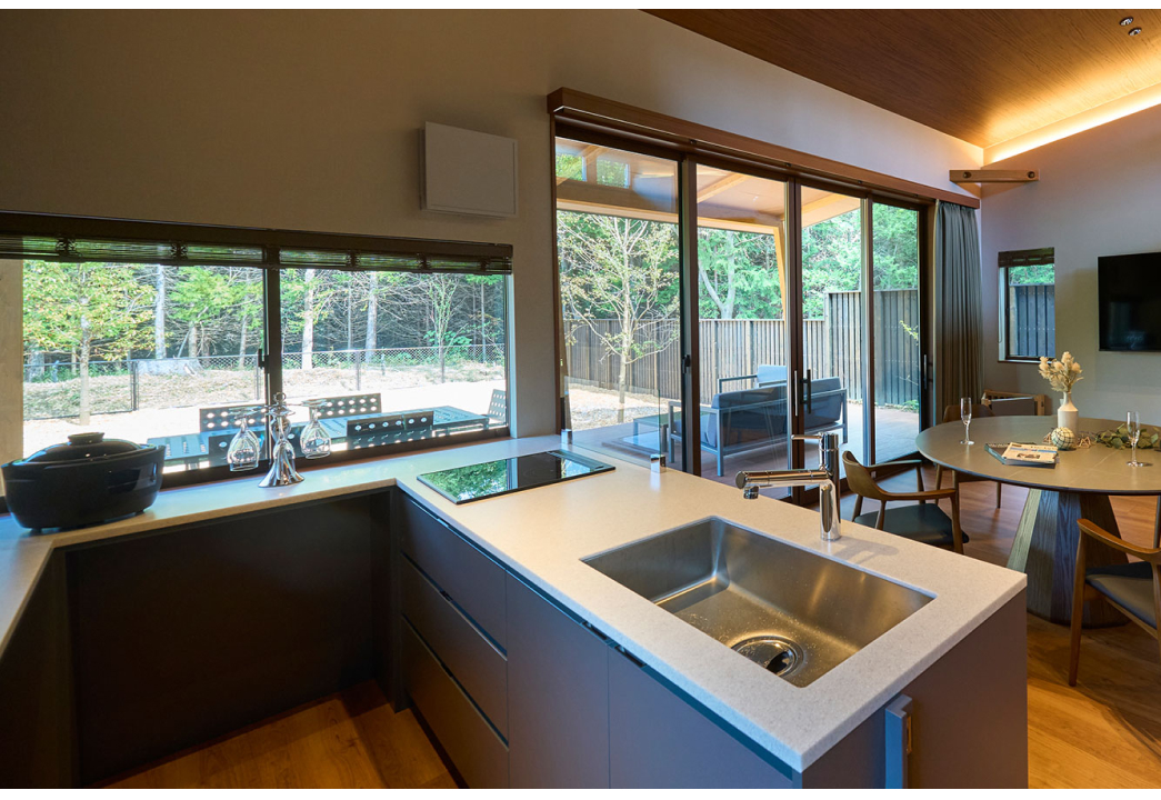 デッキ側の抜けに面してテーブルを配置し、二方向の視線軸を確保。キッチンとの距離は一歩で往復できるスパンに抑え、配膳・片付け動線を最短化。床材と窓台の取り合いは拭きやすい納まりとし、食事の場がそのまま“外”へ拡張できる、内外一体の滞在感を生みます。