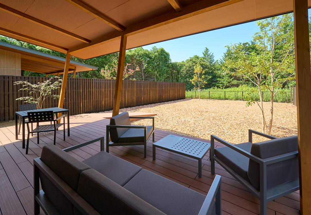 44㎡のテラスから135㎡以上の専用ランへ段差少なく連続し、ウッドチップ舗装で足腰の負荷と泥跳ねを軽減。足洗い場や水勾配の計画により、雨天後も利用しやすい外部回遊が保たれます。柵や植栽は視線の抜けを残しつつ境界性を確保し、屋内外で同時に過ごせる時間を設計しています。