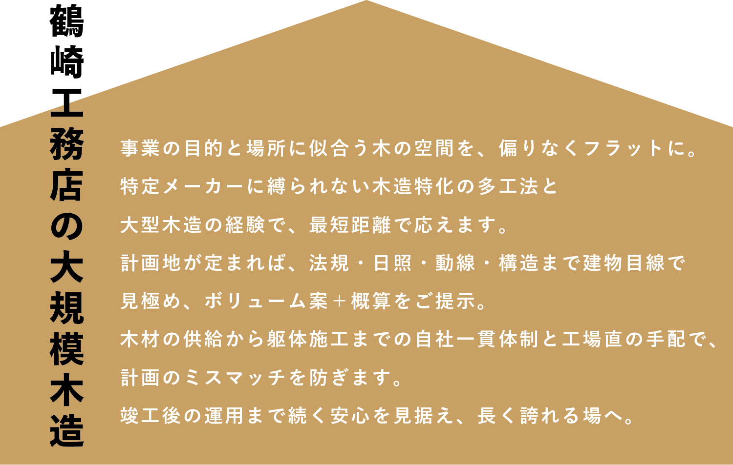 木材の供給から躯体施工まで自社一貫。工場直送の体制で、木造特化×多工法に対応。大型木造まで、上質と合理性を両立します。