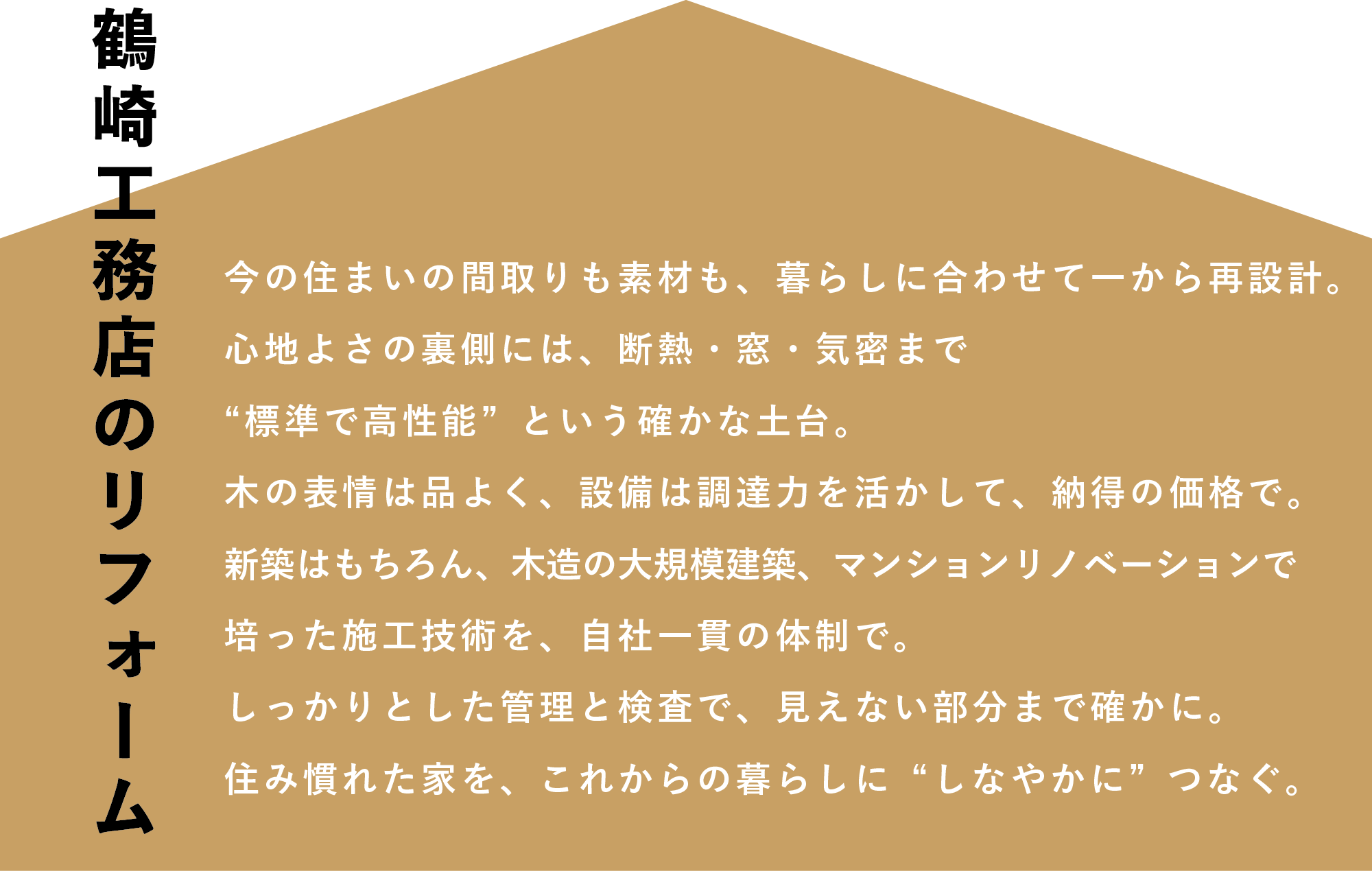 マンションはもちろん、木造戸建ても新築の知見で構造・断熱・動線まで“骨格”から最適化。