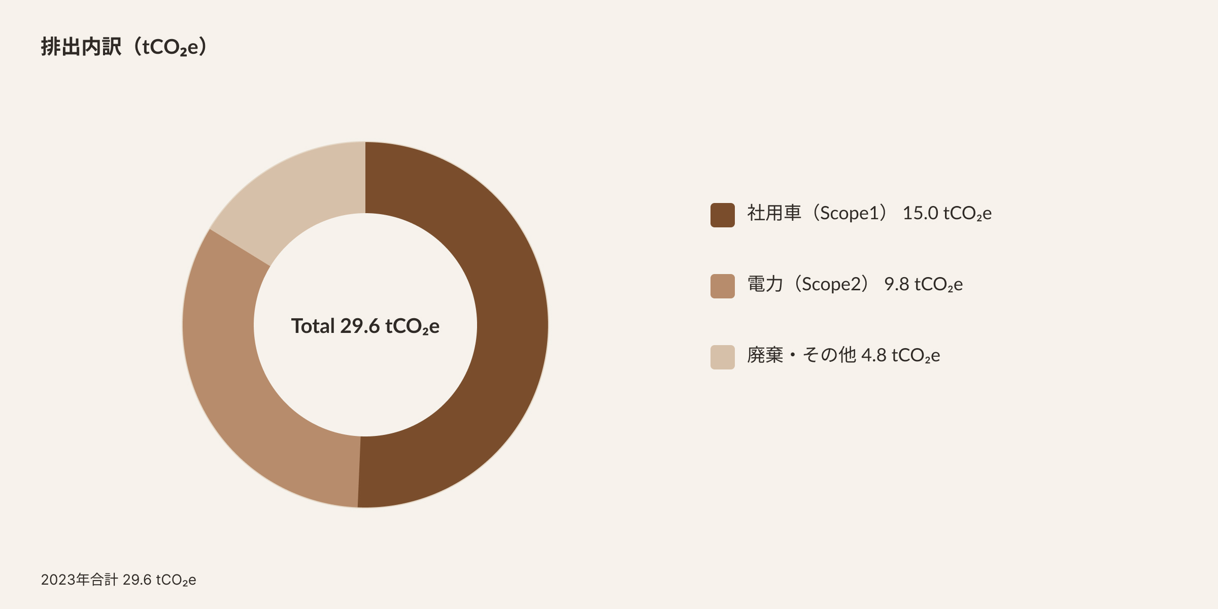 適正な移動台数・運用への見直しとEV化、事務所の省エネ改修・再エネ活用を段階的に進め、**「2023→2030で-50%」**を確実に。日々の業務フローを保ちながら、実効性のある削減策で前進します。